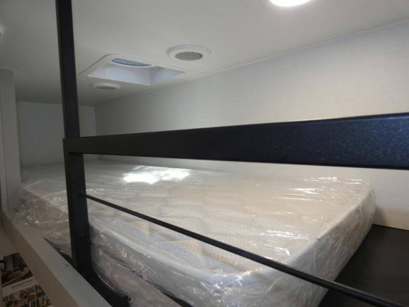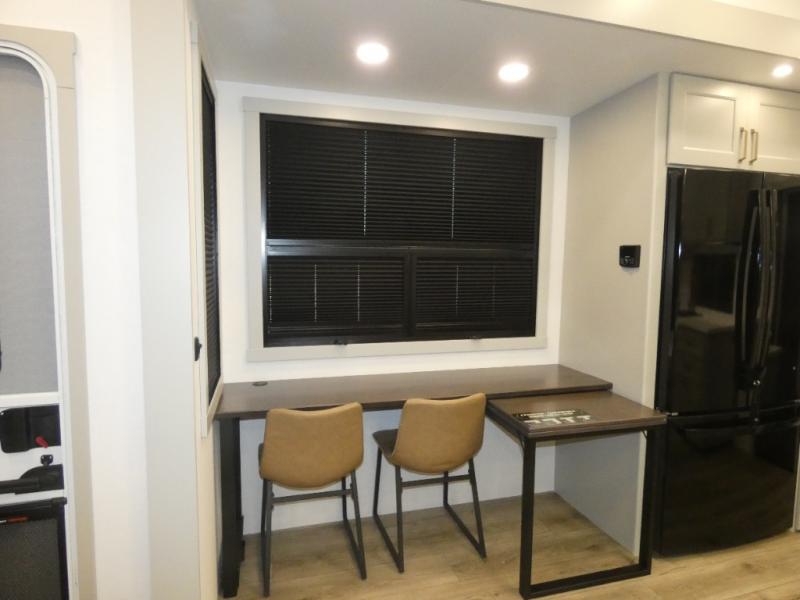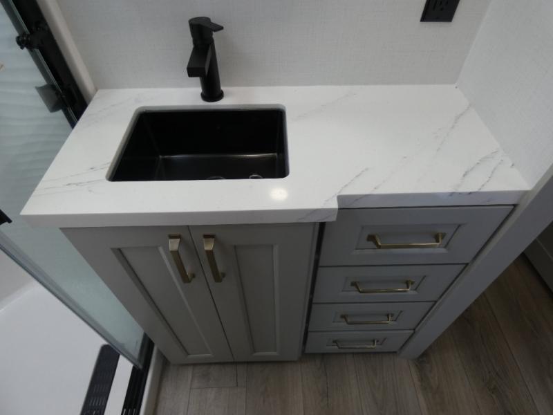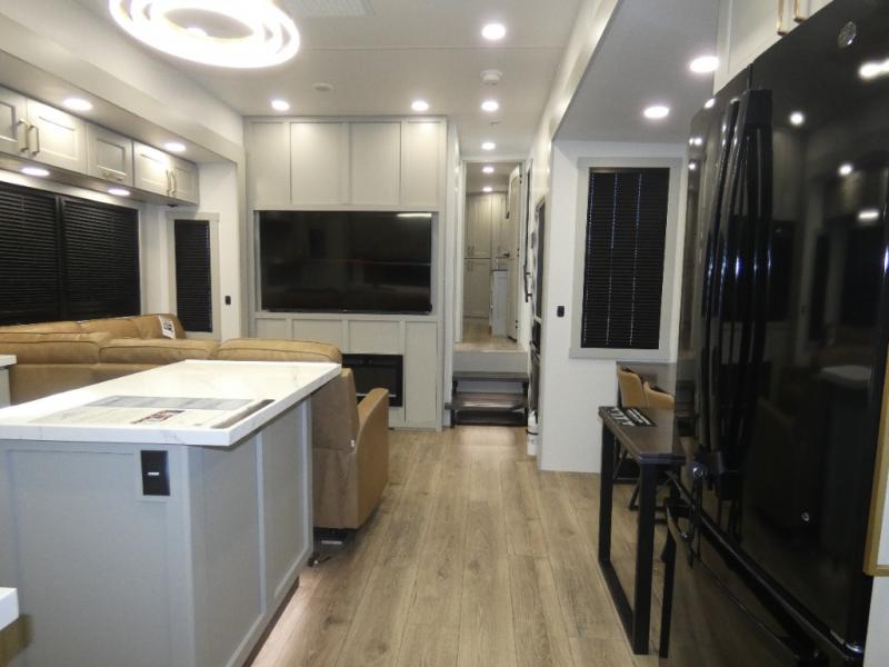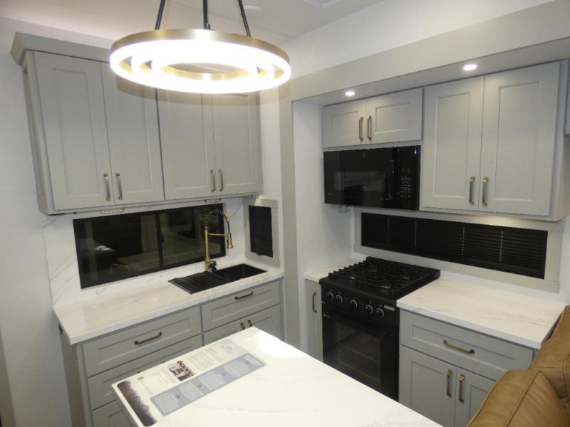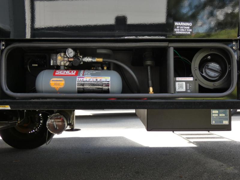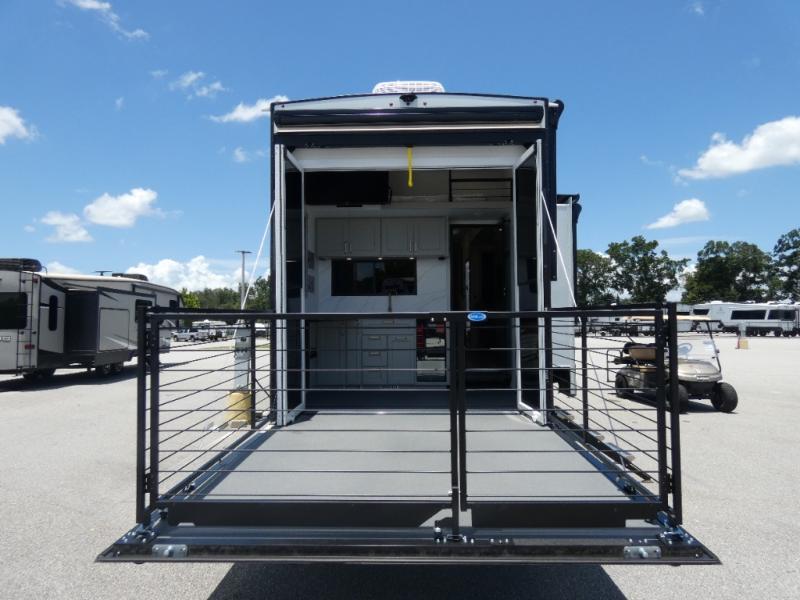 You can't imagine how much this toy hauler has to offer! The garage/outdoor kitchen/office space will allow you to utilize the garage how you need it, plus there is an adjustable tie-down system, as well as a loft for storage and a twin bed to sleep more campers! The garage patio with a 1,500 lb. capacity is another feature you are sure to love, especially with its own awning to keep you protected from the elements. Head to the kitchen to prepare meals with a 24" GE oven with a four burner range, a GE microwave with an air fryer, plus a spacious GE Energy Star 19 cu. ft. refrigerator. The island with two stools will let others visit with you while you cook, and there are even dog bowls to easily feed Frodo. You'll find the convertible dining table/L-desk will be accommodating since it can be use to dine at, and to get some work done. You may just find yourselves spending most of your time on the U-sofa in front of the entertainment center with a TV, fireplace and storage. A full bath is up front by the bedroom, and here you'll find a 30" x 43" shower and and pull-out linen storage with a trash bin to keep towels ready to use. After a day outdoors you'll love nothing more than coming back to your own bedroom with a bed slide out, TV, a walk-in closet, and many more storage spaces. And we haven't even touched on the exterior features, like the 3-way pass-through storage, three power awnings, an air compressor to fill up tires, and the list goes on and on! This is a pre-production preview, all features and layout placement subject to change.