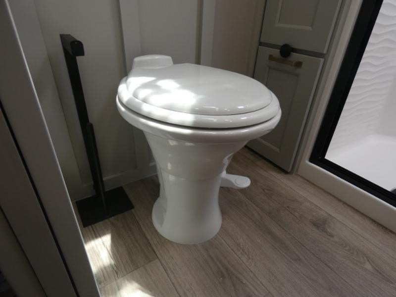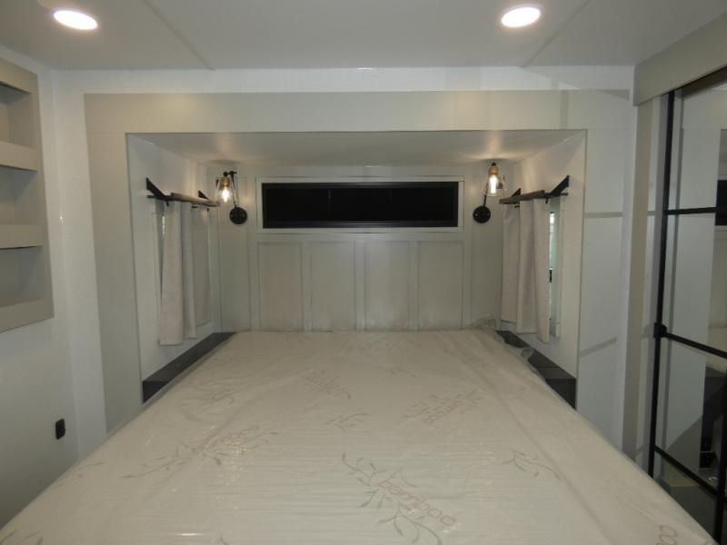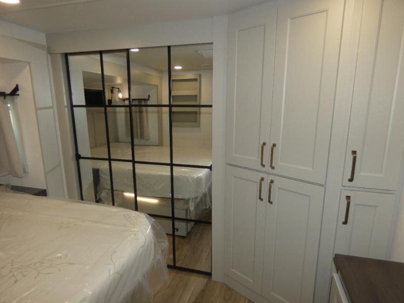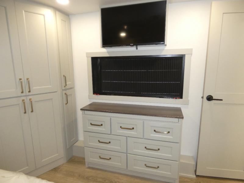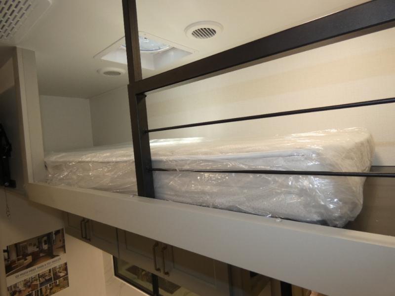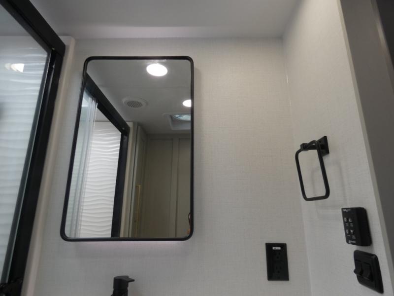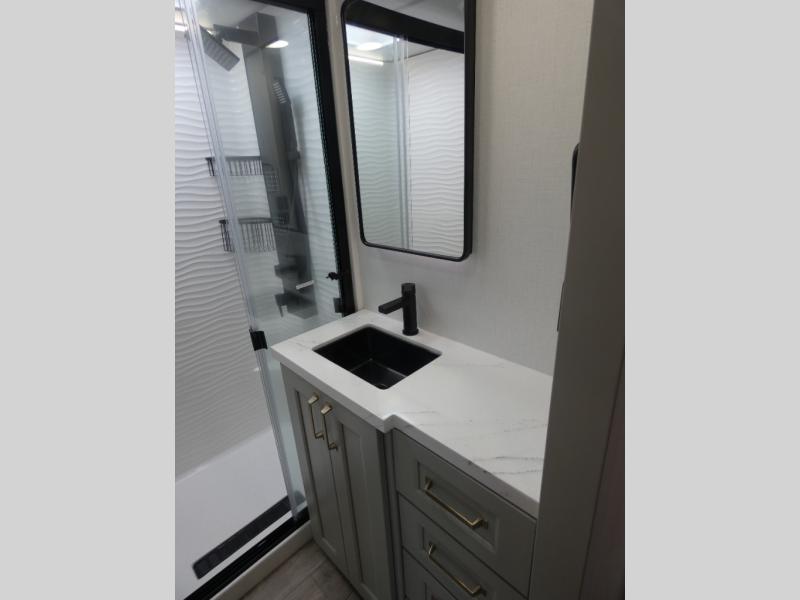 You can't imagine how much this toy hauler has to offer! The garage/outdoor kitchen/office space will allow you to utilize the garage how you need it, plus there is an adjustable tie-down system, as well as a loft for storage and a twin bed to sleep more campers! The garage patio with a 1,500 lb. capacity is another feature you are sure to love, especially with its own awning to keep you protected from the elements. Head to the kitchen to prepare meals with a 24" GE oven with a four burner range, a GE microwave with an air fryer, plus a spacious GE Energy Star 19 cu. ft. refrigerator. The island with two stools will let others visit with you while you cook, and there are even dog bowls to easily feed Frodo. You'll find the convertible dining table/L-desk will be accommodating since it can be use to dine at, and to get some work done. You may just find yourselves spending most of your time on the U-sofa in front of the entertainment center with a TV, fireplace and storage. A full bath is up front by the bedroom, and here you'll find a 30" x 43" shower and and pull-out linen storage with a trash bin to keep towels ready to use. After a day outdoors you'll love nothing more than coming back to your own bedroom with a bed slide out, TV, a walk-in closet, and many more storage spaces. And we haven't even touched on the exterior features, like the 3-way pass-through storage, three power awnings, an air compressor to fill up tires, and the list goes on and on! This is a pre-production preview, all features and layout placement subject to change.