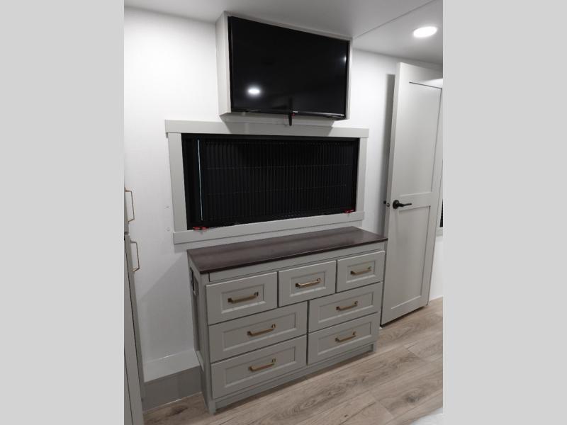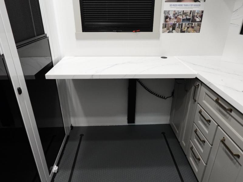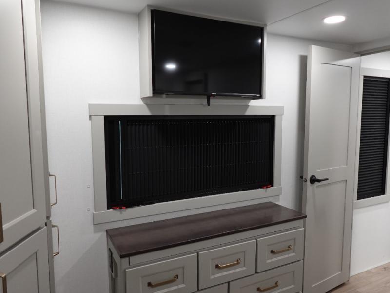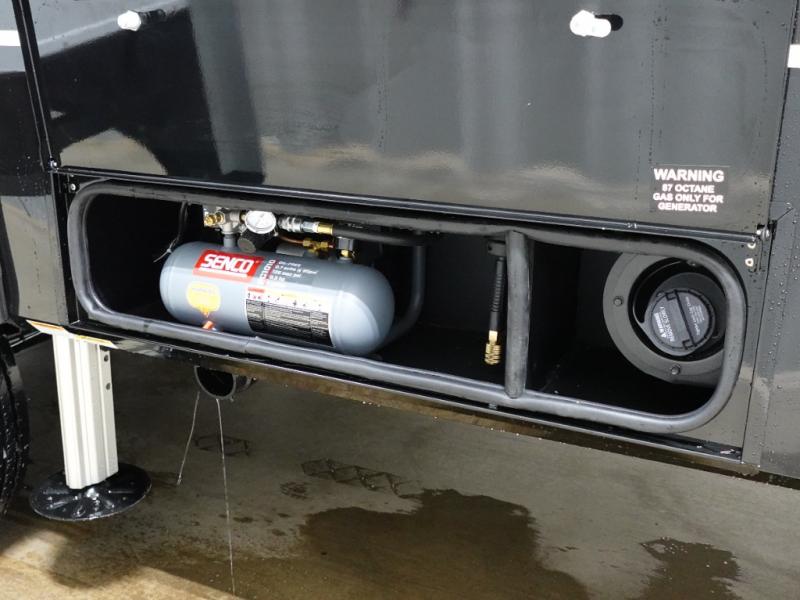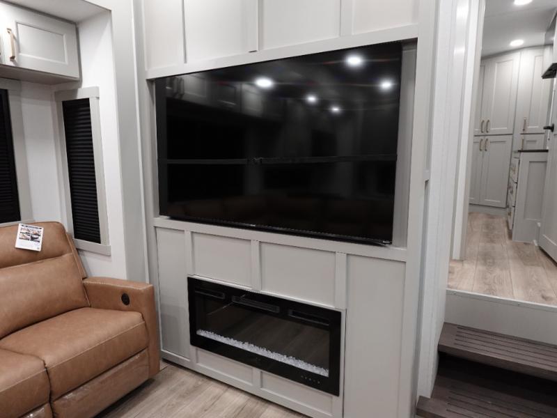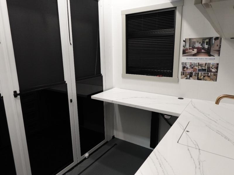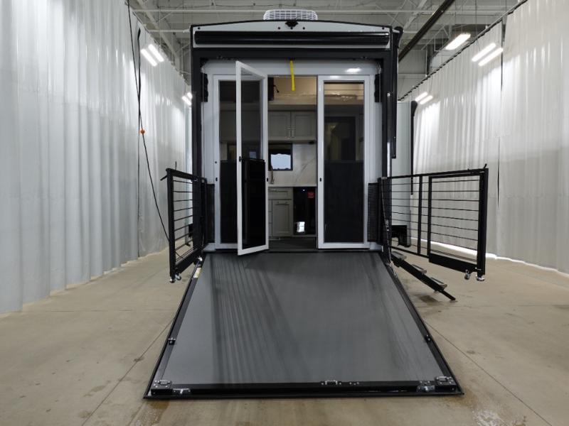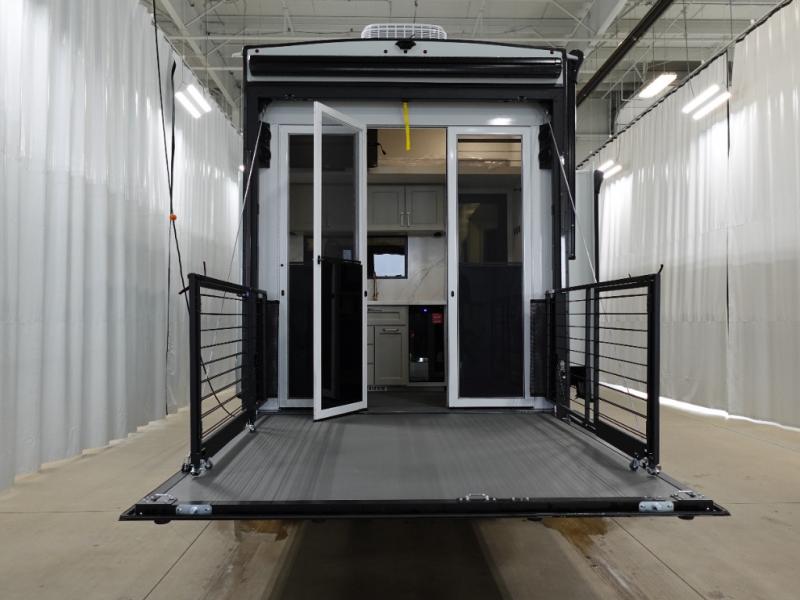 You can't imagine how much this toy hauler has to offer! The garage/outdoor kitchen/office space will allow you to utilize the garage how you need it, plus there is an adjustable tie-down system, as well as a loft for storage and a twin bed to sleep more campers! The garage patio with a 1,500 lb. capacity is another feature you are sure to love, especially with its own awning to keep you protected from the elements. Head to the kitchen to prepare meals with a 24" GE oven with a four burner range, a GE microwave with an air fryer, plus a spacious GE Energy Star 19 cu. ft. refrigerator. The island with two stools will let others visit with you while you cook, and there are even dog bowls to easily feed Frodo. You'll find the convertible dining table/L-desk will be accommodating since it can be use to dine at, and to get some work done. You may just find yourselves spending most of your time on the L-sofa in front of the entertainment center with a TV, fireplace and storage. A full bath is up front by the bedroom, and here you'll find a 30" x 42" shower and and pull-out linen storage with a trash bin to keep towels ready to use. After a day outdoors you'll love nothing more than coming back to your own bedroom with a king bed slide out, TV, a walk-in closet, and many more storage spaces. And we haven't even touched on the exterior features, like the 3-way pass-through storage, three power awnings, an air compressor to fill up tires, and the list goes on and on! This is a pre-production preview, all features and layout placement subject to change.