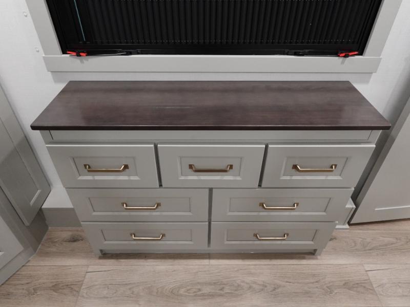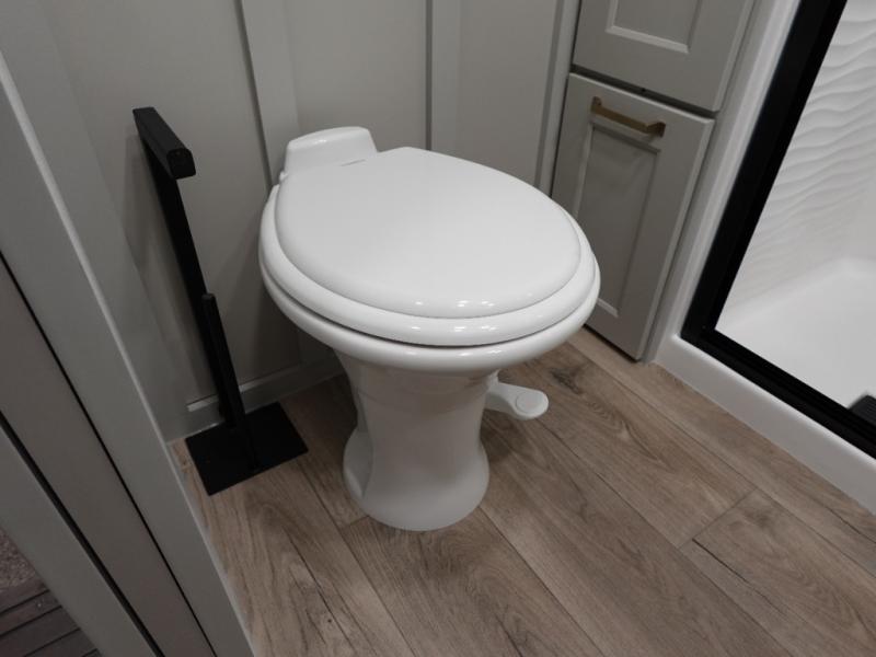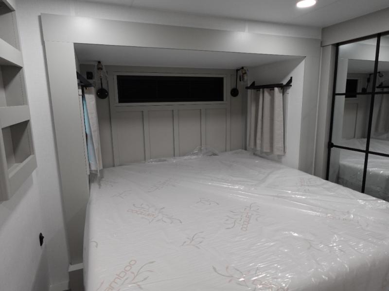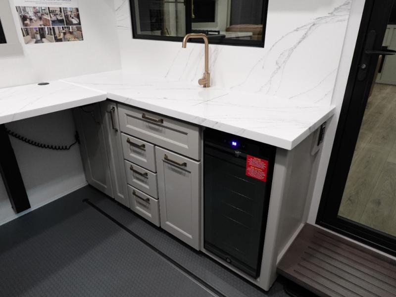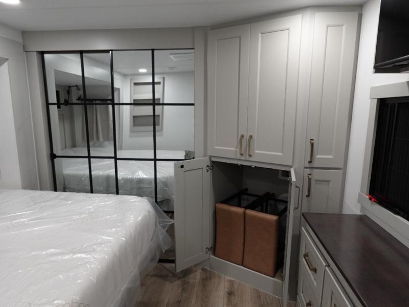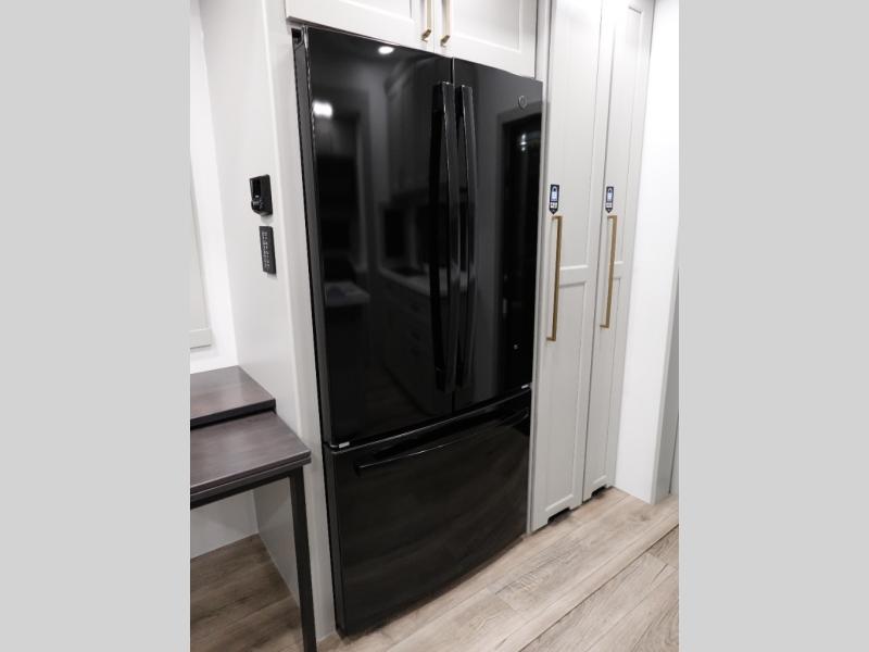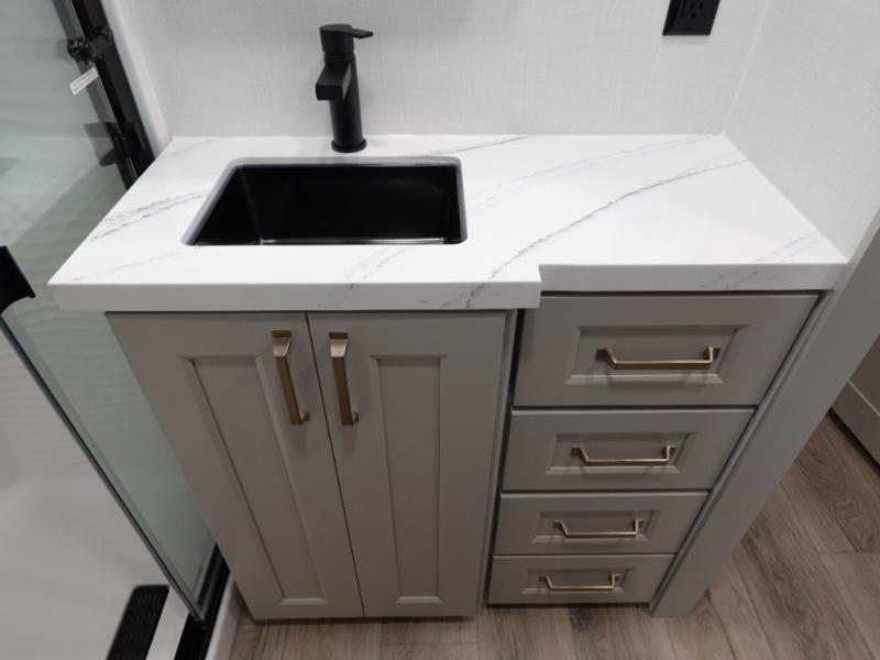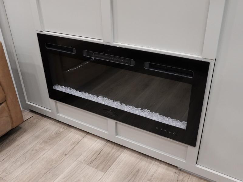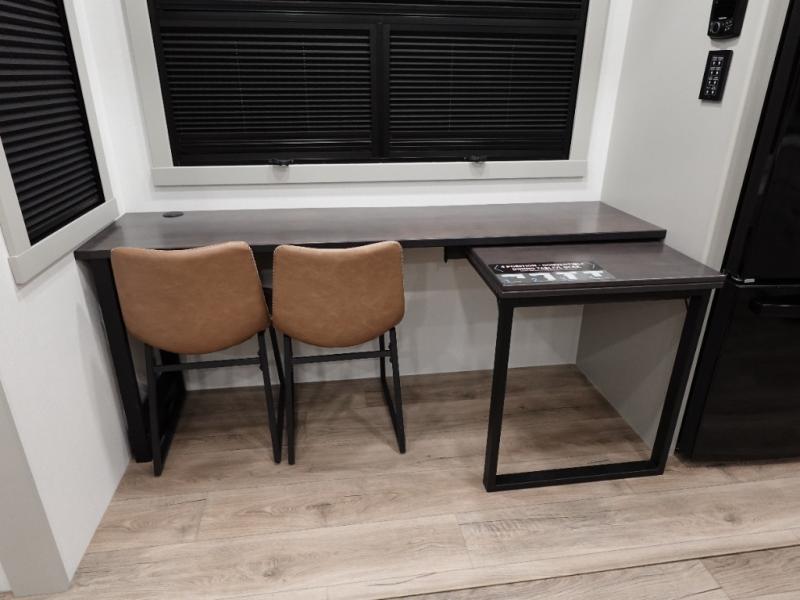 You can't imagine how much this toy hauler has to offer! The garage/outdoor kitchen/office space will allow you to utilize the garage how you need it, plus there is an adjustable tie-down system, as well as a loft for storage and a twin bed to sleep more campers! The garage patio with a 1,500 lb. capacity is another feature you are sure to love, especially with its own awning to keep you protected from the elements. Head to the kitchen to prepare meals with a 24" GE oven with a four burner range, a GE microwave with an air fryer, plus a spacious GE Energy Star 19 cu. ft. refrigerator. The island with two stools will let others visit with you while you cook, and there are even dog bowls to easily feed Frodo. You'll find the convertible dining table/L-desk will be accommodating since it can be use to dine at, and to get some work done. You may just find yourselves spending most of your time on the L-sofa in front of the entertainment center with a TV, fireplace and storage. A full bath is up front by the bedroom, and here you'll find a 30" x 42" shower and and pull-out linen storage with a trash bin to keep towels ready to use. After a day outdoors you'll love nothing more than coming back to your own bedroom with a king bed slide out, TV, a walk-in closet, and many more storage spaces. And we haven't even touched on the exterior features, like the 3-way pass-through storage, three power awnings, an air compressor to fill up tires, and the list goes on and on! This is a pre-production preview, all features and layout placement subject to change.