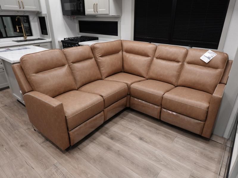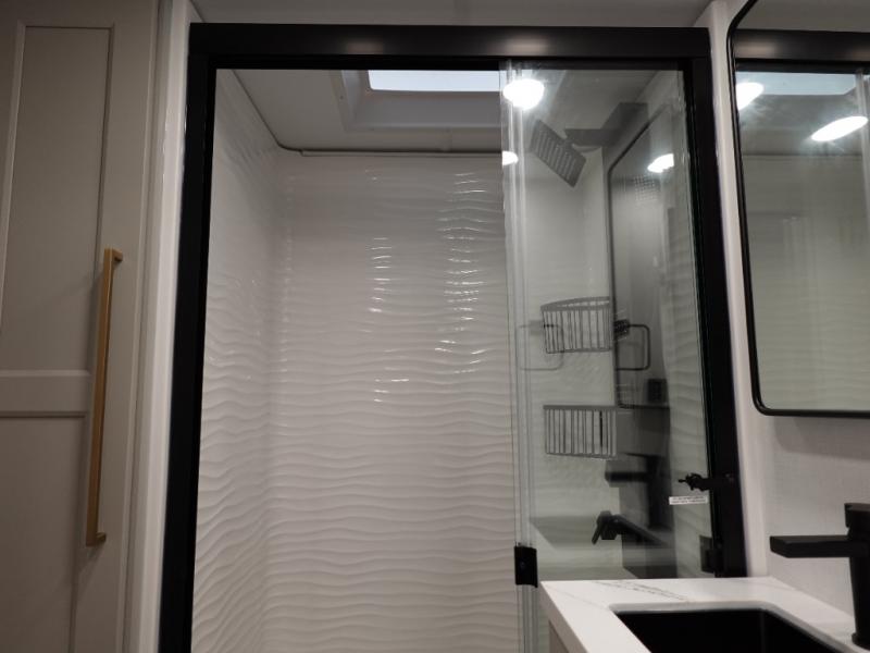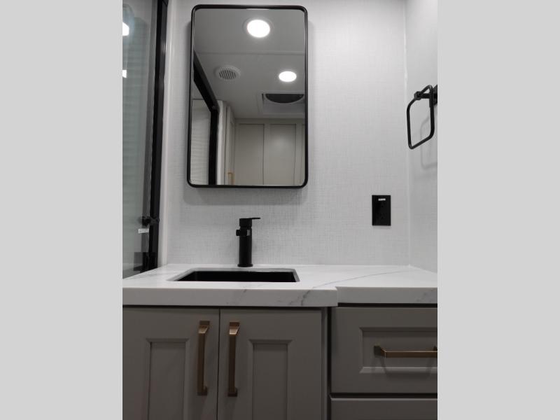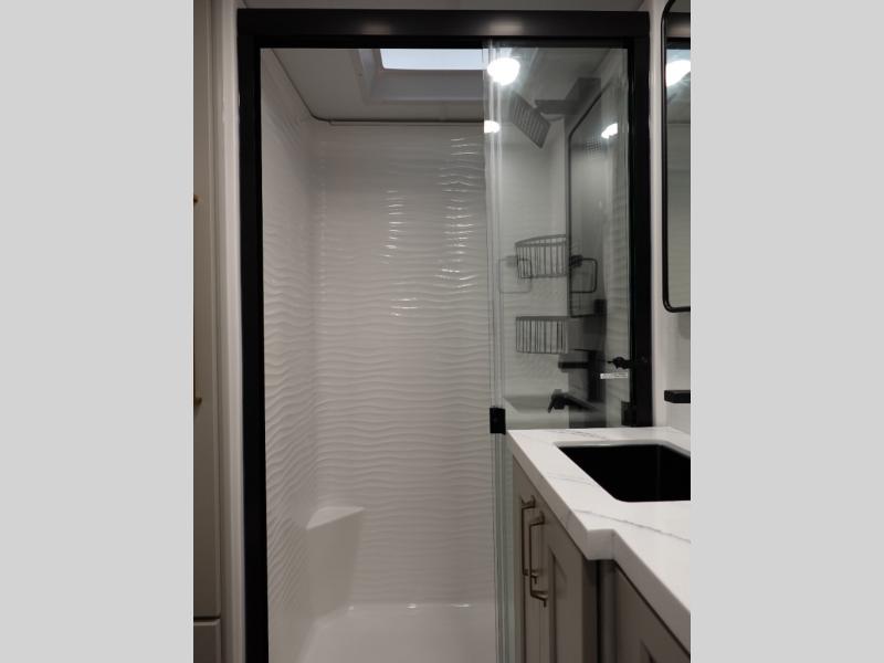 With any Model G toy hauler fifth wheel by Brinkley you will enjoy luxurious amenities, tons of storage space, and innovative features that have been developed and tested in the real world. Durable construction includes an industry leading PDI process, an industry best insulation package, and reinforced and walkable slide roofs. Some of the exterior features you'll find are a 3-way pass-through with a multi-functional flip-up bulkhead wall, under I-beam storage, a MAX-Vision reverse lighting system, and a low-maintenance roof to name a few. A Rockford Fosgate audio system comes standard, along with a Full app-based coach control system (iOS & Android) that lets you control your fifth wheel's functions right from your mobile device. You will find the solar system with a designated storage area to be ultra convenient, plus there is a FlexPower 5500 with a dual fuel inverter generator for all your power needs. Head inside to find a residential interior with Brinkley's CraftSense wood trim construction, floating entrance steps, integrated window screens and insulated blackout blinds, and residential solid surface countertops plus backsplash. You will also enjoy the neon shower lighting and recessed medicine cabinets in the bath, plus motion activated LED bed lights and dual bedside outlets in the bedroom. Choose a Model G toy hauler fifth wheel to experience all the luxury it has to offer!