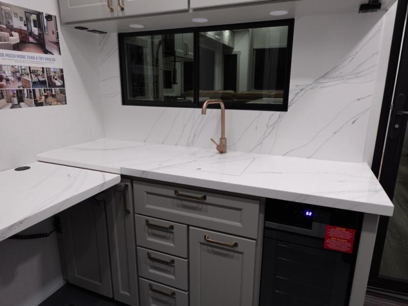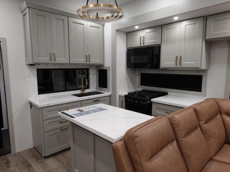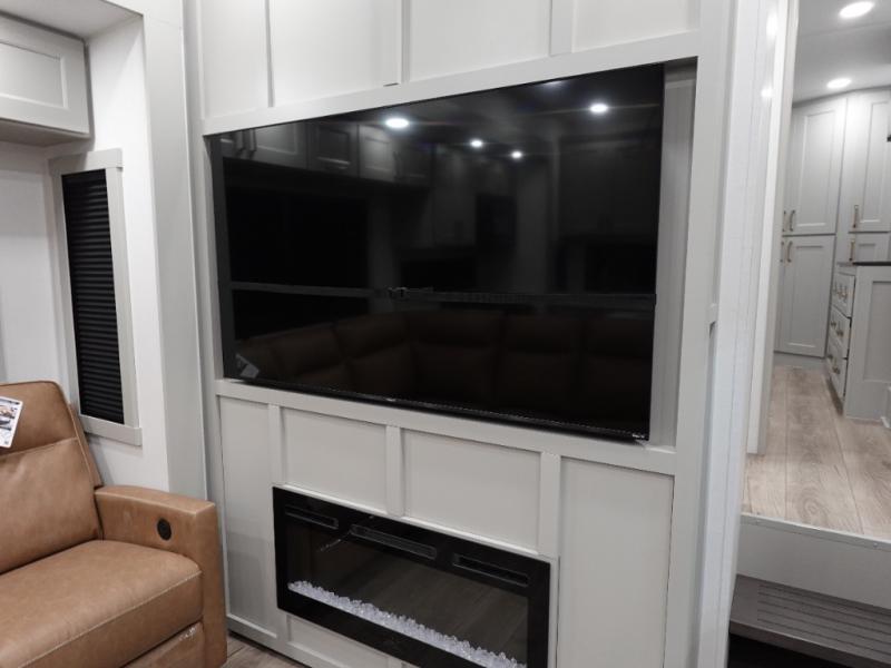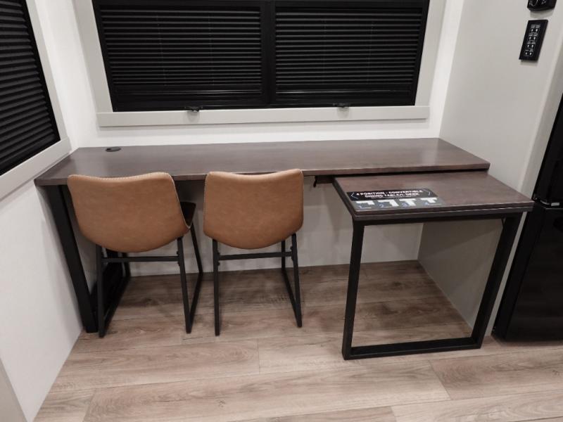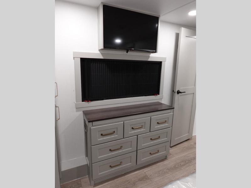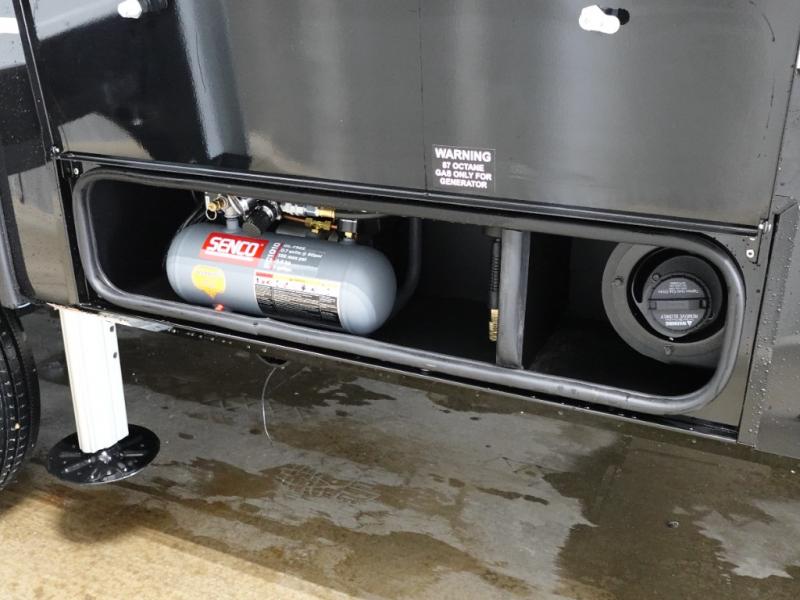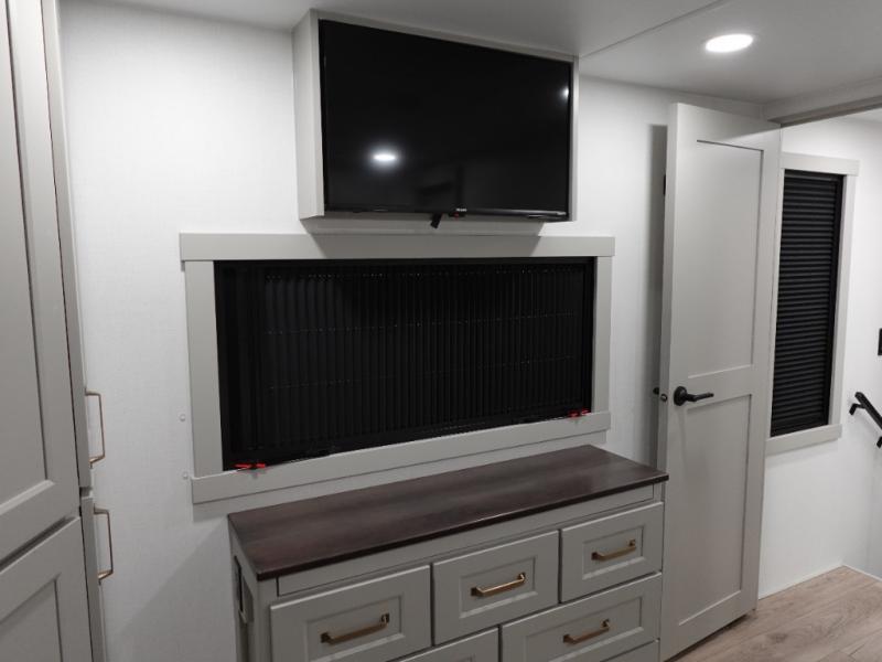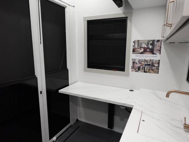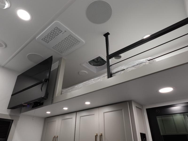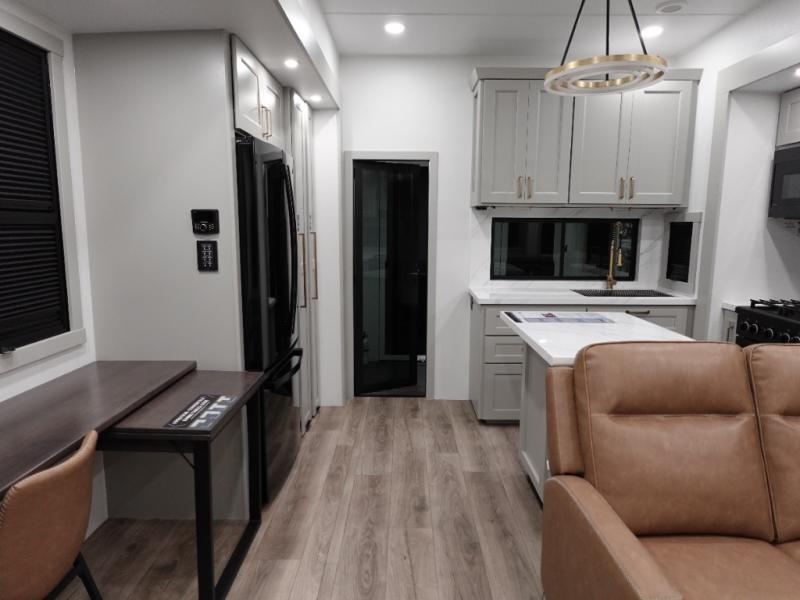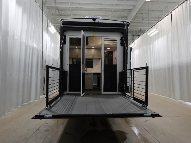 You can't imagine how much this toy hauler has to offer! The garage/outdoor kitchen/office space will allow you to utilize the garage how you need it, plus there is an adjustable tie-down system, as well as a loft for storage and a twin bed to sleep more campers! The garage patio with a 1,500 lb. capacity is another feature you are sure to love, especially with its own awning to keep you protected from the elements. Head to the kitchen to prepare meals with a 24" GE oven with a four burner range, a GE microwave with an air fryer, plus a spacious GE Energy Star 19 cu. ft. refrigerator. The island with two stools will let others visit with you while you cook, and there are even dog bowls to easily feed Frodo. You'll find the convertible dining table/L-desk will be accommodating since it can be use to dine at, and to get some work done. You may just find yourselves spending most of your time on the L-sofa in front of the entertainment center with a TV, fireplace and storage. A full bath is up front by the bedroom, and here you'll find a 30" x 42" shower and and pull-out linen storage with a trash bin to keep towels ready to use. After a day outdoors you'll love nothing more than coming back to your own bedroom with a king bed slide out, TV, a walk-in closet, and many more storage spaces. And we haven't even touched on the exterior features, like the 3-way pass-through storage, three power awnings, an air compressor to fill up tires, and the list goes on and on! This is a pre-production preview, all features and layout placement subject to change.