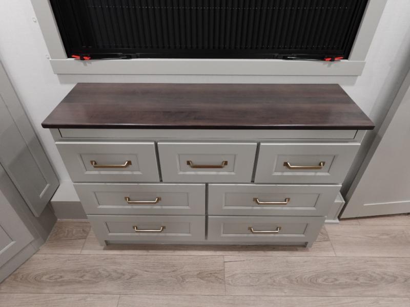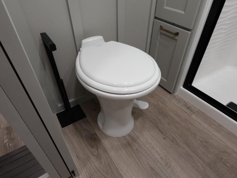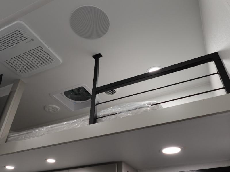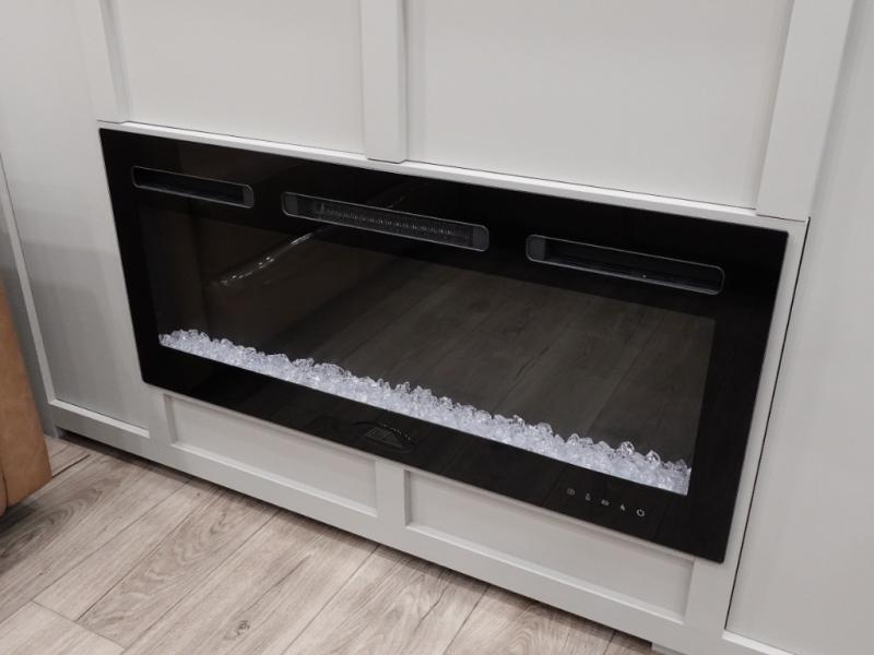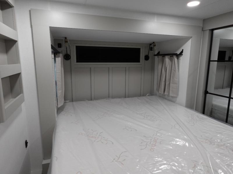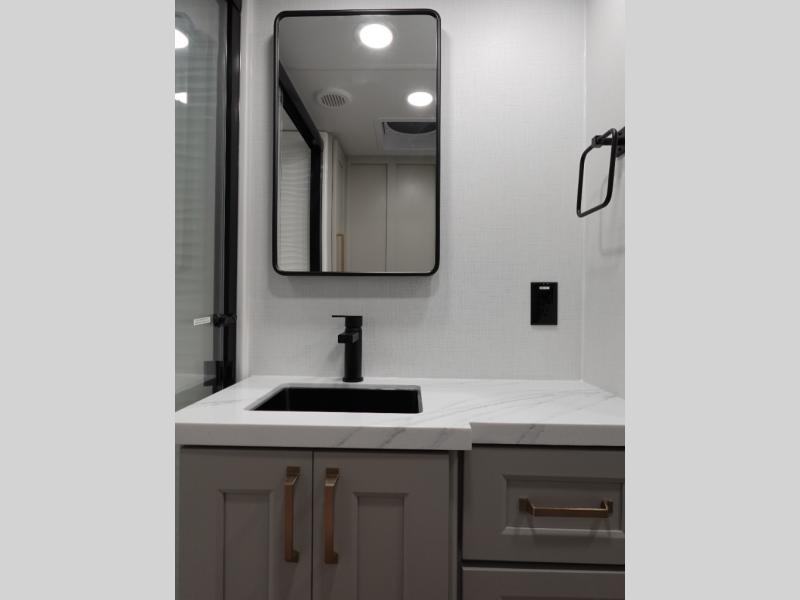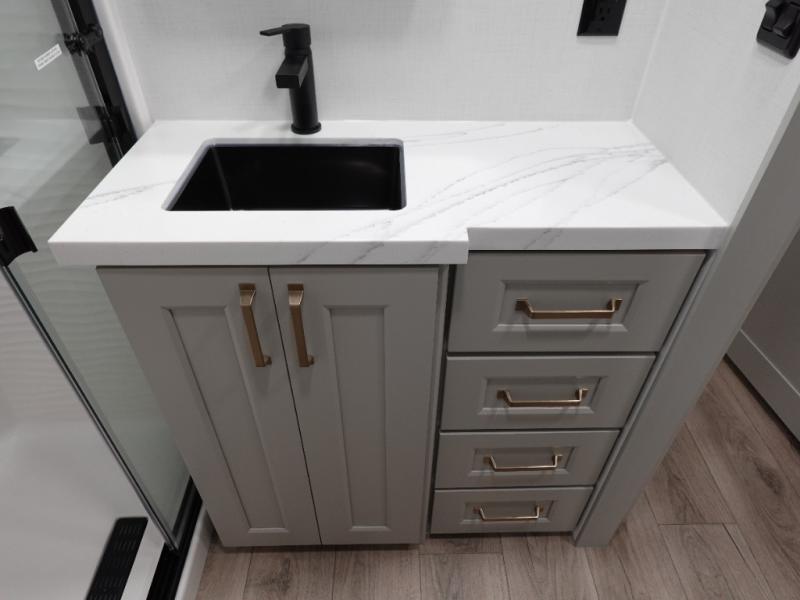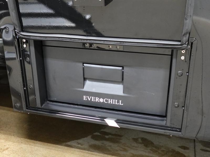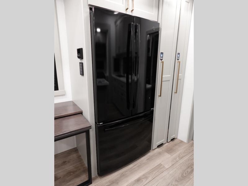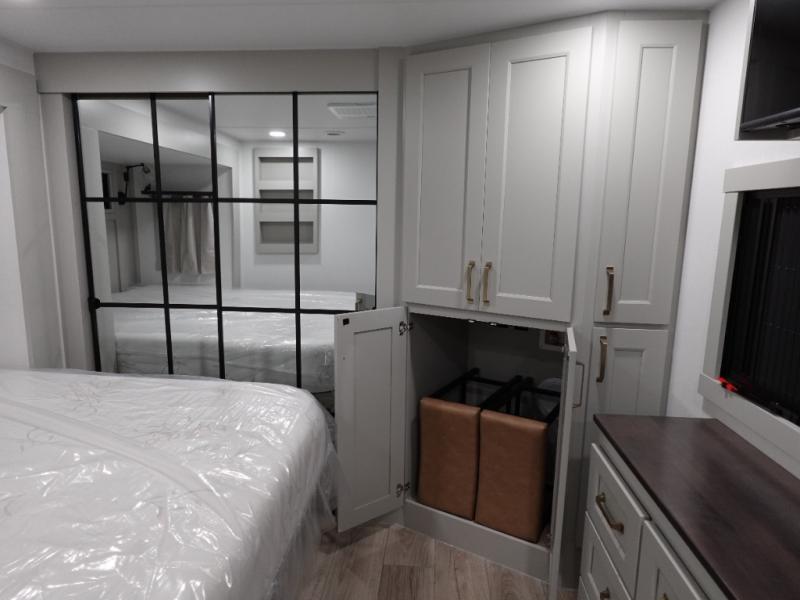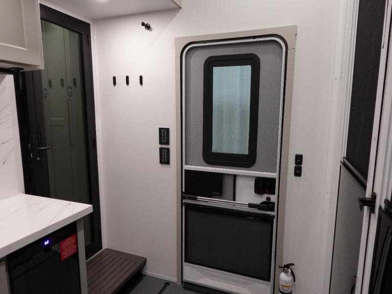You can't imagine how much this toy hauler has to offer! The garage/outdoor kitchen/office space will allow you to utilize the garage how you need it, plus there is an adjustable tie-down system, as well as a loft for storage and a twin bed to sleep more campers! The garage patio with a 1,500 lb. capacity is another feature you are sure to love, especially with its own awning to keep you protected from the elements. Head to the kitchen to prepare meals with a 24" GE oven with a four burner range, a GE microwave with an air fryer, plus a spacious GE Energy Star 19 cu. ft. refrigerator. The island with two stools will let others visit with you while you cook, and there are even dog bowls to easily feed Frodo. You'll find the convertible dining table/L-desk will be accommodating since it can be use to dine at, and to get some work done. You may just find yourselves spending most of your time on the L-sofa in front of the entertainment center with a TV, fireplace and storage. A full bath is up front by the bedroom, and here you'll find a 30" x 42" shower and and pull-out linen storage with a trash bin to keep towels ready to use. After a day outdoors you'll love nothing more than coming back to your own bedroom with a king bed slide out, TV, a walk-in closet, and many more storage spaces. And we haven't even touched on the exterior features, like the 3-way pass-through storage, three power awnings, an air compressor to fill up tires, and the list goes on and on! This is a pre-production preview, all features and layout placement subject to change.