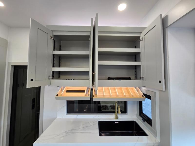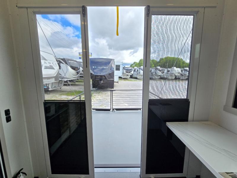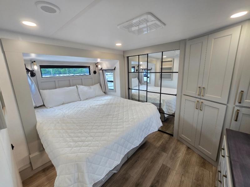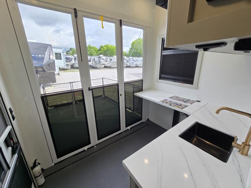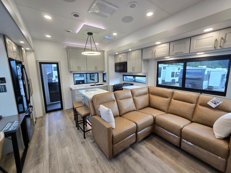 With any Model G toy hauler fifth wheel by Brinkley you will enjoy luxurious amenities, tons of storage space, and innovative features that have been developed and tested in the real world. Durable construction includes an industry leading PDI process, an industry best insulation package, and reinforced and walkable slide roofs. Some of the exterior features you'll find are a 3-way pass-through with a multi-functional flip-up bulkhead wall, under I-beam storage, a MAX-Vision reverse lighting system, and a low-maintenance roof to name a few. A Rockford Fosgate audio system comes standard, along with a Full app-based coach control system (iOS & Android) that lets you control your fifth wheel's functions right from your mobile device. You will find the solar system with a designated storage area to be ultra convenient, plus there is a FlexPower 5500 with a dual fuel inverter generator for all your power needs. Head inside to find a residential interior with Brinkley's CraftSense wood trim construction, floating entrance steps, integrated window screens and insulated blackout blinds, and residential solid surface countertops plus backsplash. You will also enjoy the neon shower lighting and recessed medicine cabinets in the bath, plus motion activated LED bed lights and dual bedside outlets in the bedroom. Choose a Model G toy hauler fifth wheel to experience all the luxury it has to offer!