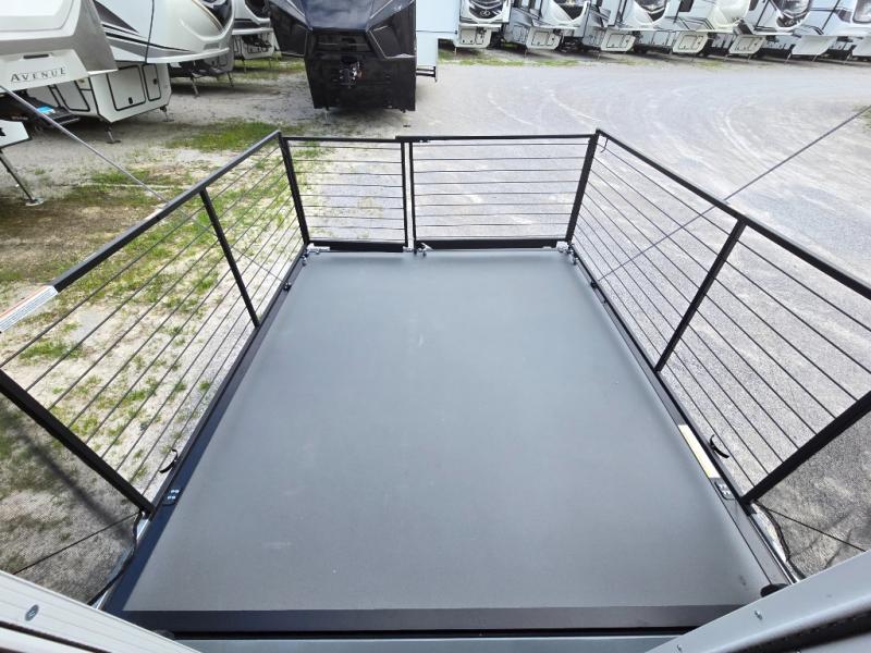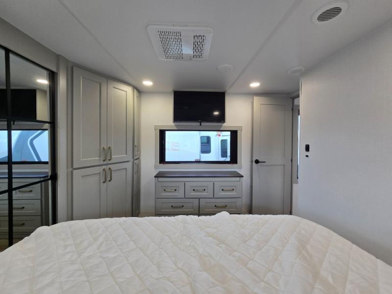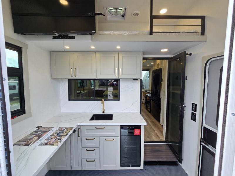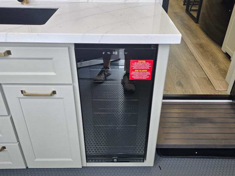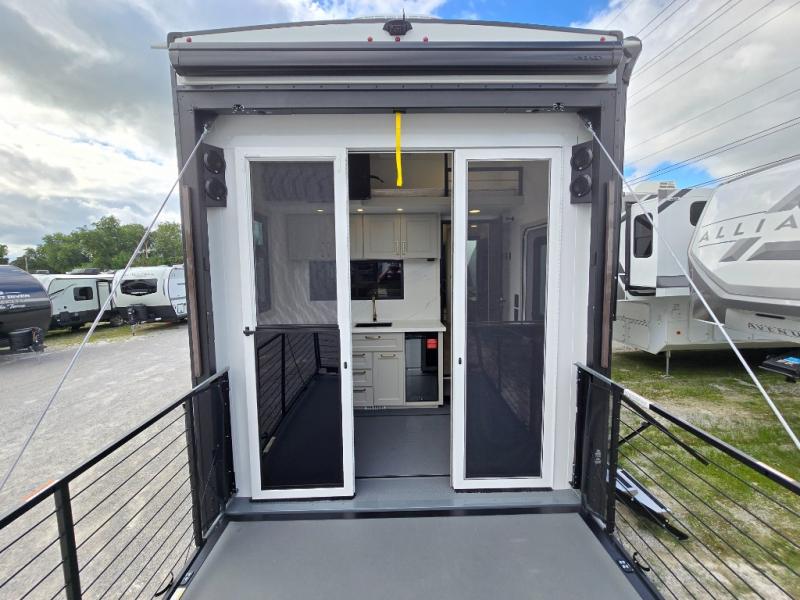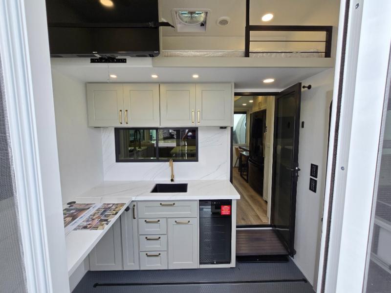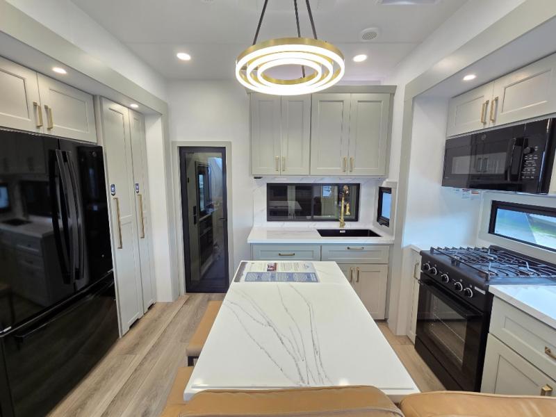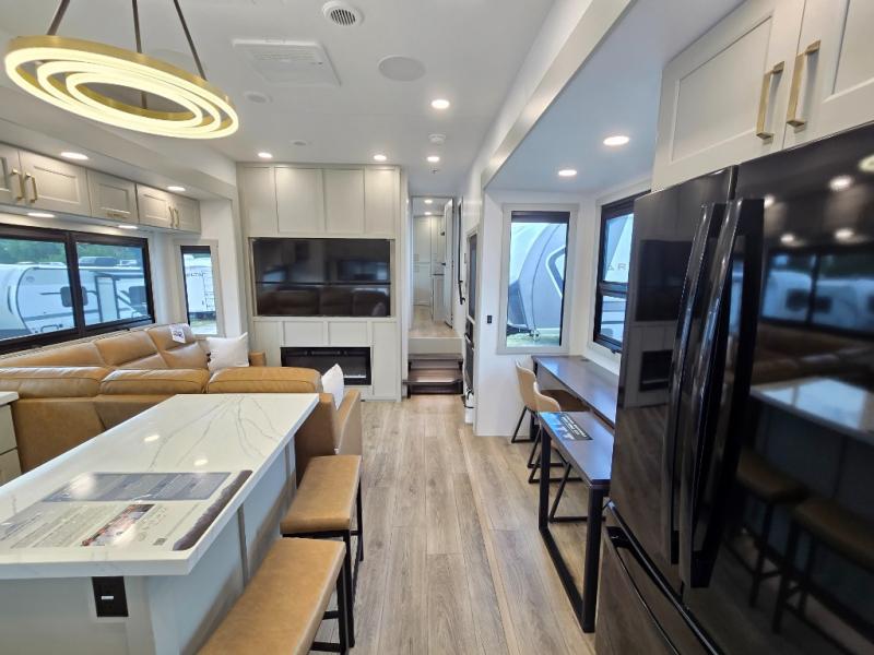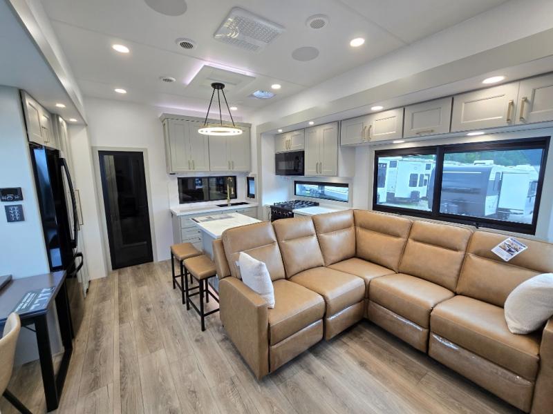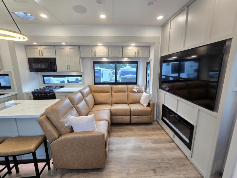 You can't imagine how much this toy hauler has to offer! The garage/outdoor kitchen/office space will allow you to utilize the garage how you need it, plus there is an adjustable tie-down system, as well as a loft for storage and a twin bed to sleep more campers! The garage patio with a 1,500 lb. capacity is another feature you are sure to love, especially with its own awning to keep you protected from the elements. Head to the kitchen to prepare meals with a 24" GE oven with a four burner range, a GE microwave with an air fryer, plus a spacious GE Energy Star 19 cu. ft. refrigerator. The island with two stools will let others visit with you while you cook, and there are even dog bowls to easily feed Frodo. You'll find the convertible dining table/L-desk will be accommodating since it can be use to dine at, and to get some work done. You may just find yourselves spending most of your time on the L-sofa in front of the entertainment center with a TV, fireplace and storage. A full bath is up front by the bedroom, and here you'll find a 30" x 42" shower and and pull-out linen storage with a trash bin to keep towels ready to use. After a day outdoors you'll love nothing more than coming back to your own bedroom with a king bed slide out, TV, a walk-in closet, and many more storage spaces. And we haven't even touched on the exterior features, like the 3-way pass-through storage, three power awnings, an air compressor to fill up tires, and the list goes on and on! This is a pre-production preview, all features and layout placement subject to change.
