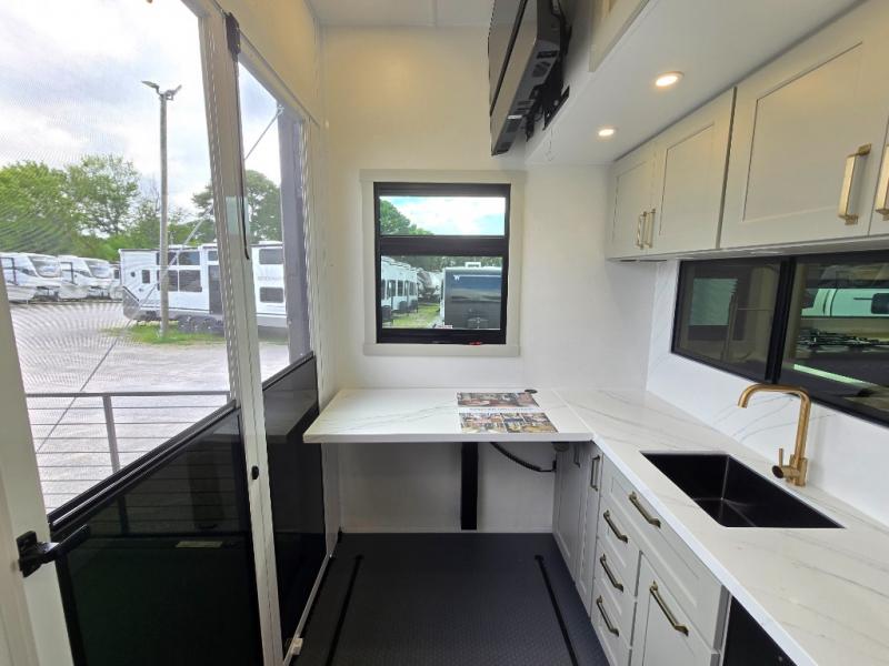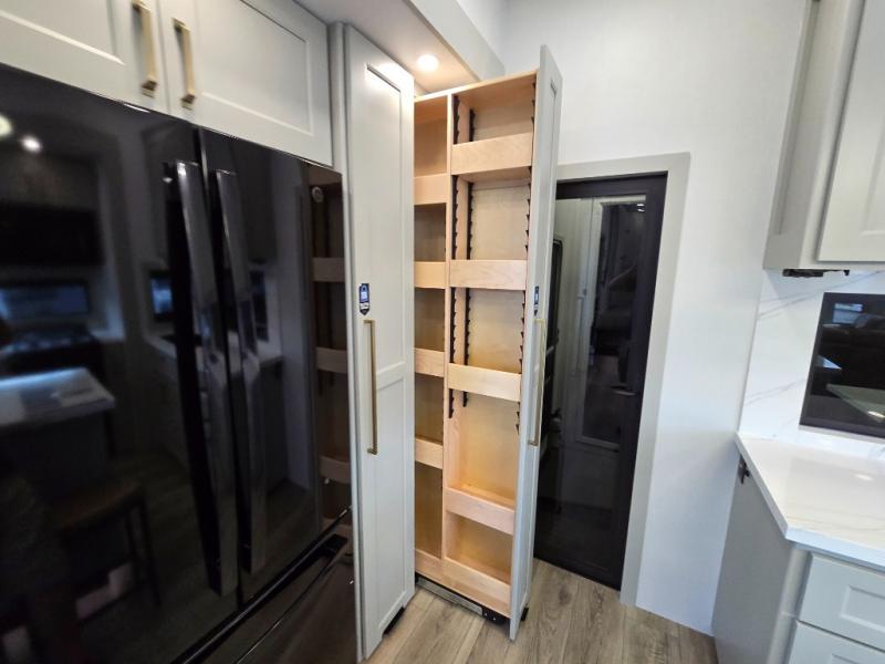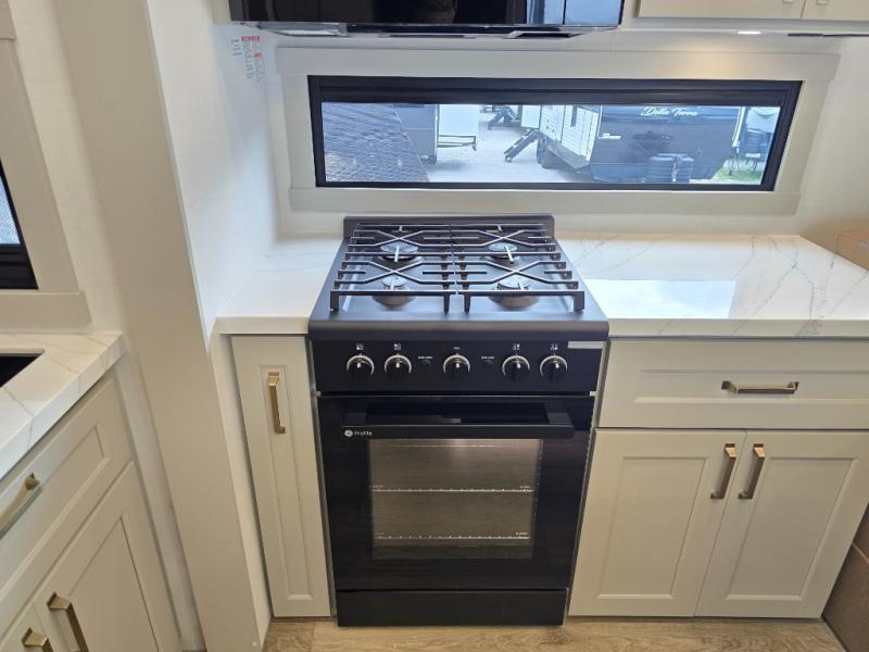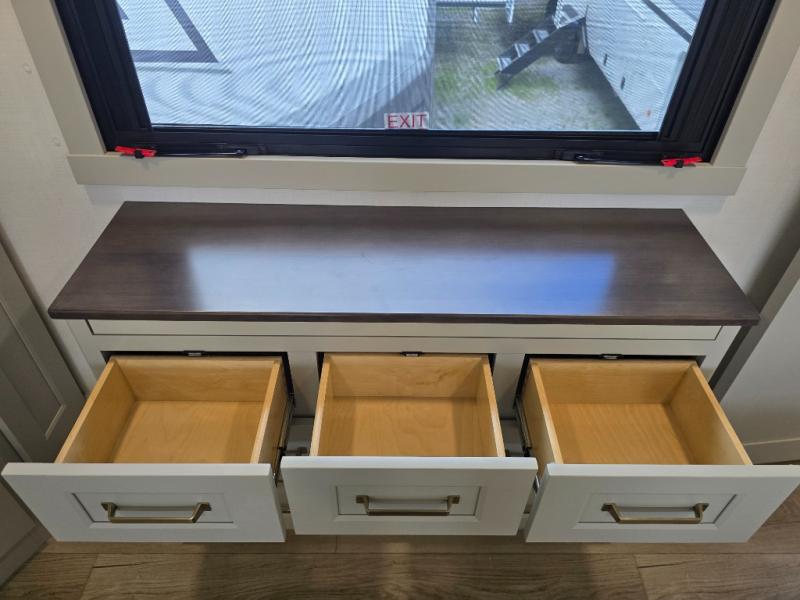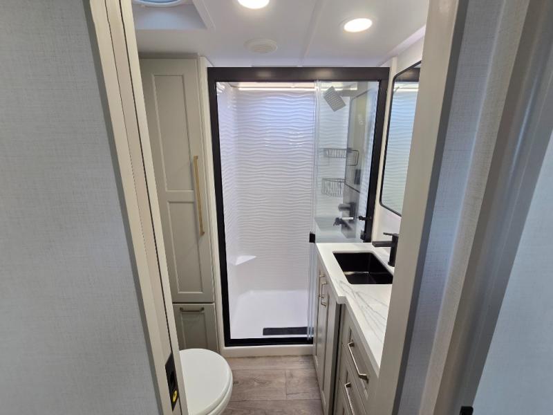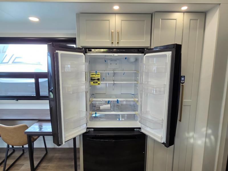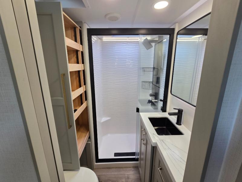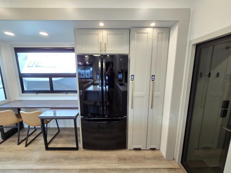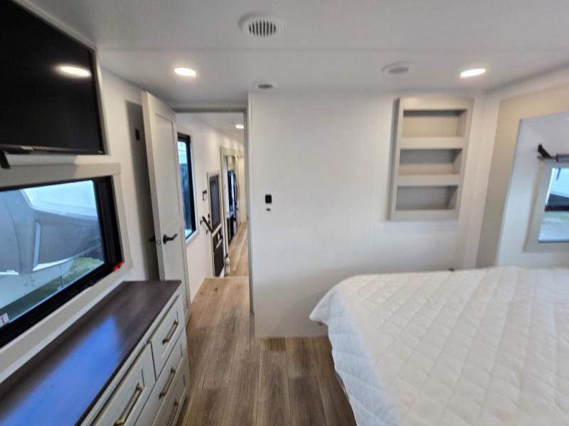 You can't imagine how much this toy hauler has to offer! The garage/outdoor kitchen/office space will allow you to utilize the garage how you need it, plus there is an adjustable tie-down system, as well as a loft for storage and a twin bed to sleep more campers! The garage patio with a 1,500 lb. capacity is another feature you are sure to love, especially with its own awning to keep you protected from the elements. Head to the kitchen to prepare meals with a 24" GE oven with a four burner range, a GE microwave with an air fryer, plus a spacious GE Energy Star 19 cu. ft. refrigerator. The island with two stools will let others visit with you while you cook, and there are even dog bowls to easily feed Frodo. You'll find the convertible dining table/L-desk will be accommodating since it can be use to dine at, and to get some work done. You may just find yourselves spending most of your time on the L-sofa in front of the entertainment center with a TV, fireplace and storage. A full bath is up front by the bedroom, and here you'll find a 30" x 42" shower and and pull-out linen storage with a trash bin to keep towels ready to use. After a day outdoors you'll love nothing more than coming back to your own bedroom with a king bed slide out, TV, a walk-in closet, and many more storage spaces. And we haven't even touched on the exterior features, like the 3-way pass-through storage, three power awnings, an air compressor to fill up tires, and the list goes on and on! This is a pre-production preview, all features and layout placement subject to change.