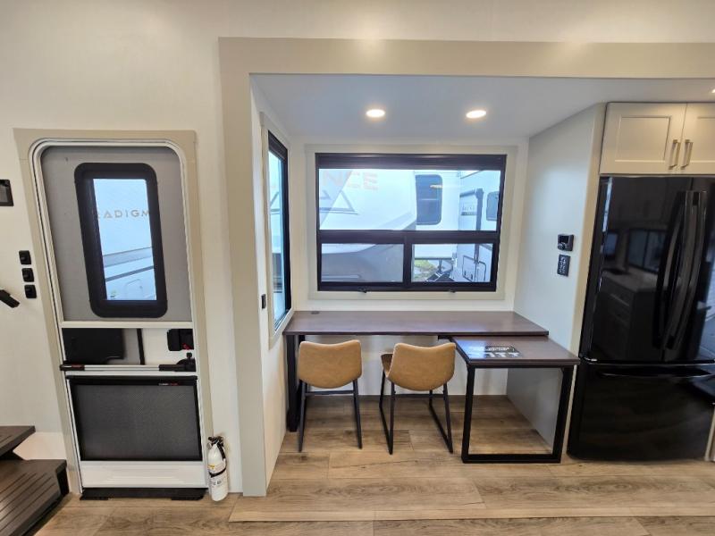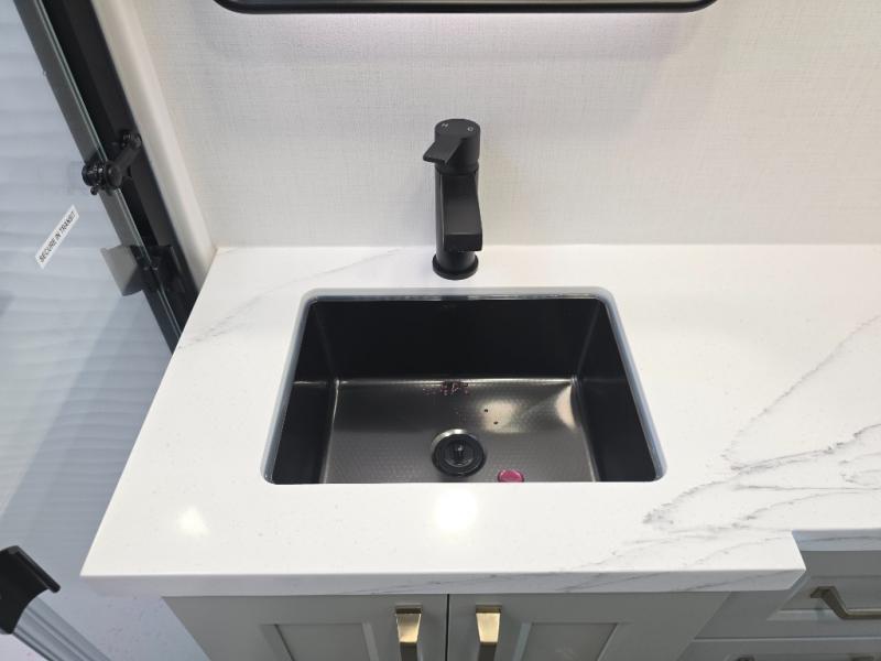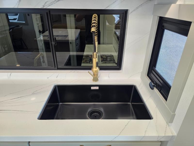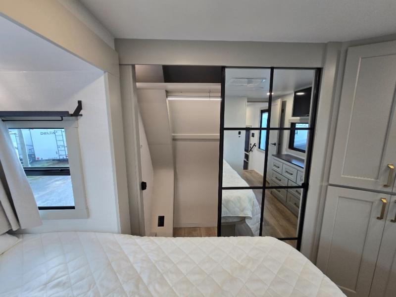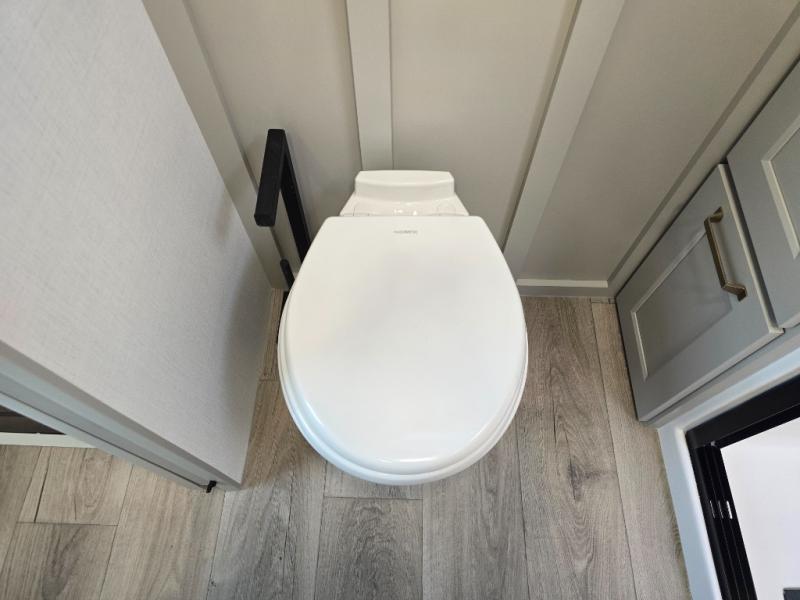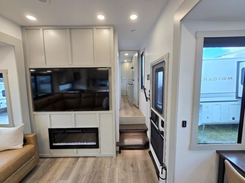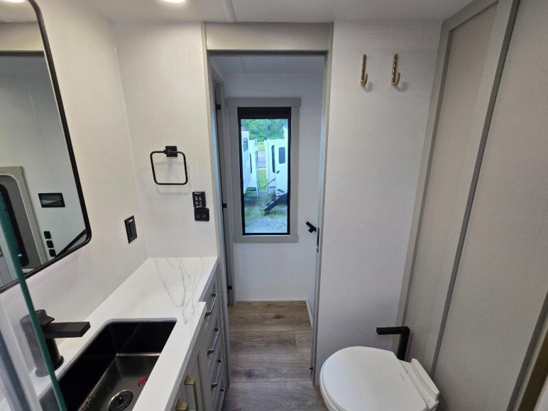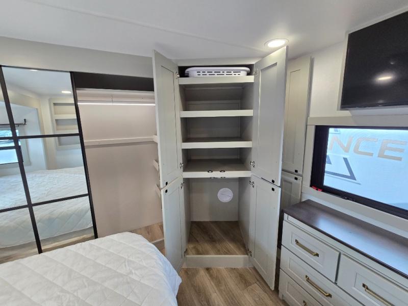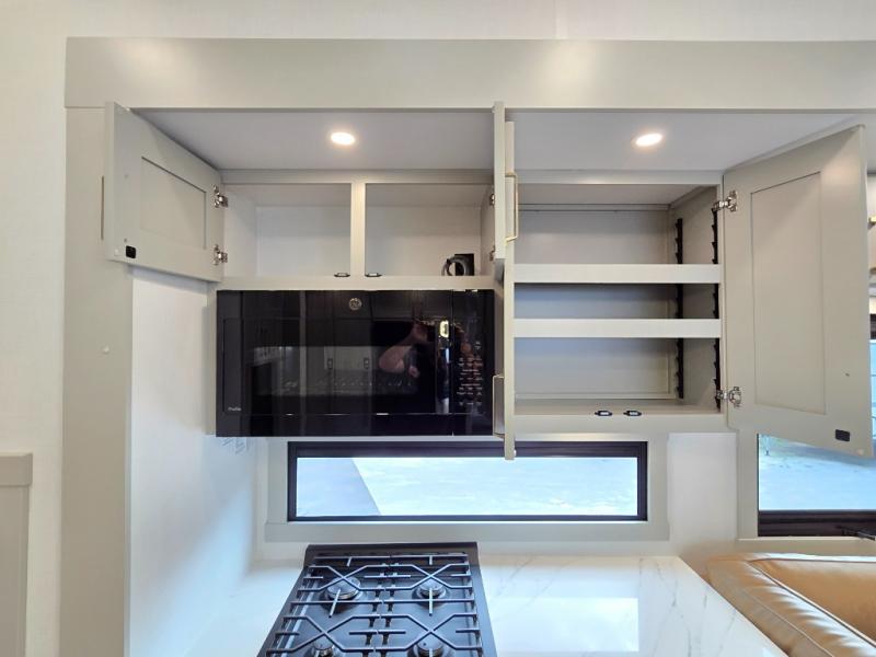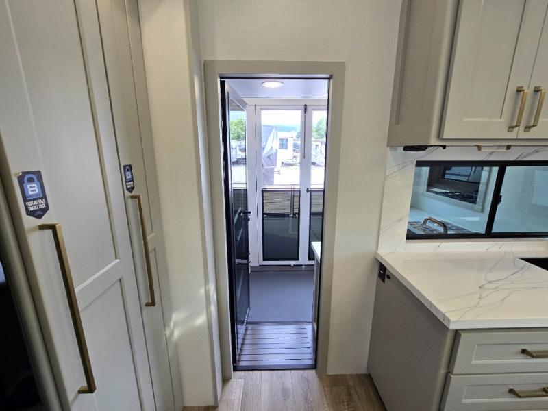 You can't imagine how much this toy hauler has to offer! The garage/outdoor kitchen/office space will allow you to utilize the garage how you need it, plus there is an adjustable tie-down system, as well as a loft for storage and a twin bed to sleep more campers! The garage patio with a 1,500 lb. capacity is another feature you are sure to love, especially with its own awning to keep you protected from the elements. Head to the kitchen to prepare meals with a 24" GE oven with a four burner range, a GE microwave with an air fryer, plus a spacious GE Energy Star 19 cu. ft. refrigerator. The island with two stools will let others visit with you while you cook, and there are even dog bowls to easily feed Frodo. You'll find the convertible dining table/L-desk will be accommodating since it can be use to dine at, and to get some work done. You may just find yourselves spending most of your time on the L-sofa in front of the entertainment center with a TV, fireplace and storage. A full bath is up front by the bedroom, and here you'll find a 30" x 42" shower and and pull-out linen storage with a trash bin to keep towels ready to use. After a day outdoors you'll love nothing more than coming back to your own bedroom with a king bed slide out, TV, a walk-in closet, and many more storage spaces. And we haven't even touched on the exterior features, like the 3-way pass-through storage, three power awnings, an air compressor to fill up tires, and the list goes on and on! This is a pre-production preview, all features and layout placement subject to change.