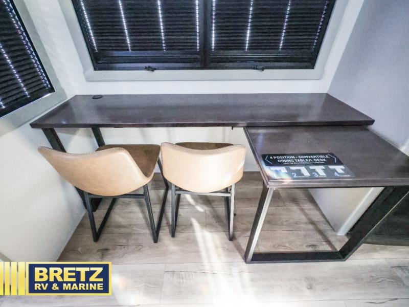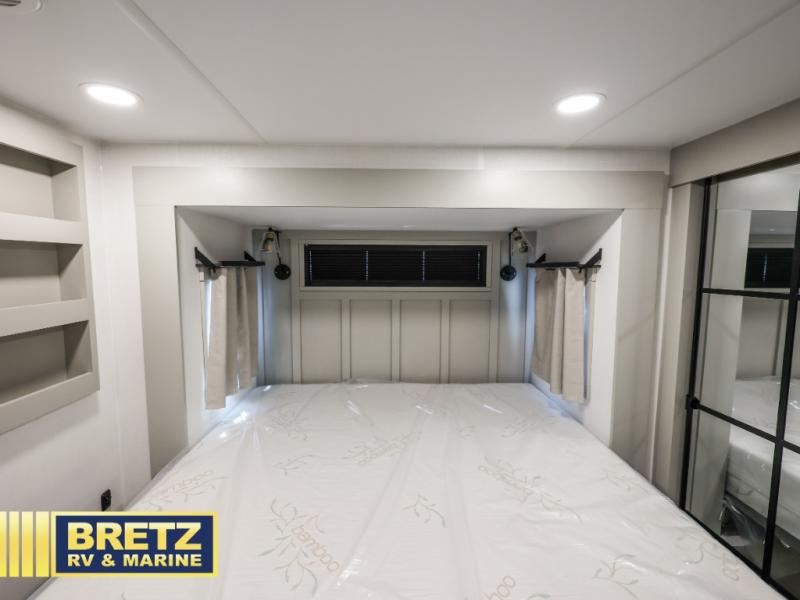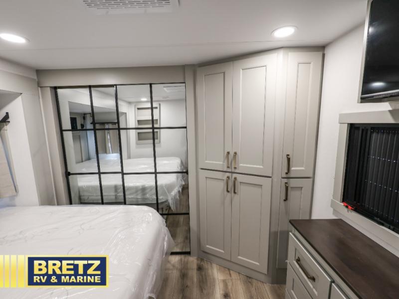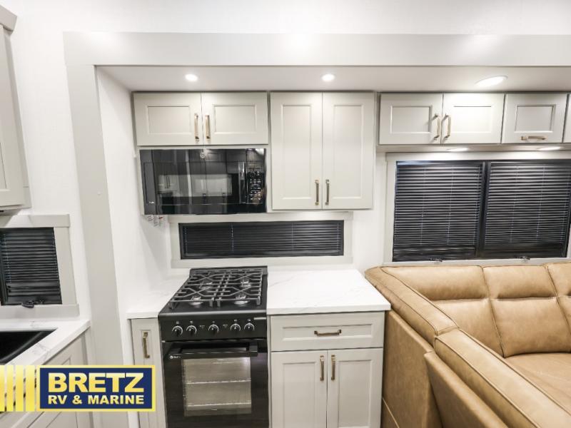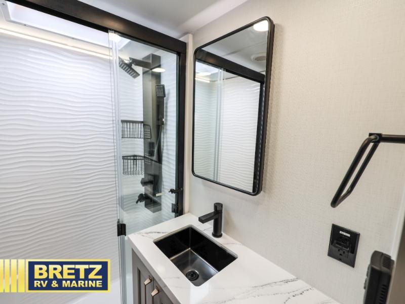 You can't imagine how much this toy hauler has to offer! The garage/outdoor kitchen/office space will allow you to utilize the garage how you need it, plus there is an adjustable tie-down system, as well as a loft for storage and a twin bed to sleep more campers! The garage patio with a 1,500 lb. capacity is another feature you are sure to love, especially with its own awning to keep you protected from the elements. Head to the kitchen to prepare meals with a 24" GE oven with a four burner range, a GE microwave with an air fryer, plus a spacious GE Energy Star 19 cu. ft. refrigerator. The island with two stools will let others visit with you while you cook, and there are even dog bowls to easily feed Frodo. You'll find the convertible dining table/L-desk will be accommodating since it can be use to dine at, and to get some work done. You may just find yourselves spending most of your time on the L-sofa in front of the entertainment center with a TV, fireplace and storage. A full bath is up front by the bedroom, and here you'll find a 30" x 42" shower and and pull-out linen storage with a trash bin to keep towels ready to use. After a day outdoors you'll love nothing more than coming back to your own bedroom with a king bed slide out, TV, a walk-in closet, and many more storage spaces. And we haven't even touched on the exterior features, like the 3-way pass-through storage, three power awnings, an air compressor to fill up tires, and the list goes on and on! This is a pre-production preview, all features and layout placement subject to change.