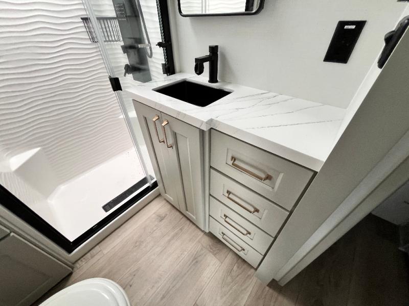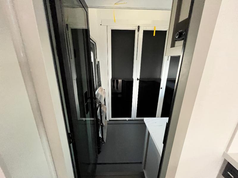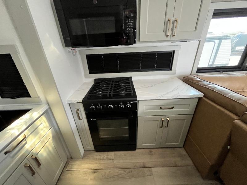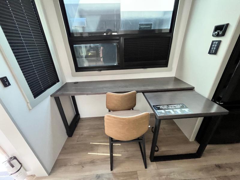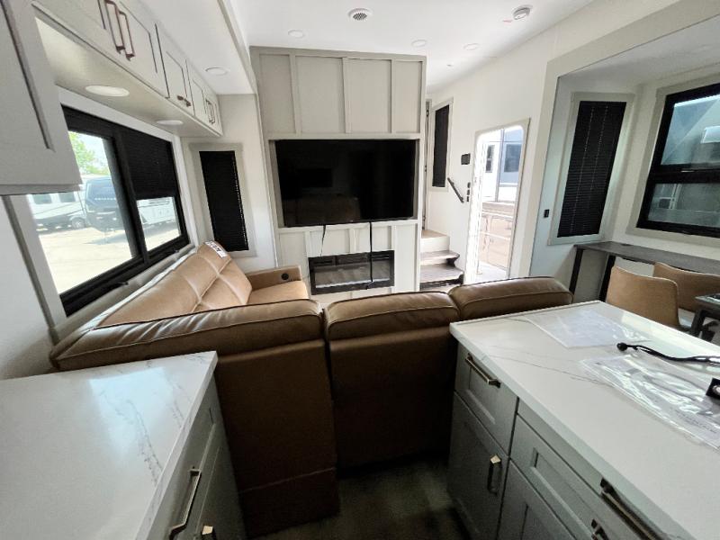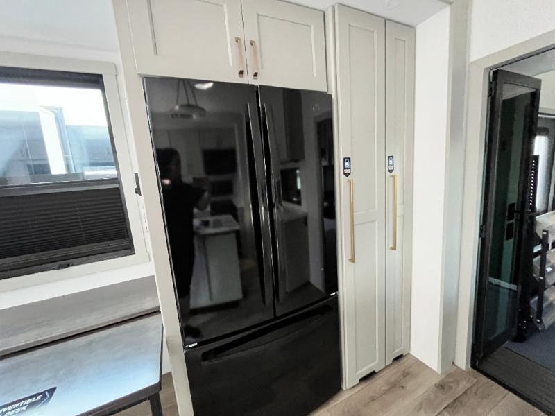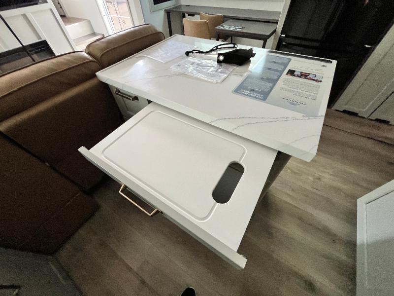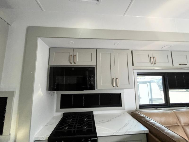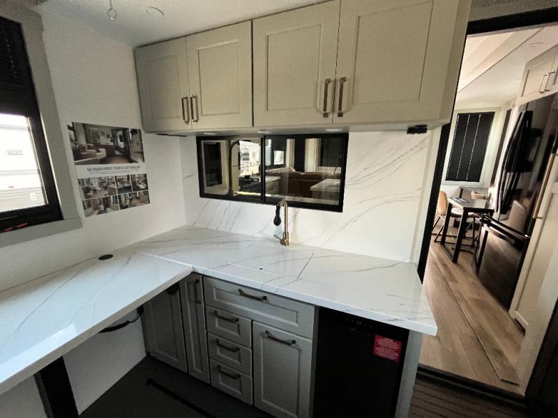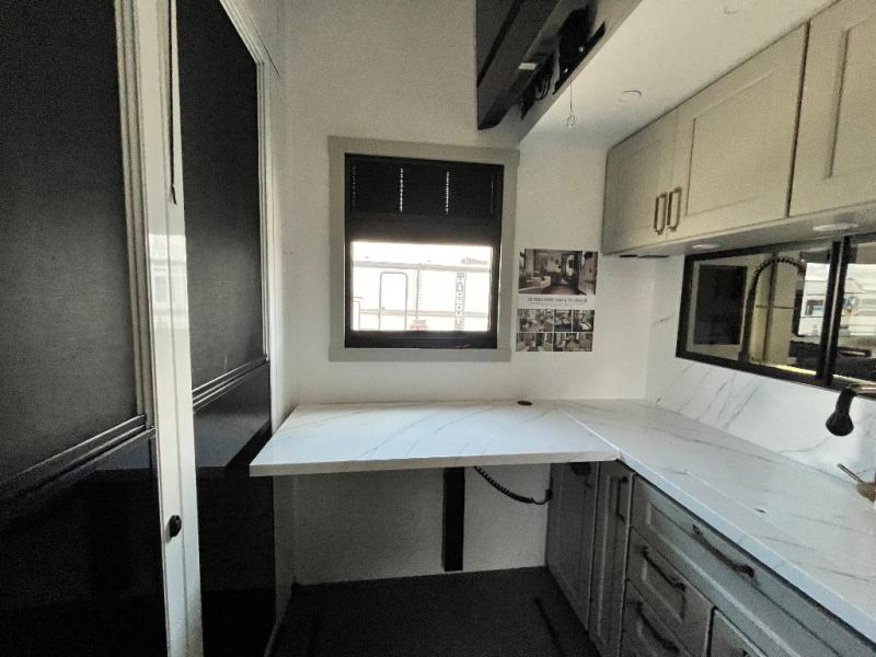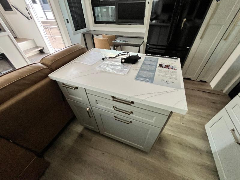 You can't imagine how much this toy hauler has to offer! The garage/outdoor kitchen/office space will allow you to utilize the garage how you need it, plus there is an adjustable tie-down system, as well as a loft for storage and a twin bed to sleep more campers! The garage patio with a 1,500 lb. capacity is another feature you are sure to love, especially with its own awning to keep you protected from the elements. Head to the kitchen to prepare meals with a 24" GE oven with a four burner range, a GE microwave with an air fryer, plus a spacious GE Energy Star 19 cu. ft. refrigerator. The island with two stools will let others visit with you while you cook, and there are even dog bowls to easily feed Frodo. You'll find the convertible dining table/L-desk will be accommodating since it can be use to dine at, and to get some work done. You may just find yourselves spending most of your time on the L-sofa in front of the entertainment center with a TV, fireplace and storage. A full bath is up front by the bedroom, and here you'll find a 30" x 42" shower and and pull-out linen storage with a trash bin to keep towels ready to use. After a day outdoors you'll love nothing more than coming back to your own bedroom with a king bed slide out, TV, a walk-in closet, and many more storage spaces. And we haven't even touched on the exterior features, like the 3-way pass-through storage, three power awnings, an air compressor to fill up tires, and the list goes on and on! This is a pre-production preview, all features and layout placement subject to change.