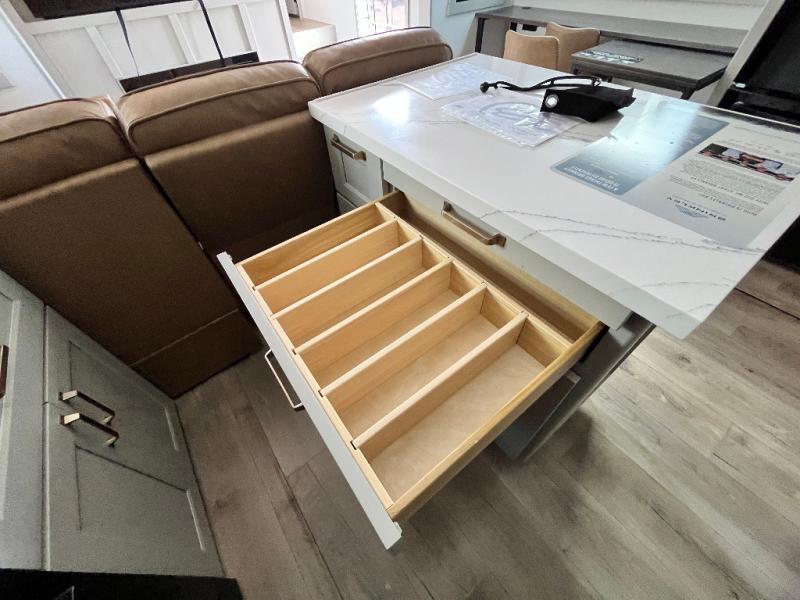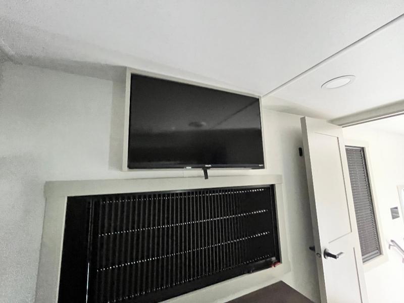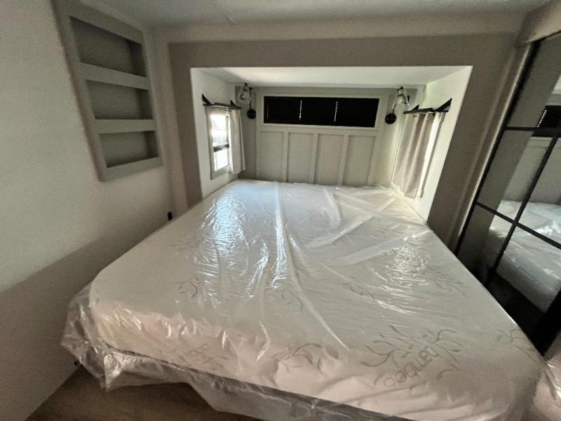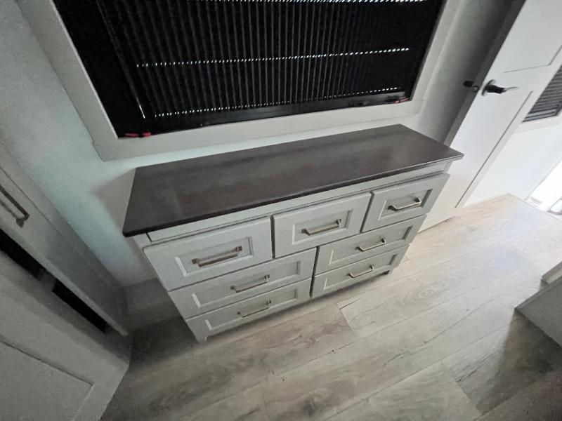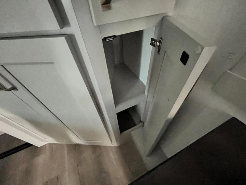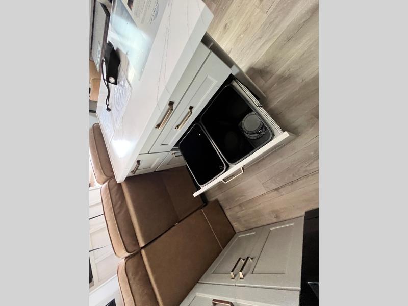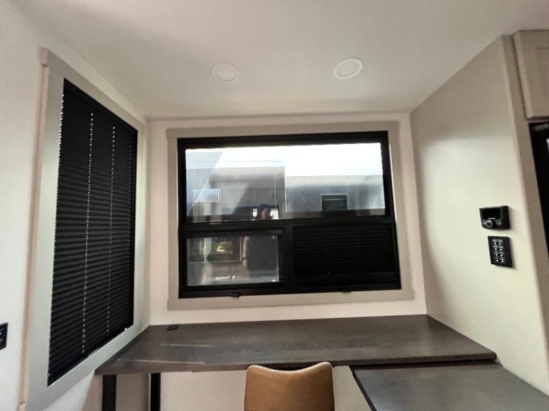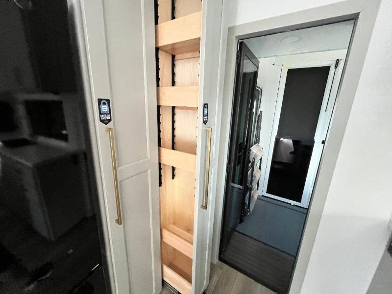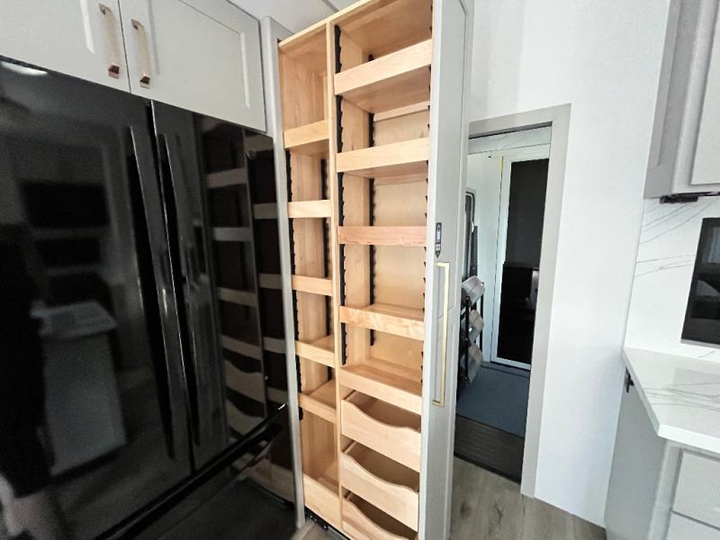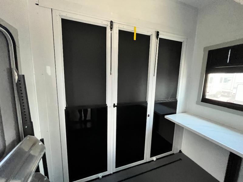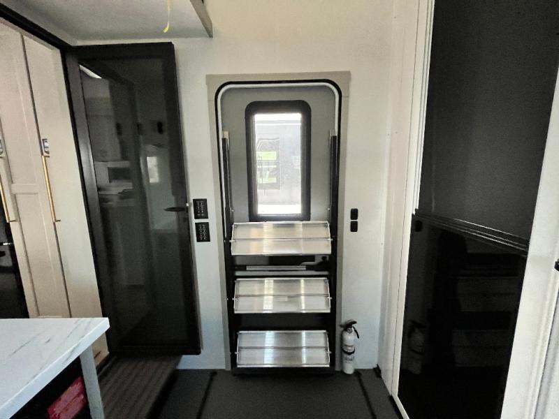 You can't imagine how much this toy hauler has to offer! The garage/outdoor kitchen/office space will allow you to utilize the garage how you need it, plus there is an adjustable tie-down system, as well as a loft for storage and a twin bed to sleep more campers! The garage patio with a 1,500 lb. capacity is another feature you are sure to love, especially with its own awning to keep you protected from the elements. Head to the kitchen to prepare meals with a 24" GE oven with a four burner range, a GE microwave with an air fryer, plus a spacious GE Energy Star 19 cu. ft. refrigerator. The island with two stools will let others visit with you while you cook, and there are even dog bowls to easily feed Frodo. You'll find the convertible dining table/L-desk will be accommodating since it can be use to dine at, and to get some work done. You may just find yourselves spending most of your time on the L-sofa in front of the entertainment center with a TV, fireplace and storage. A full bath is up front by the bedroom, and here you'll find a 30" x 42" shower and and pull-out linen storage with a trash bin to keep towels ready to use. After a day outdoors you'll love nothing more than coming back to your own bedroom with a king bed slide out, TV, a walk-in closet, and many more storage spaces. And we haven't even touched on the exterior features, like the 3-way pass-through storage, three power awnings, an air compressor to fill up tires, and the list goes on and on! This is a pre-production preview, all features and layout placement subject to change.