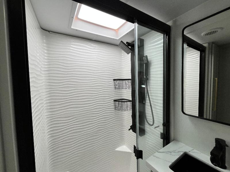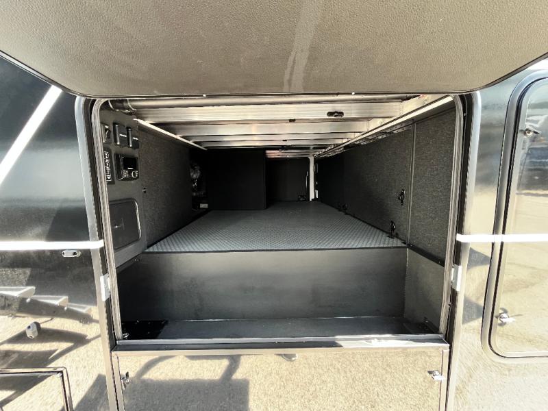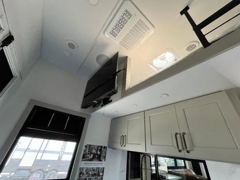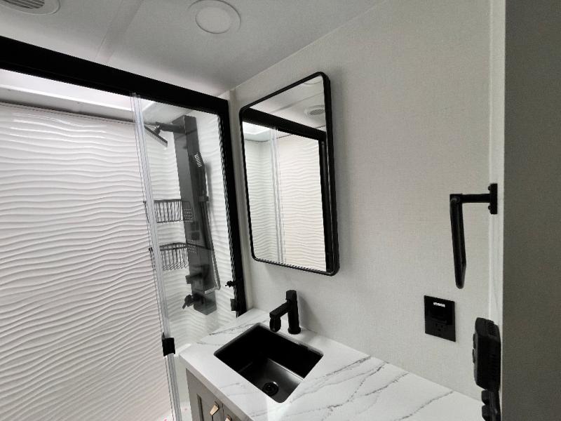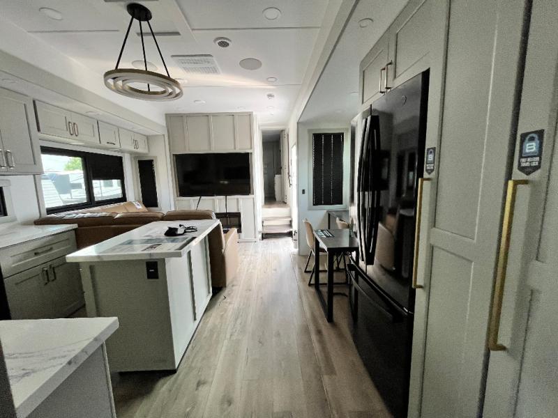 With any Model G toy hauler fifth wheel by Brinkley you will enjoy luxurious amenities, tons of storage space, and innovative features that have been developed and tested in the real world. Durable construction includes an industry leading PDI process, an industry best insulation package, and reinforced and walkable slide roofs. Some of the exterior features you'll find are a 3-way pass-through with a multi-functional flip-up bulkhead wall, under I-beam storage, a MAX-Vision reverse lighting system, and a low-maintenance roof to name a few. A Rockford Fosgate audio system comes standard, along with a Full app-based coach control system (iOS & Android) that lets you control your fifth wheel's functions right from your mobile device. You will find the solar system with a designated storage area to be ultra convenient, plus there is a FlexPower 5500 with a dual fuel inverter generator for all your power needs. Head inside to find a residential interior with Brinkley's CraftSense wood trim construction, floating entrance steps, integrated window screens and insulated blackout blinds, and residential solid surface countertops plus backsplash. You will also enjoy the neon shower lighting and recessed medicine cabinets in the bath, plus motion activated LED bed lights and dual bedside outlets in the bedroom. Choose a Model G toy hauler fifth wheel to experience all the luxury it has to offer!