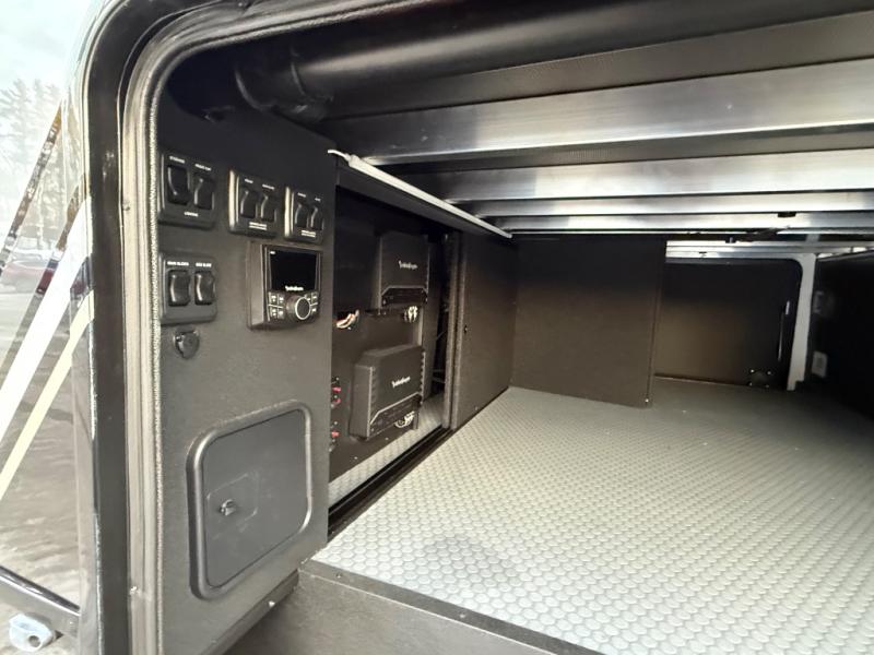 You can't imagine how much this toy hauler has to offer! The garage/outdoor kitchen/office space will allow you to utilize the garage how you need it, plus there is an adjustable tie-down system, as well as a loft for storage and a twin bed to sleep more campers! The garage patio with a 1,500 lb. capacity is another feature you are sure to love, especially with its own awning to keep you protected from the elements. Head to the kitchen to prepare meals with a 24" GE oven with a four burner range, a GE microwave with an air fryer, plus a spacious GE Energy Star 19 cu. ft. refrigerator. The island with two stools will let others visit with you while you cook, and there are even dog bowls to easily feed Frodo. You'll find the convertible dining table/L-desk will be accommodating since it can be use to dine at, and to get some work done. You may just find yourselves spending most of your time on the L-sofa in front of the entertainment center with a TV, fireplace and storage. A full bath is up front by the bedroom, and here you'll find a 30" x 42" shower and and pull-out linen storage with a trash bin to keep towels ready to use. After a day outdoors you'll love nothing more than coming back to your own bedroom with a king bed slide out, TV, a walk-in closet, and many more storage spaces. And we haven't even touched on the exterior features, like the 3-way pass-through storage, three power awnings, an air compressor to fill up tires, and the list goes on and on! This is a pre-production preview, all features and layout placement subject to change.