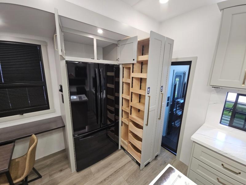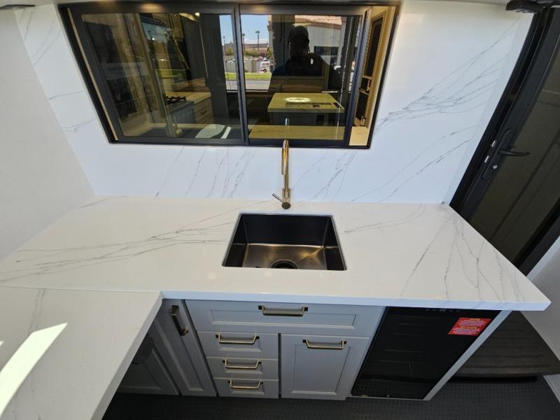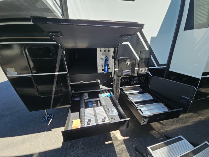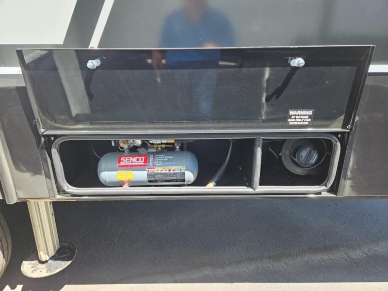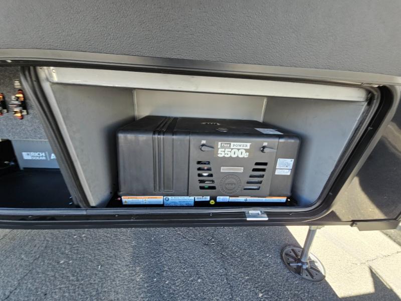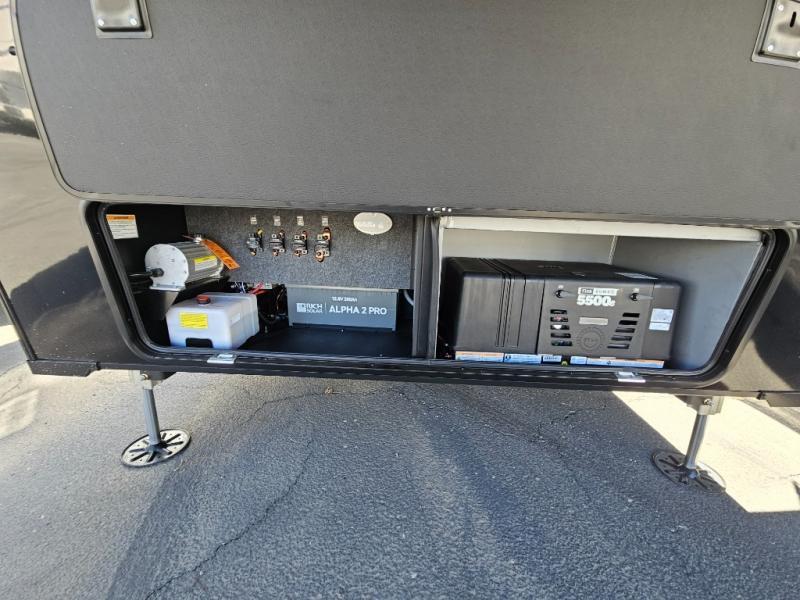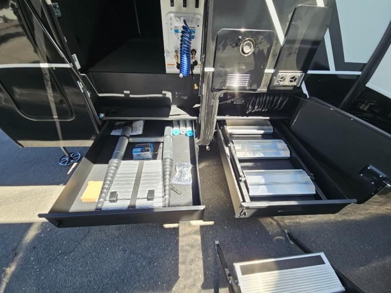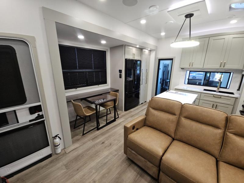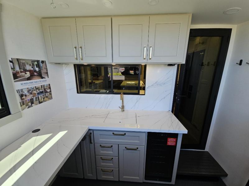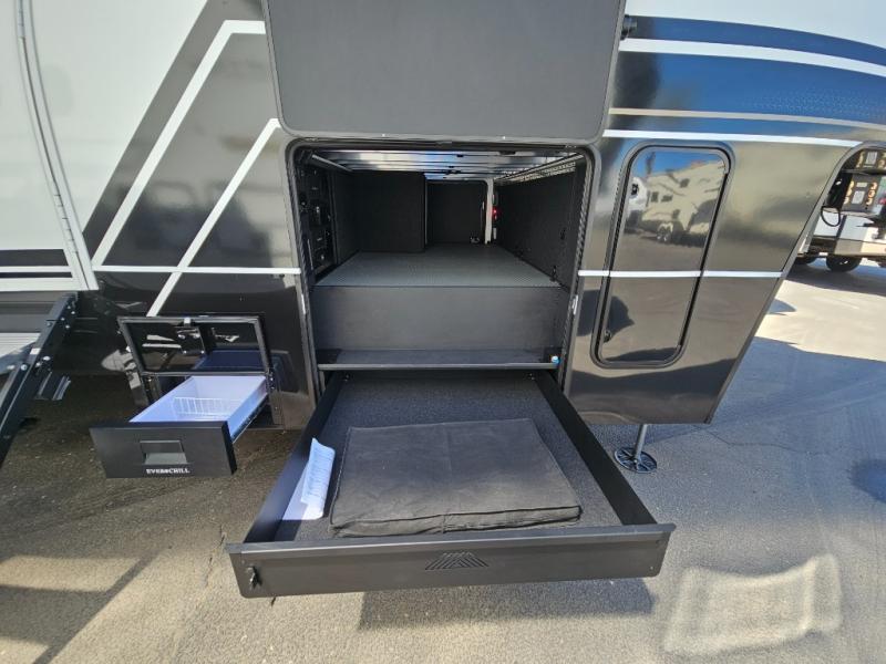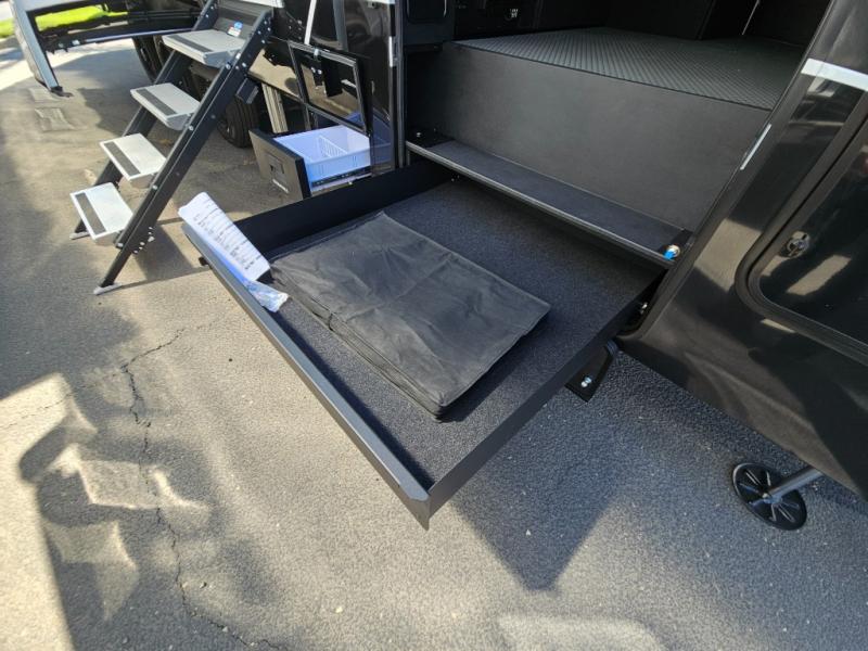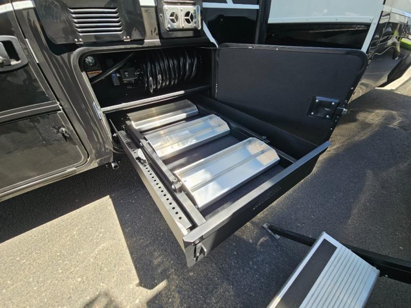 You can't imagine how much this toy hauler has to offer! The garage/outdoor kitchen/office space will allow you to utilize the garage how you need it, plus there is an adjustable tie-down system, as well as a loft for storage and a twin bed to sleep more campers! The garage patio with a 1,500 lb. capacity is another feature you are sure to love, especially with its own awning to keep you protected from the elements. Head to the kitchen to prepare meals with a 24" GE oven with a four burner range, a GE microwave with an air fryer, plus a spacious GE Energy Star 19 cu. ft. refrigerator. The island with two stools will let others visit with you while you cook, and there are even dog bowls to easily feed Frodo. You'll find the convertible dining table/L-desk will be accommodating since it can be use to dine at, and to get some work done. You may just find yourselves spending most of your time on the L-sofa in front of the entertainment center with a TV, fireplace and storage. A full bath is up front by the bedroom, and here you'll find a 30" x 42" shower and and pull-out linen storage with a trash bin to keep towels ready to use. After a day outdoors you'll love nothing more than coming back to your own bedroom with a king bed slide out, TV, a walk-in closet, and many more storage spaces. And we haven't even touched on the exterior features, like the 3-way pass-through storage, three power awnings, an air compressor to fill up tires, and the list goes on and on! This is a pre-production preview, all features and layout placement subject to change.