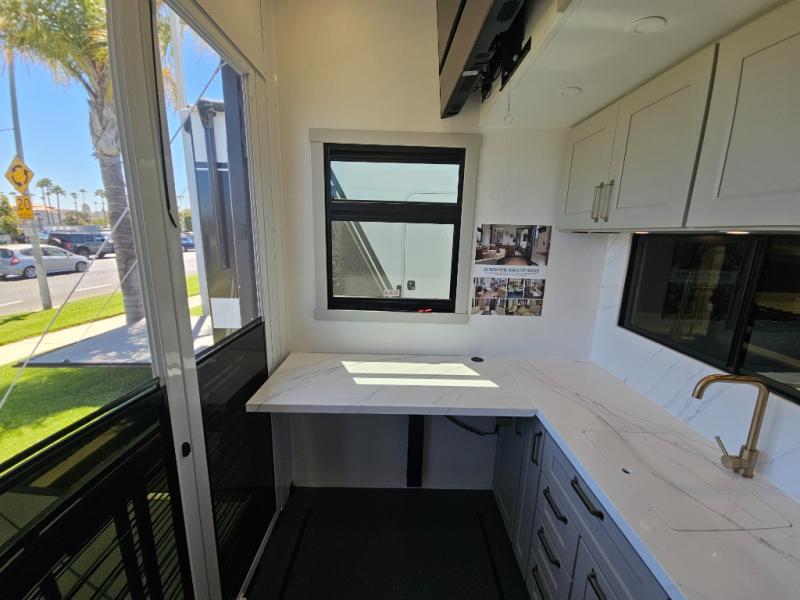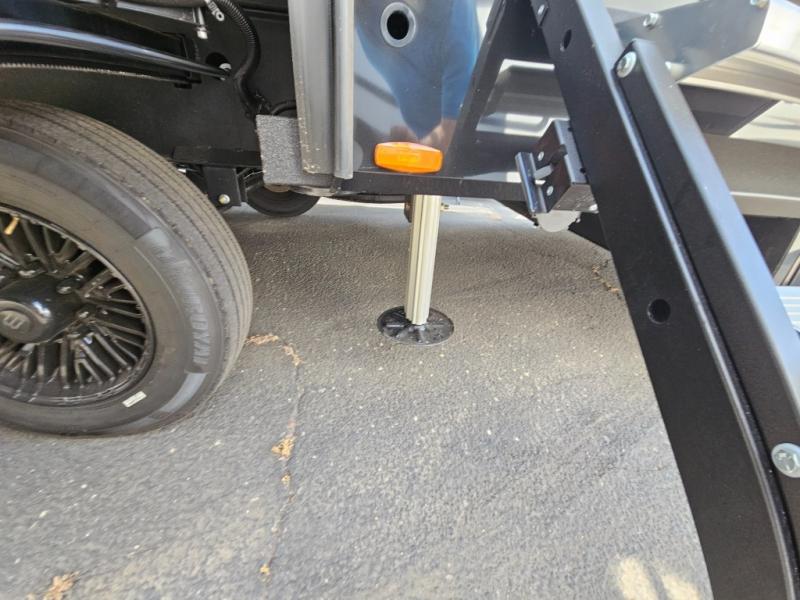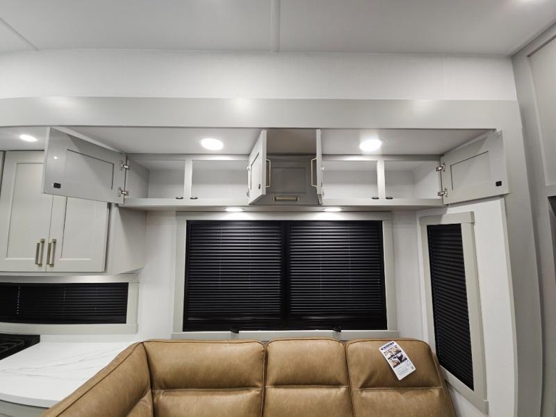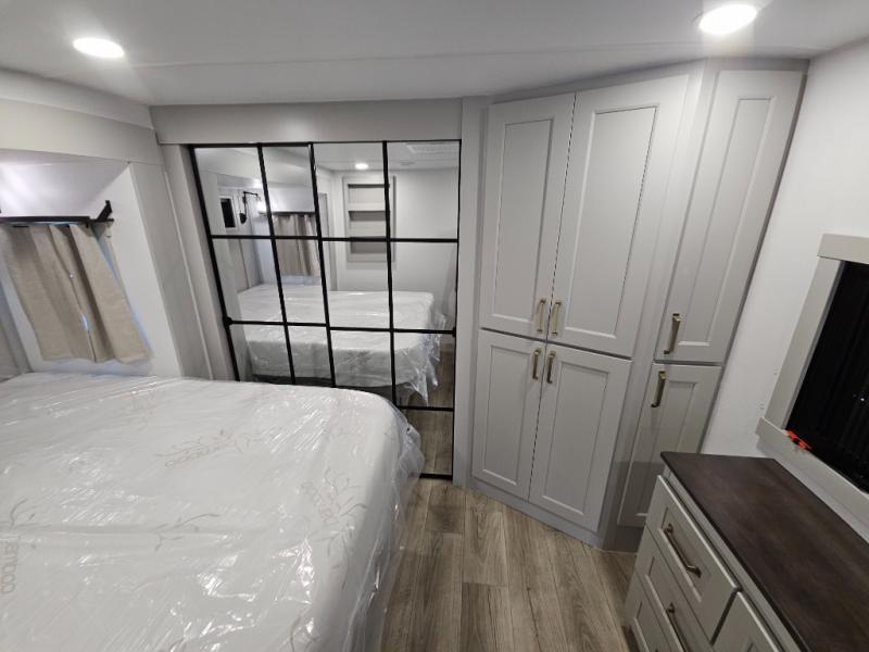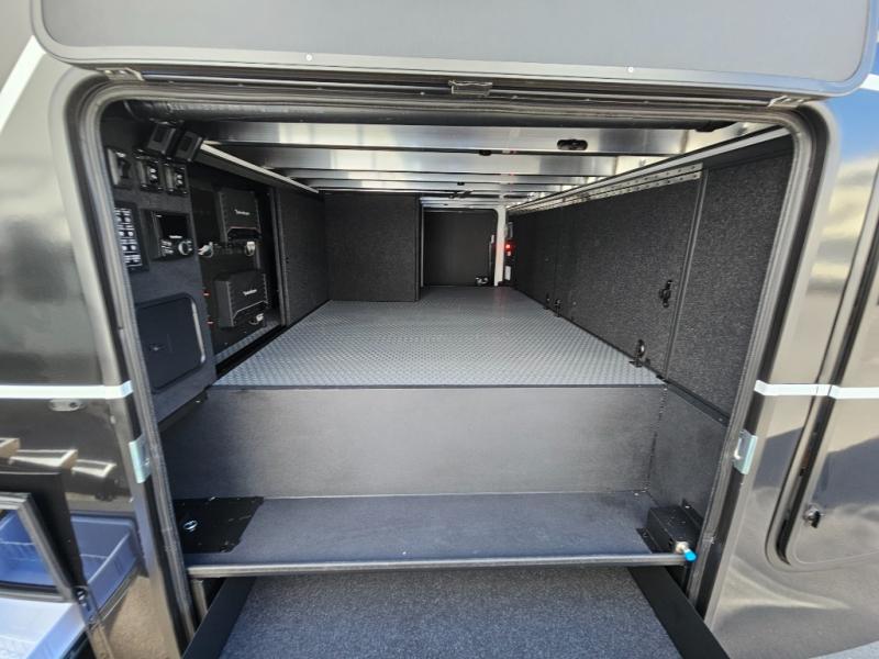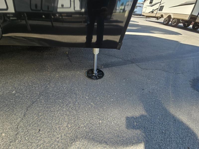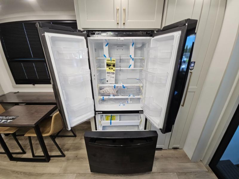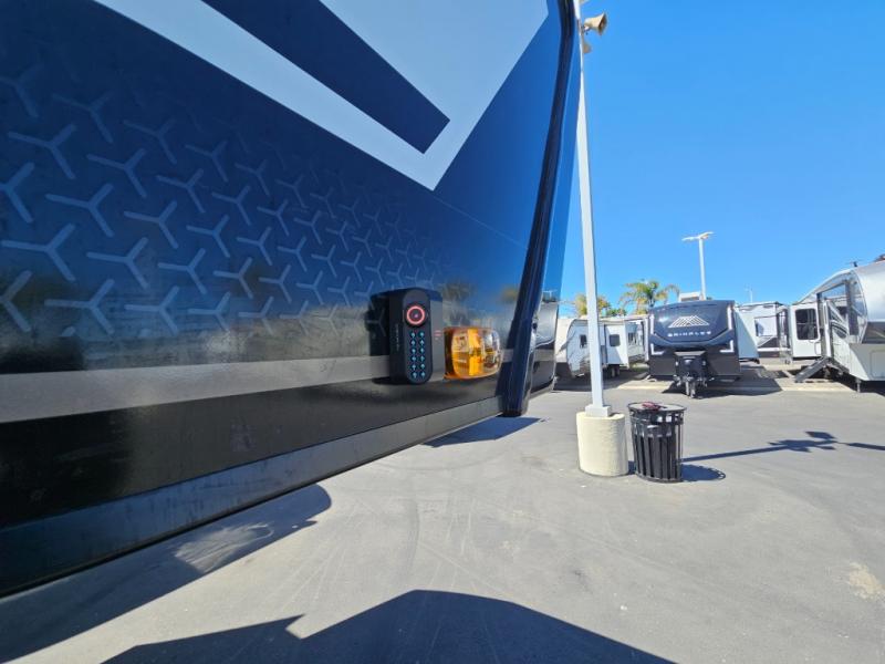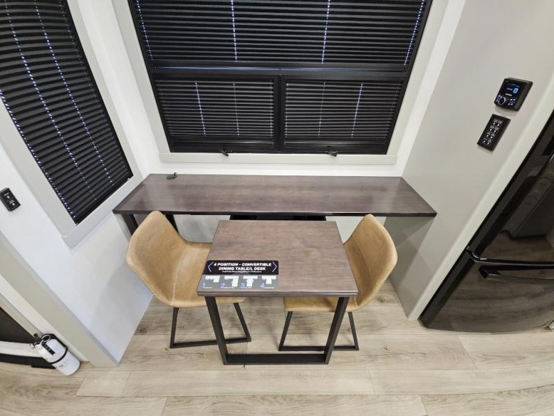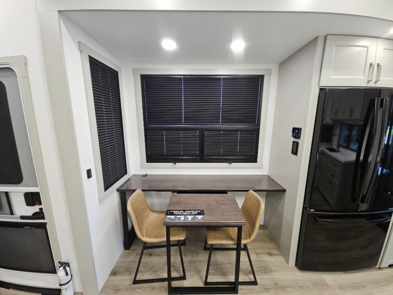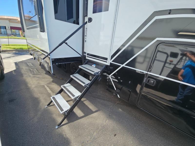 You can't imagine how much this toy hauler has to offer! The garage/outdoor kitchen/office space will allow you to utilize the garage how you need it, plus there is an adjustable tie-down system, as well as a loft for storage and a twin bed to sleep more campers! The garage patio with a 1,500 lb. capacity is another feature you are sure to love, especially with its own awning to keep you protected from the elements. Head to the kitchen to prepare meals with a 24" GE oven with a four burner range, a GE microwave with an air fryer, plus a spacious GE Energy Star 19 cu. ft. refrigerator. The island with two stools will let others visit with you while you cook, and there are even dog bowls to easily feed Frodo. You'll find the convertible dining table/L-desk will be accommodating since it can be use to dine at, and to get some work done. You may just find yourselves spending most of your time on the L-sofa in front of the entertainment center with a TV, fireplace and storage. A full bath is up front by the bedroom, and here you'll find a 30" x 42" shower and and pull-out linen storage with a trash bin to keep towels ready to use. After a day outdoors you'll love nothing more than coming back to your own bedroom with a king bed slide out, TV, a walk-in closet, and many more storage spaces. And we haven't even touched on the exterior features, like the 3-way pass-through storage, three power awnings, an air compressor to fill up tires, and the list goes on and on! This is a pre-production preview, all features and layout placement subject to change.