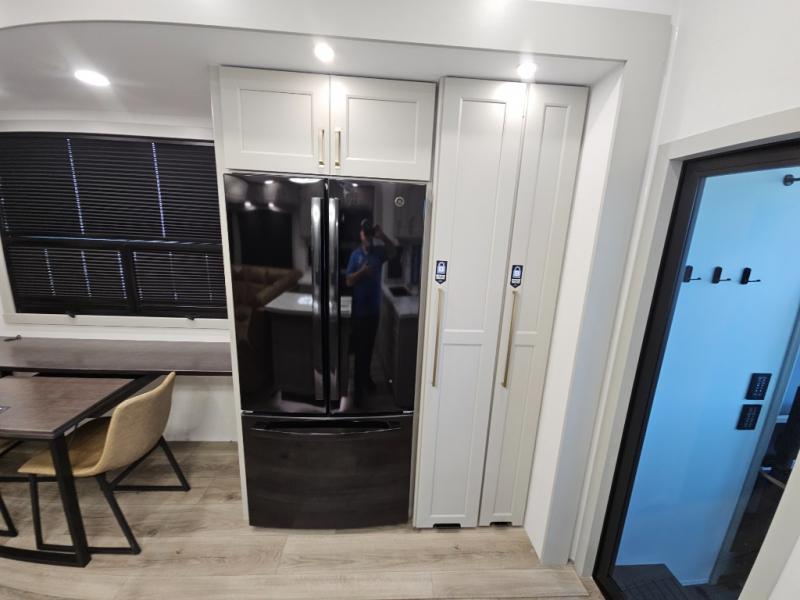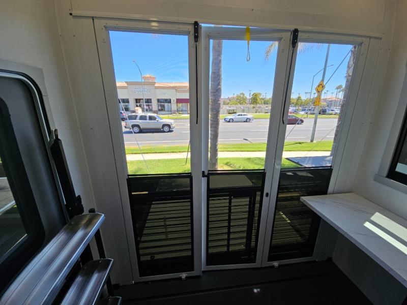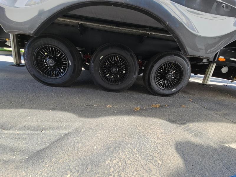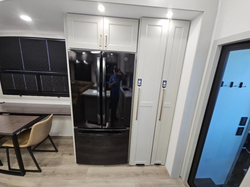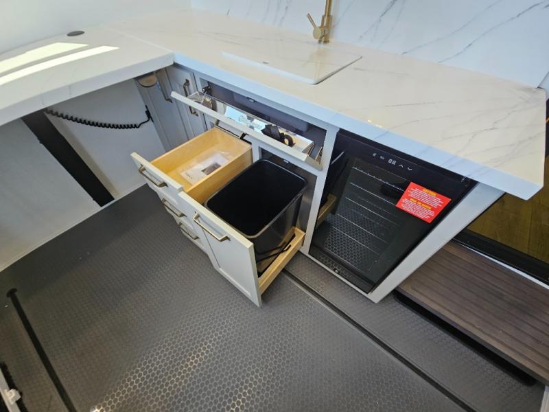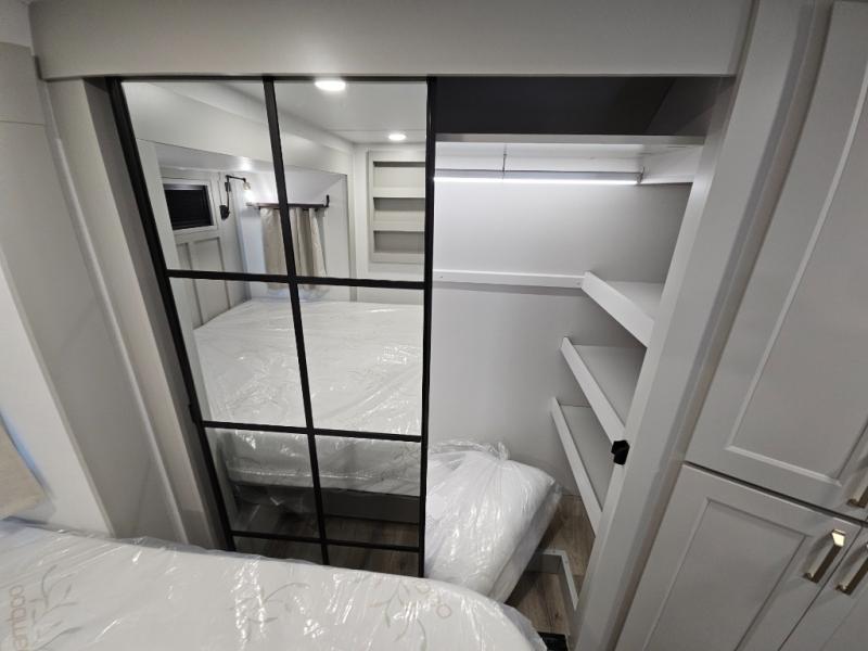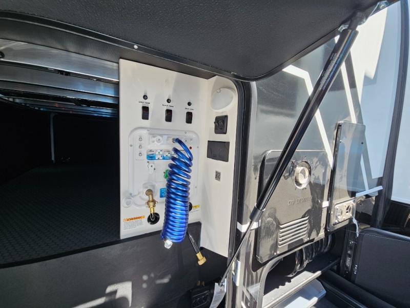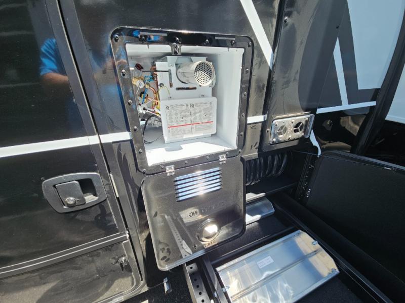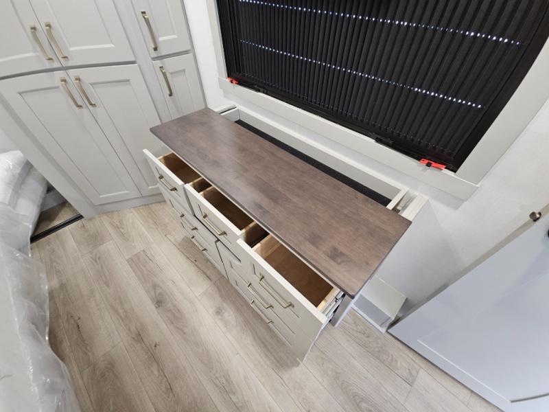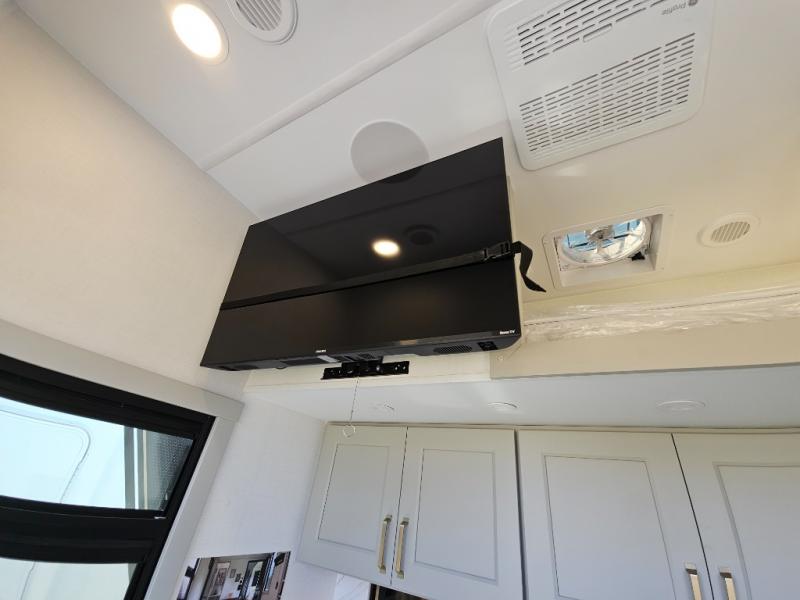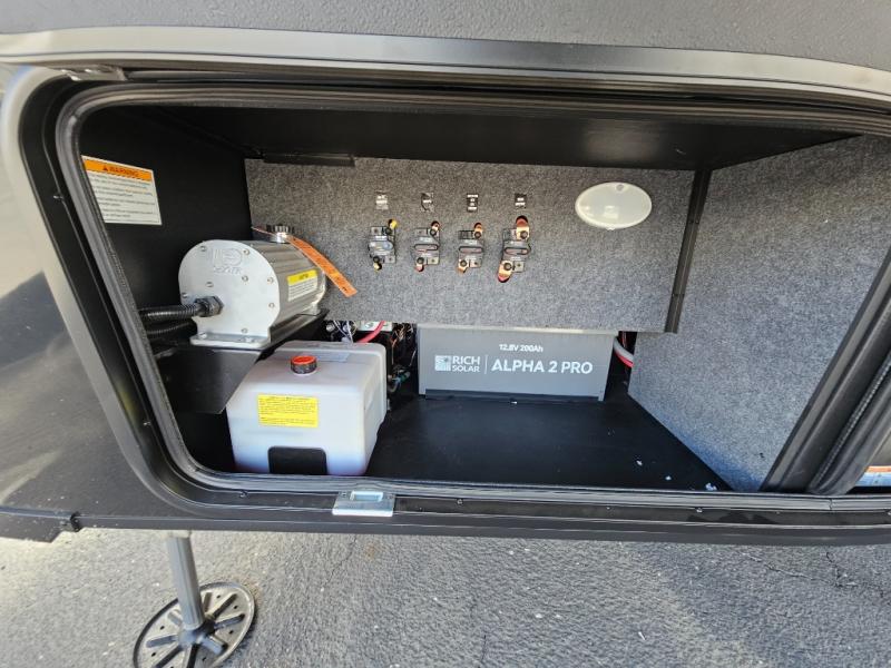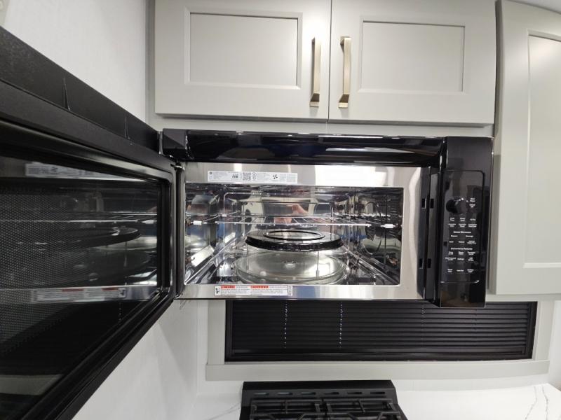 You can't imagine how much this toy hauler has to offer! The garage/outdoor kitchen/office space will allow you to utilize the garage how you need it, plus there is an adjustable tie-down system, as well as a loft for storage and a twin bed to sleep more campers! The garage patio with a 1,500 lb. capacity is another feature you are sure to love, especially with its own awning to keep you protected from the elements. Head to the kitchen to prepare meals with a 24" GE oven with a four burner range, a GE microwave with an air fryer, plus a spacious GE Energy Star 19 cu. ft. refrigerator. The island with two stools will let others visit with you while you cook, and there are even dog bowls to easily feed Frodo. You'll find the convertible dining table/L-desk will be accommodating since it can be use to dine at, and to get some work done. You may just find yourselves spending most of your time on the L-sofa in front of the entertainment center with a TV, fireplace and storage. A full bath is up front by the bedroom, and here you'll find a 30" x 42" shower and and pull-out linen storage with a trash bin to keep towels ready to use. After a day outdoors you'll love nothing more than coming back to your own bedroom with a king bed slide out, TV, a walk-in closet, and many more storage spaces. And we haven't even touched on the exterior features, like the 3-way pass-through storage, three power awnings, an air compressor to fill up tires, and the list goes on and on! This is a pre-production preview, all features and layout placement subject to change.