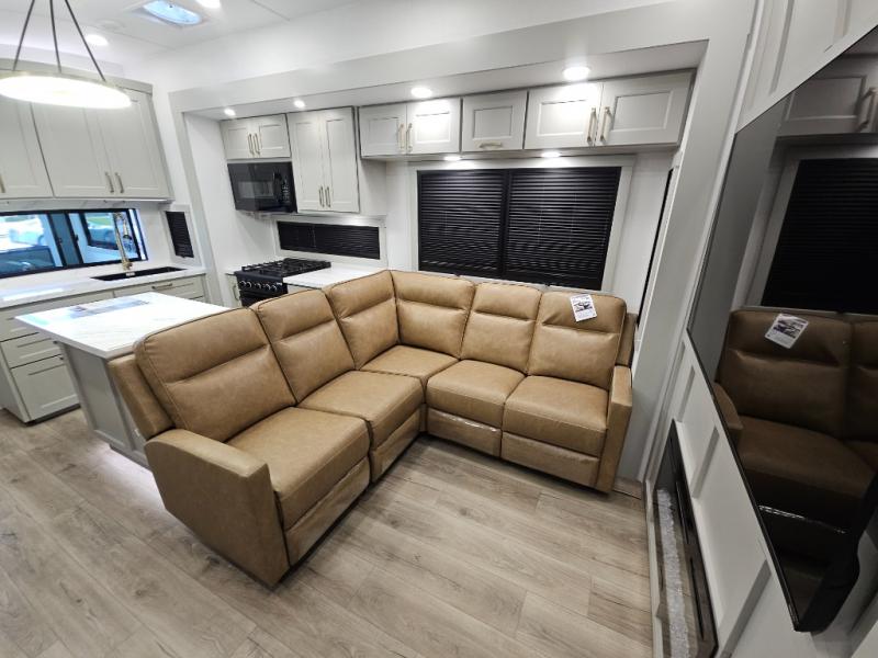 With any Model G toy hauler fifth wheel by Brinkley you will enjoy luxurious amenities, tons of storage space, and innovative features that have been developed and tested in the real world. Durable construction includes an industry leading PDI process, an industry best insulation package, and reinforced and walkable slide roofs. Some of the exterior features you'll find are a 3-way pass-through with a multi-functional flip-up bulkhead wall, under I-beam storage, a MAX-Vision reverse lighting system, and a low-maintenance roof to name a few. A Rockford Fosgate audio system comes standard, along with a Full app-based coach control system (iOS & Android) that lets you control your fifth wheel's functions right from your mobile device. You will find the solar system with a designated storage area to be ultra convenient, plus there is a FlexPower 5500 with a dual fuel inverter generator for all your power needs. Head inside to find a residential interior with Brinkley's CraftSense wood trim construction, floating entrance steps, integrated window screens and insulated blackout blinds, and residential solid surface countertops plus backsplash. You will also enjoy the neon shower lighting and recessed medicine cabinets in the bath, plus motion activated LED bed lights and dual bedside outlets in the bedroom. Choose a Model G toy hauler fifth wheel to experience all the luxury it has to offer!