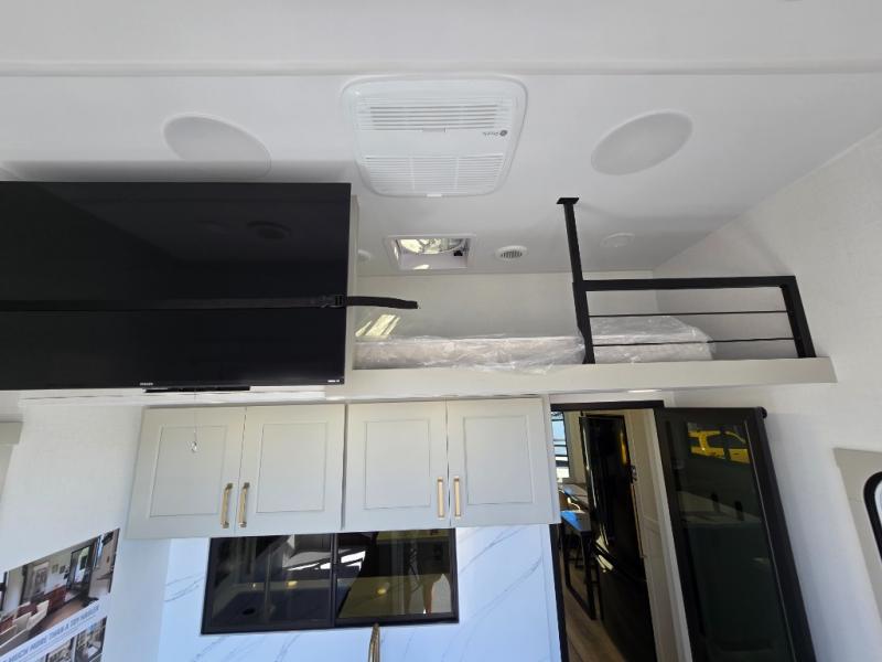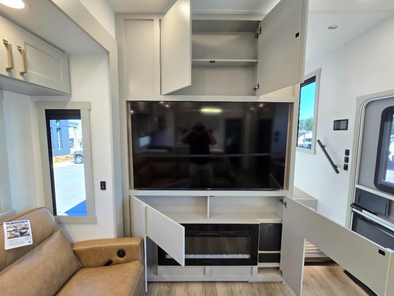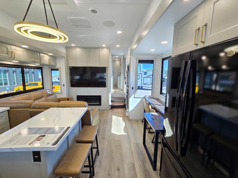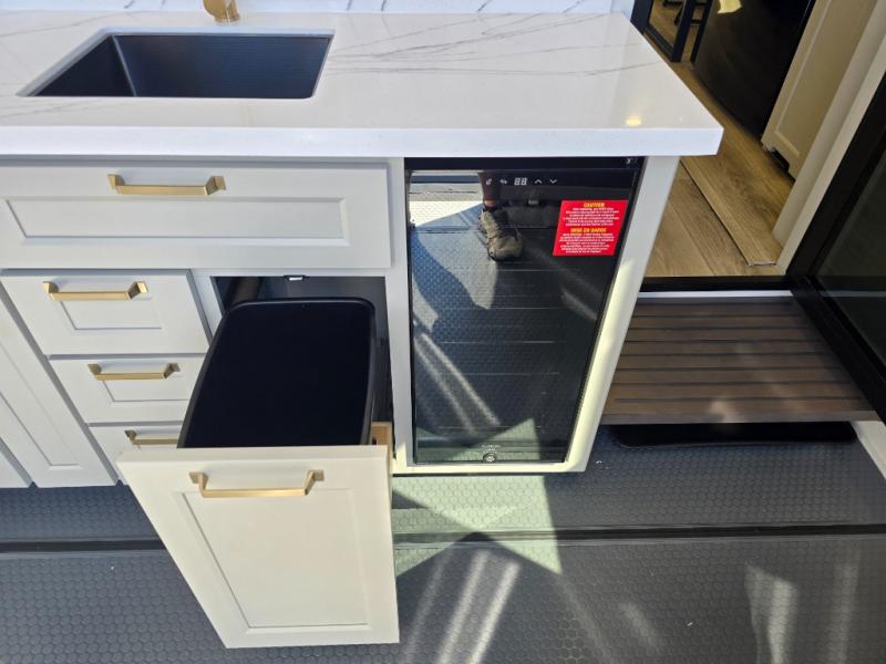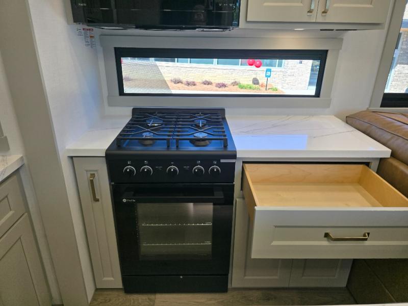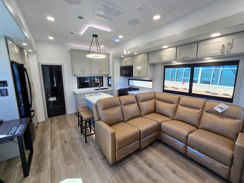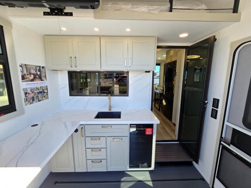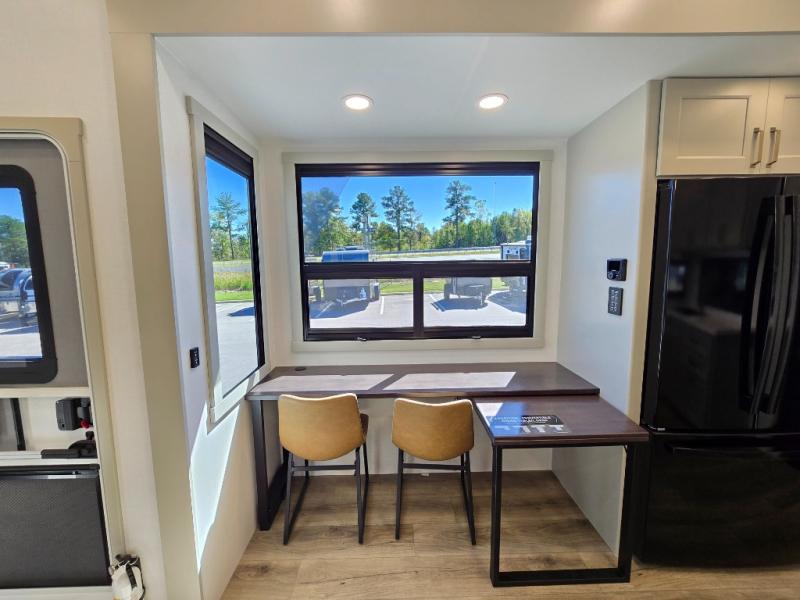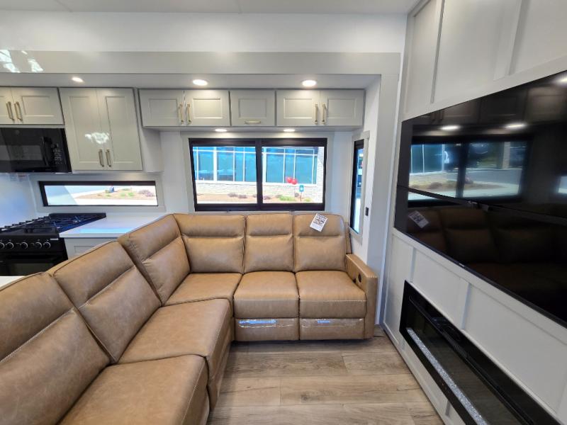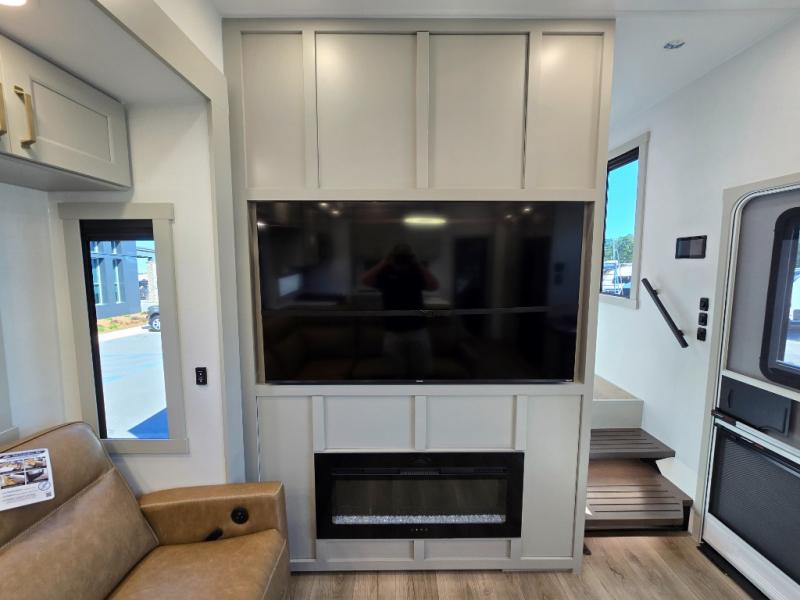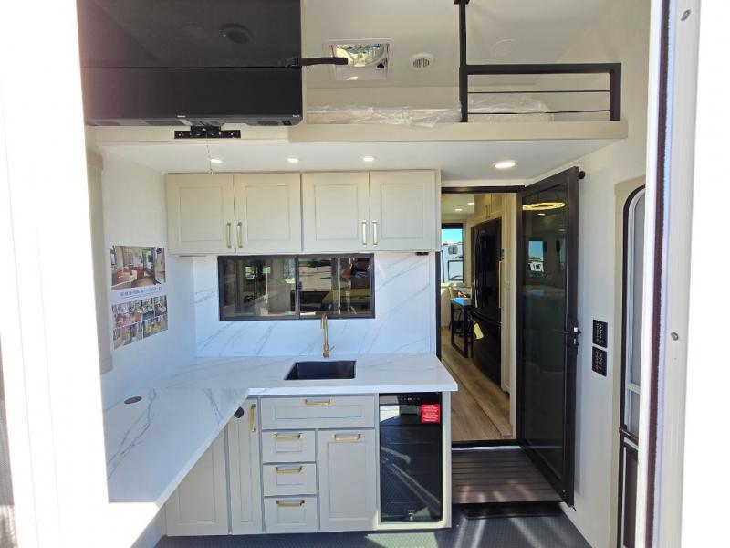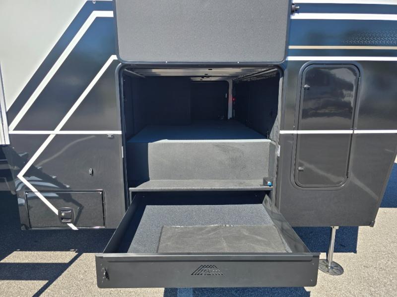 You can't imagine how much this toy hauler has to offer! The garage/outdoor kitchen/office space will allow you to utilize the garage how you need it, plus there is an adjustable tie-down system, as well as a loft for storage and a twin bed to sleep more campers! The garage patio with a 1,500 lb. capacity is another feature you are sure to love, especially with its own awning to keep you protected from the elements. Head to the kitchen to prepare meals with a 24" GE oven with a four burner range, a GE microwave with an air fryer, plus a spacious GE Energy Star 19 cu. ft. refrigerator. The island with two stools will let others visit with you while you cook, and there are even dog bowls to easily feed Frodo. You'll find the convertible dining table/L-desk will be accommodating since it can be use to dine at, and to get some work done. You may just find yourselves spending most of your time on the L-sofa in front of the entertainment center with a TV, fireplace and storage. A full bath is up front by the bedroom, and here you'll find a 30" x 42" shower and and pull-out linen storage with a trash bin to keep towels ready to use. After a day outdoors you'll love nothing more than coming back to your own bedroom with a king bed slide out, TV, a walk-in closet, and many more storage spaces. And we haven't even touched on the exterior features, like the 3-way pass-through storage, three power awnings, an air compressor to fill up tires, and the list goes on and on! This is a pre-production preview, all features and layout placement subject to change.