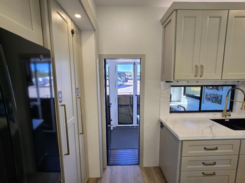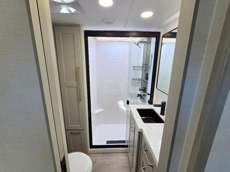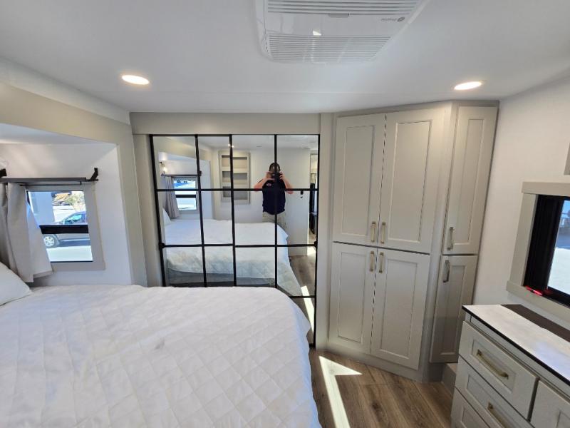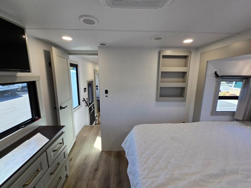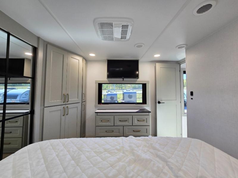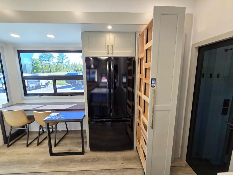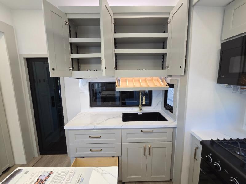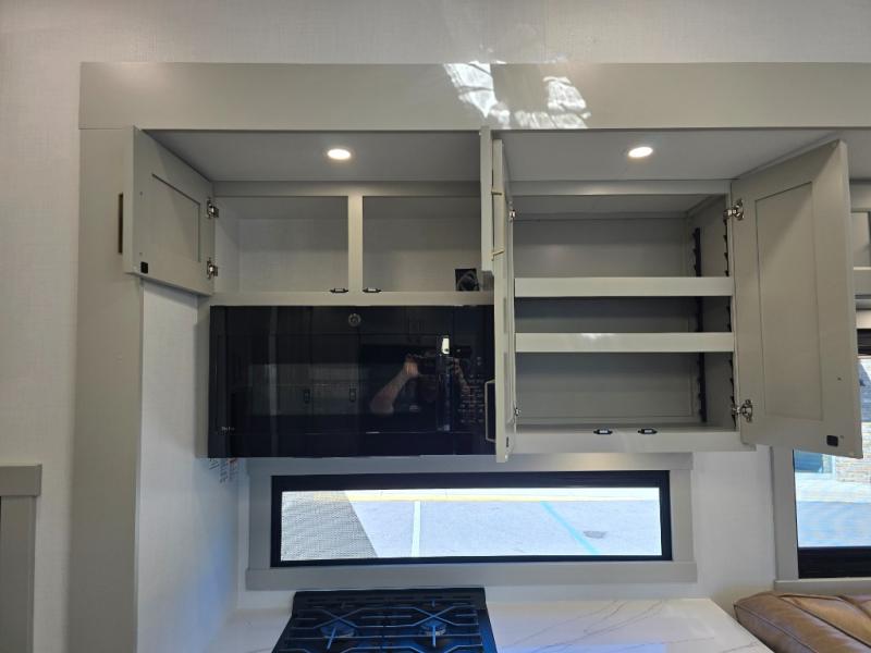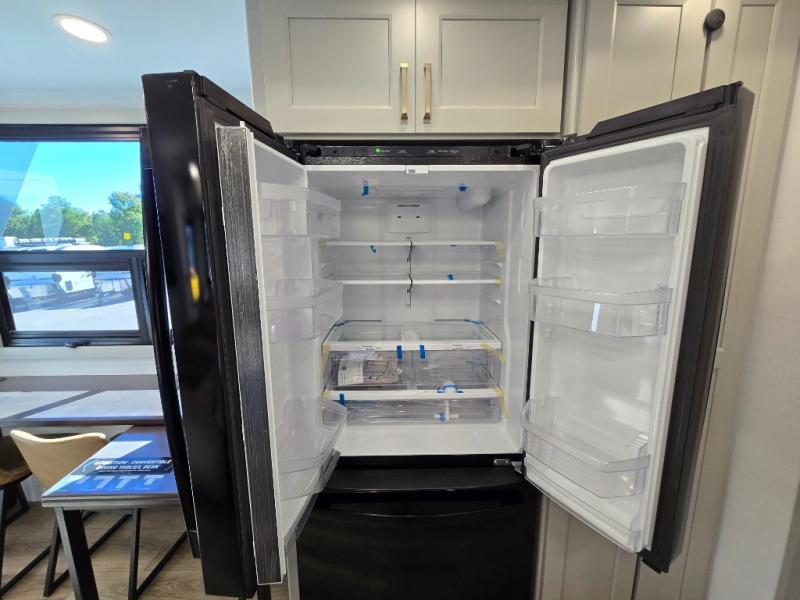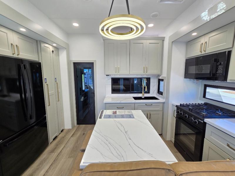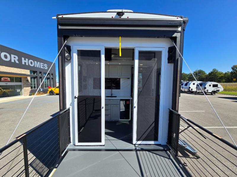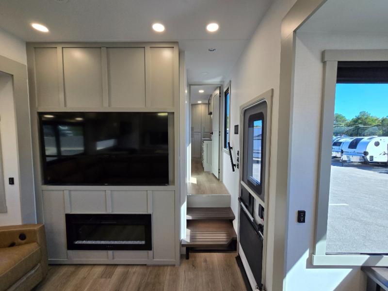 You can't imagine how much this toy hauler has to offer! The garage/outdoor kitchen/office space will allow you to utilize the garage how you need it, plus there is an adjustable tie-down system, as well as a loft for storage and a twin bed to sleep more campers! The garage patio with a 1,500 lb. capacity is another feature you are sure to love, especially with its own awning to keep you protected from the elements. Head to the kitchen to prepare meals with a 24" GE oven with a four burner range, a GE microwave with an air fryer, plus a spacious GE Energy Star 19 cu. ft. refrigerator. The island with two stools will let others visit with you while you cook, and there are even dog bowls to easily feed Frodo. You'll find the convertible dining table/L-desk will be accommodating since it can be use to dine at, and to get some work done. You may just find yourselves spending most of your time on the L-sofa in front of the entertainment center with a TV, fireplace and storage. A full bath is up front by the bedroom, and here you'll find a 30" x 42" shower and and pull-out linen storage with a trash bin to keep towels ready to use. After a day outdoors you'll love nothing more than coming back to your own bedroom with a king bed slide out, TV, a walk-in closet, and many more storage spaces. And we haven't even touched on the exterior features, like the 3-way pass-through storage, three power awnings, an air compressor to fill up tires, and the list goes on and on! This is a pre-production preview, all features and layout placement subject to change.