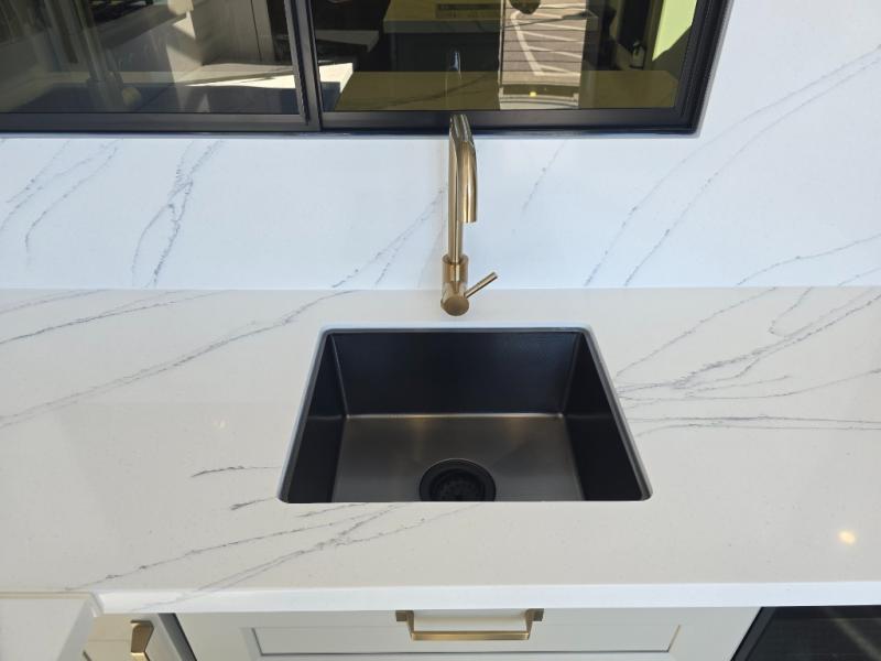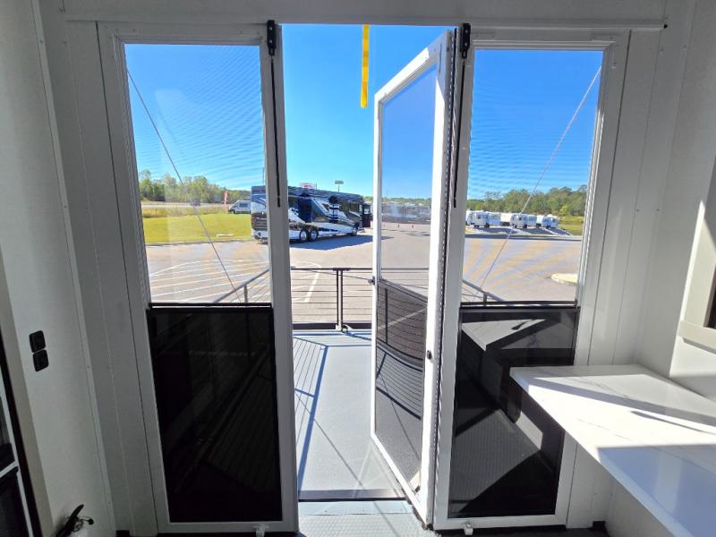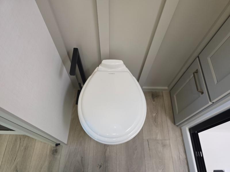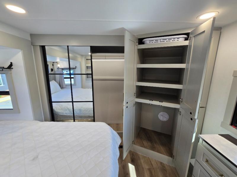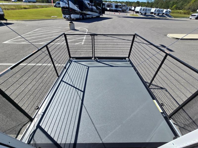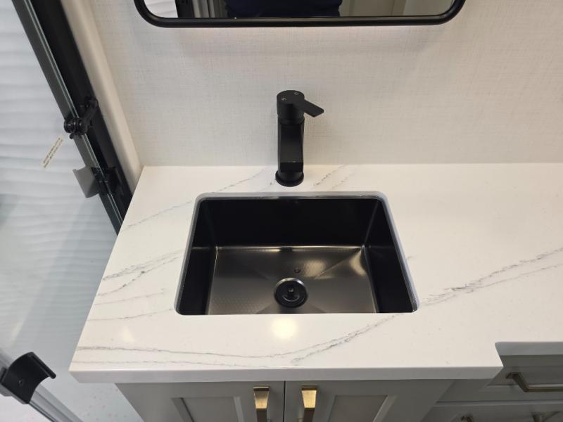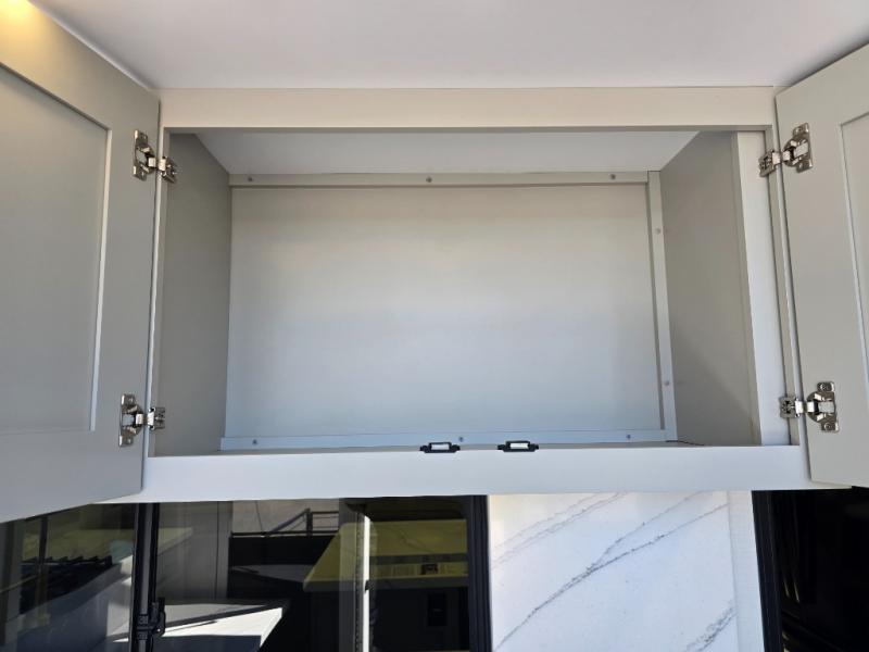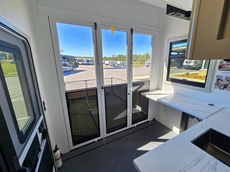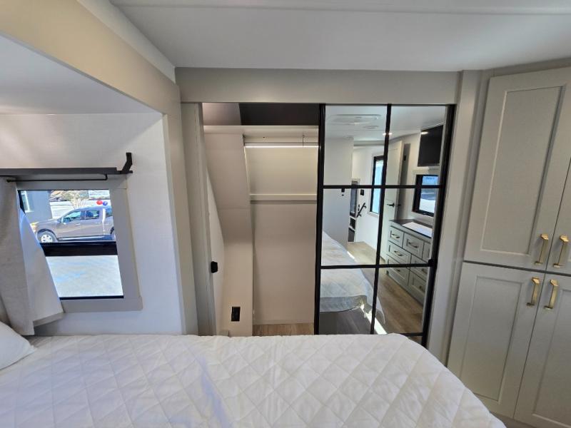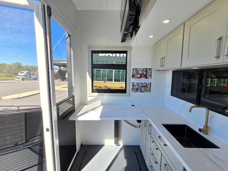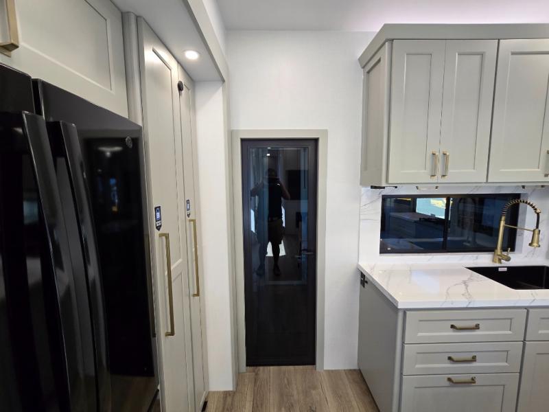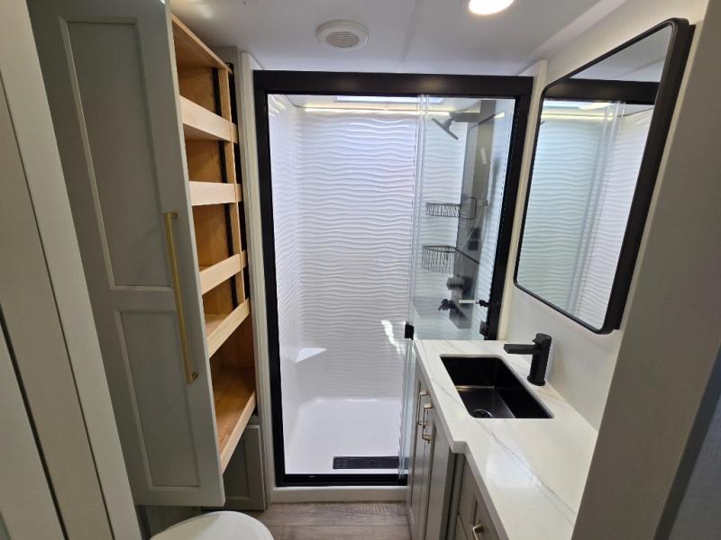 You can't imagine how much this toy hauler has to offer! The garage/outdoor kitchen/office space will allow you to utilize the garage how you need it, plus there is an adjustable tie-down system, as well as a loft for storage and a twin bed to sleep more campers! The garage patio with a 1,500 lb. capacity is another feature you are sure to love, especially with its own awning to keep you protected from the elements. Head to the kitchen to prepare meals with a 24" GE oven with a four burner range, a GE microwave with an air fryer, plus a spacious GE Energy Star 19 cu. ft. refrigerator. The island with two stools will let others visit with you while you cook, and there are even dog bowls to easily feed Frodo. You'll find the convertible dining table/L-desk will be accommodating since it can be use to dine at, and to get some work done. You may just find yourselves spending most of your time on the L-sofa in front of the entertainment center with a TV, fireplace and storage. A full bath is up front by the bedroom, and here you'll find a 30" x 42" shower and and pull-out linen storage with a trash bin to keep towels ready to use. After a day outdoors you'll love nothing more than coming back to your own bedroom with a king bed slide out, TV, a walk-in closet, and many more storage spaces. And we haven't even touched on the exterior features, like the 3-way pass-through storage, three power awnings, an air compressor to fill up tires, and the list goes on and on! This is a pre-production preview, all features and layout placement subject to change.