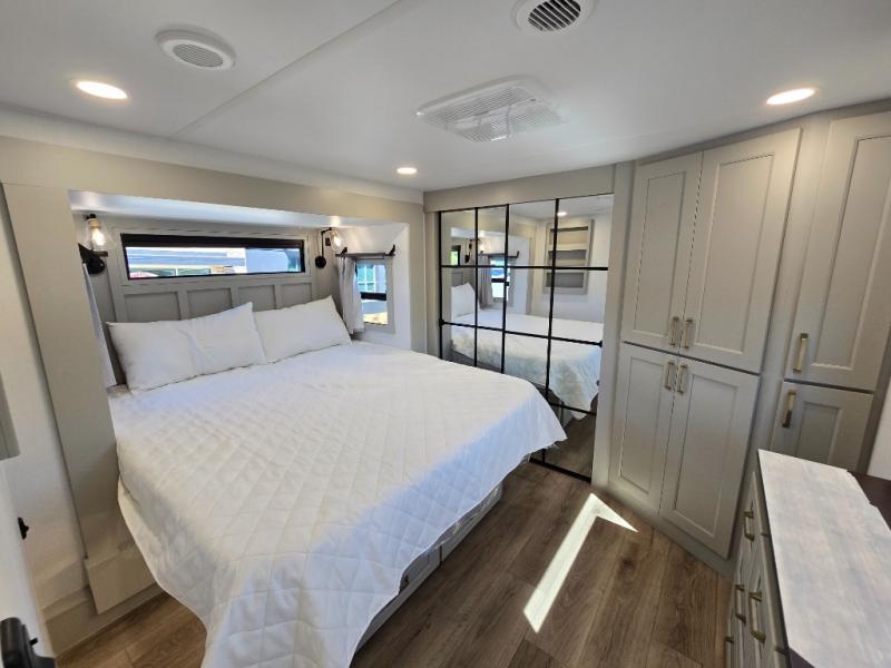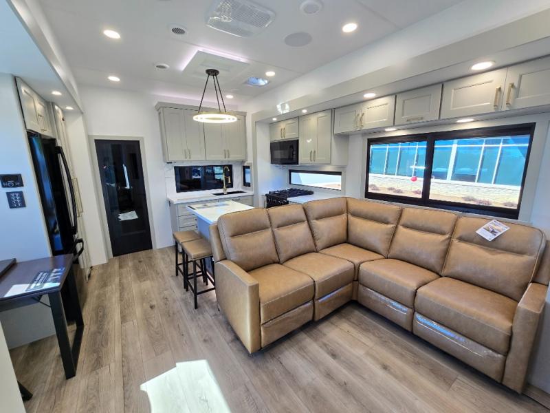 With any Model G toy hauler fifth wheel by Brinkley you will enjoy luxurious amenities, tons of storage space, and innovative features that have been developed and tested in the real world. Durable construction includes an industry leading PDI process, an industry best insulation package, and reinforced and walkable slide roofs. Some of the exterior features you'll find are a 3-way pass-through with a multi-functional flip-up bulkhead wall, under I-beam storage, a MAX-Vision reverse lighting system, and a low-maintenance roof to name a few. A Rockford Fosgate audio system comes standard, along with a Full app-based coach control system (iOS & Android) that lets you control your fifth wheel's functions right from your mobile device. You will find the solar system with a designated storage area to be ultra convenient, plus there is a FlexPower 5500 with a dual fuel inverter generator for all your power needs. Head inside to find a residential interior with Brinkley's CraftSense wood trim construction, floating entrance steps, integrated window screens and insulated blackout blinds, and residential solid surface countertops plus backsplash. You will also enjoy the neon shower lighting and recessed medicine cabinets in the bath, plus motion activated LED bed lights and dual bedside outlets in the bedroom. Choose a Model G toy hauler fifth wheel to experience all the luxury it has to offer!