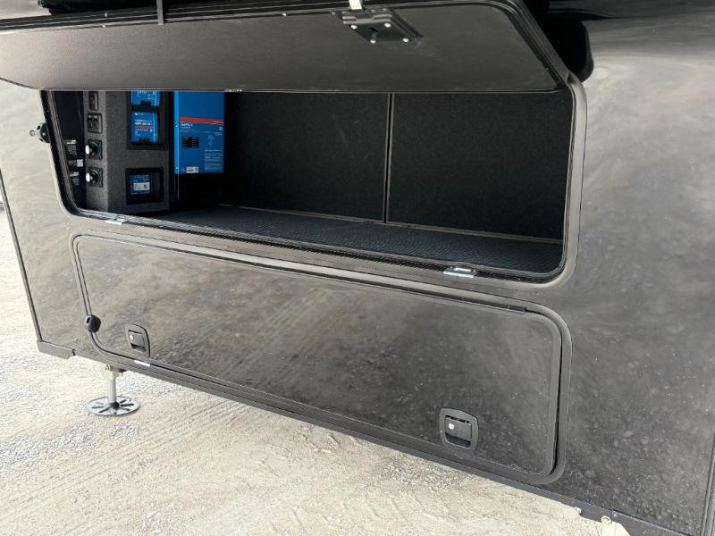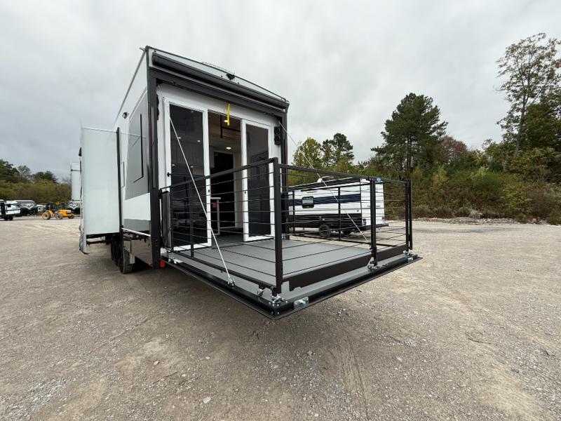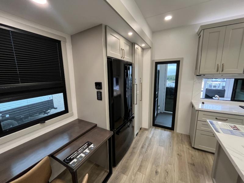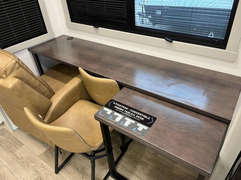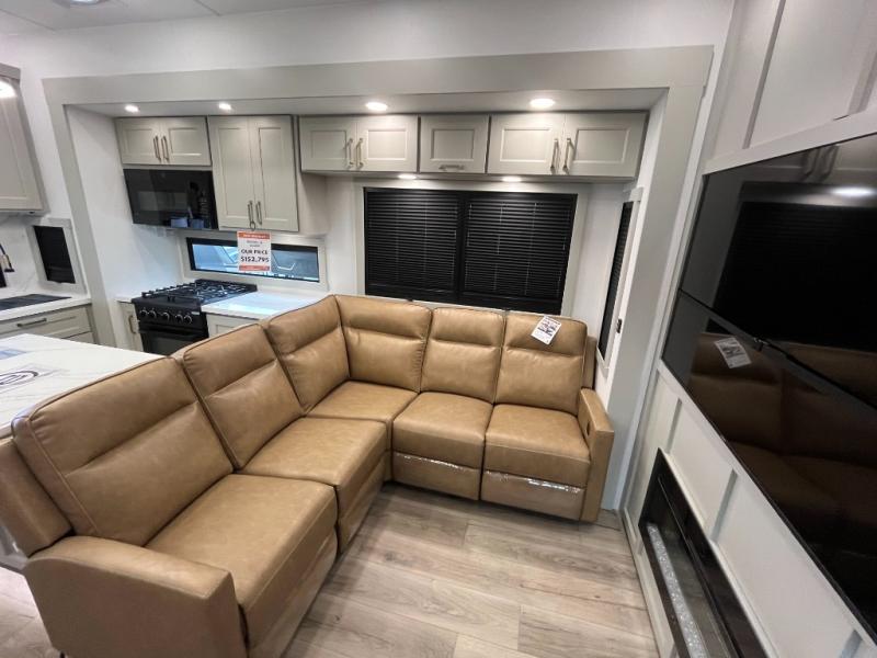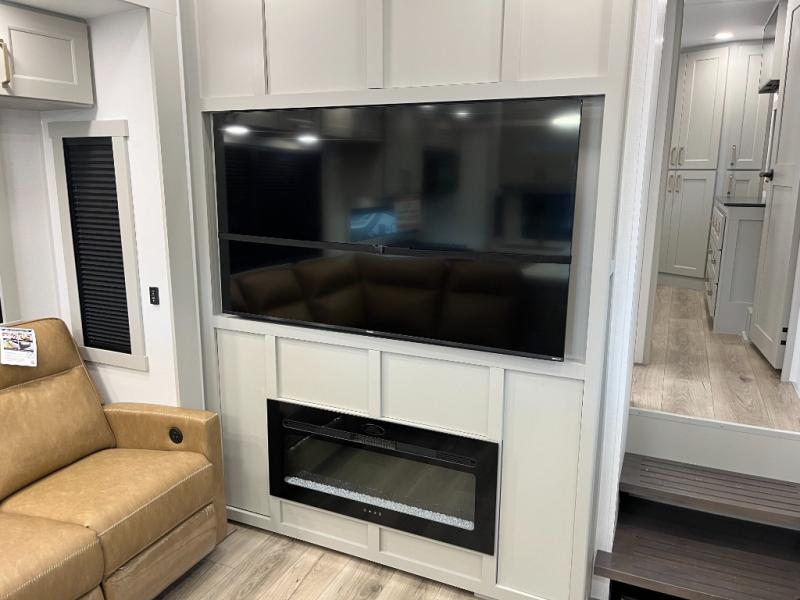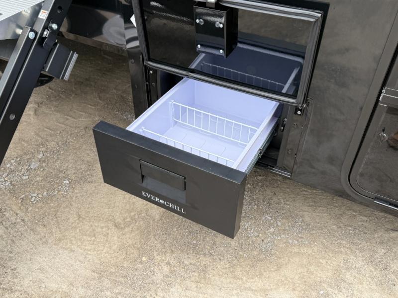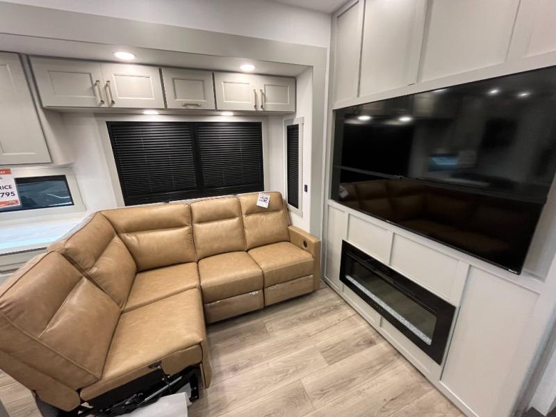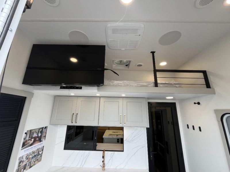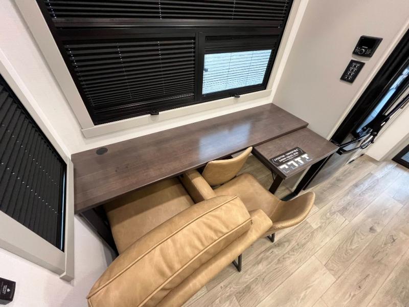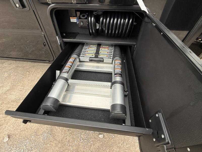 You can't imagine how much this toy hauler has to offer! The garage/outdoor kitchen/office space will allow you to utilize the garage how you need it, plus there is an adjustable tie-down system, as well as a loft for storage and a twin bed to sleep more campers! The garage patio with a 1,500 lb. capacity is another feature you are sure to love, especially with its own awning to keep you protected from the elements. Head to the kitchen to prepare meals with a 24" GE oven with a four burner range, a GE microwave with an air fryer, plus a spacious GE Energy Star 19 cu. ft. refrigerator. The island with two stools will let others visit with you while you cook, and there are even dog bowls to easily feed Frodo. You'll find the convertible dining table/L-desk will be accommodating since it can be use to dine at, and to get some work done. You may just find yourselves spending most of your time on the L-sofa in front of the entertainment center with a TV, fireplace and storage. A full bath is up front by the bedroom, and here you'll find a 30" x 42" shower and and pull-out linen storage with a trash bin to keep towels ready to use. After a day outdoors you'll love nothing more than coming back to your own bedroom with a king bed slide out, TV, a walk-in closet, and many more storage spaces. And we haven't even touched on the exterior features, like the 3-way pass-through storage, three power awnings, an air compressor to fill up tires, and the list goes on and on! This is a pre-production preview, all features and layout placement subject to change.