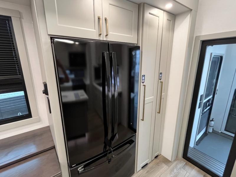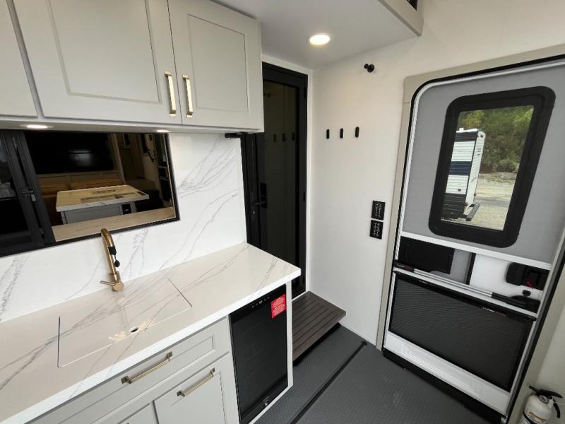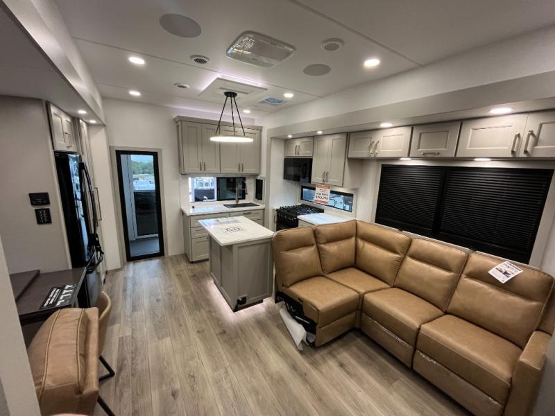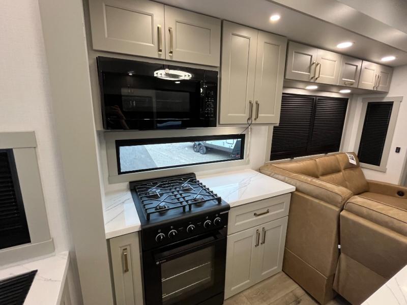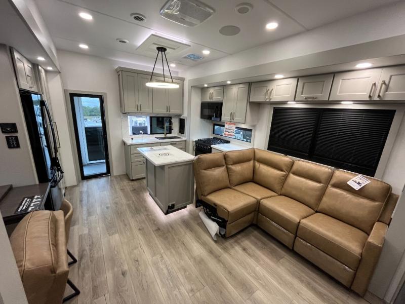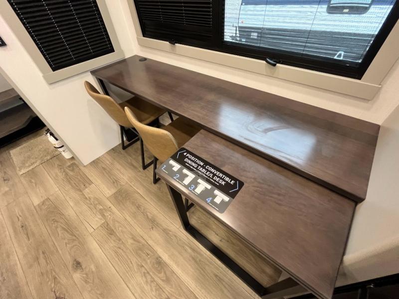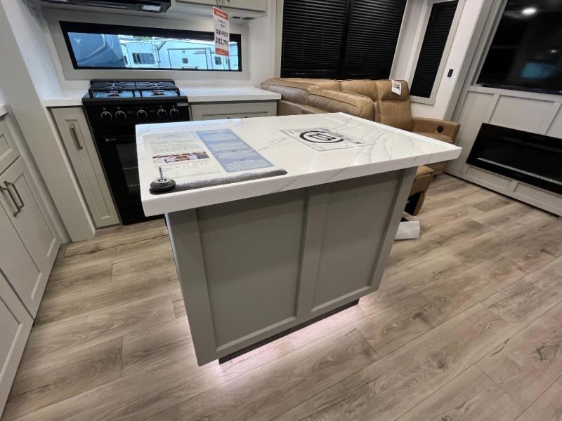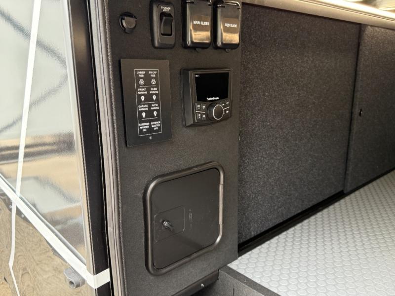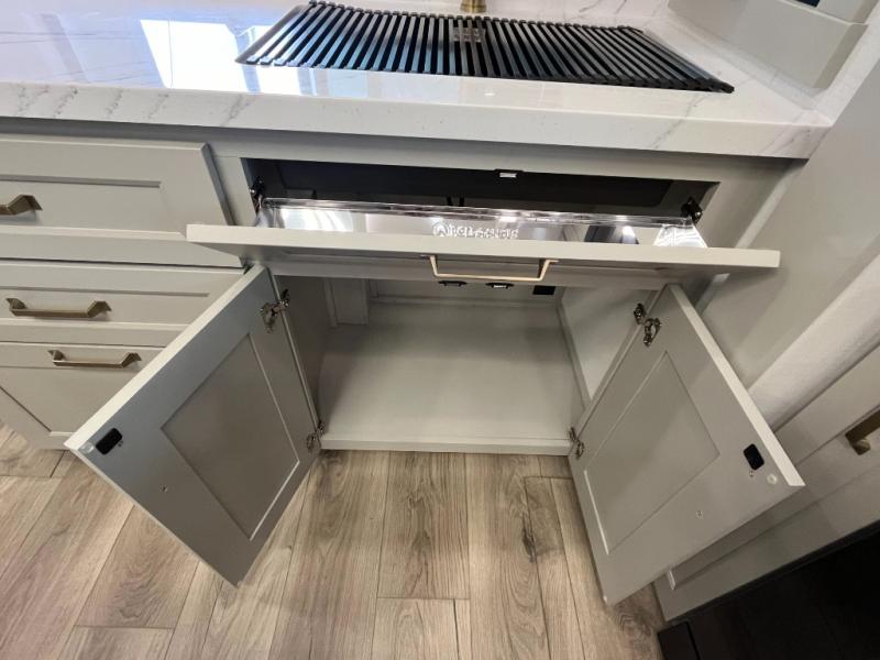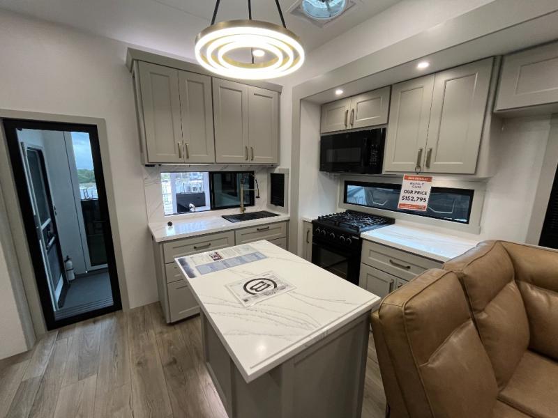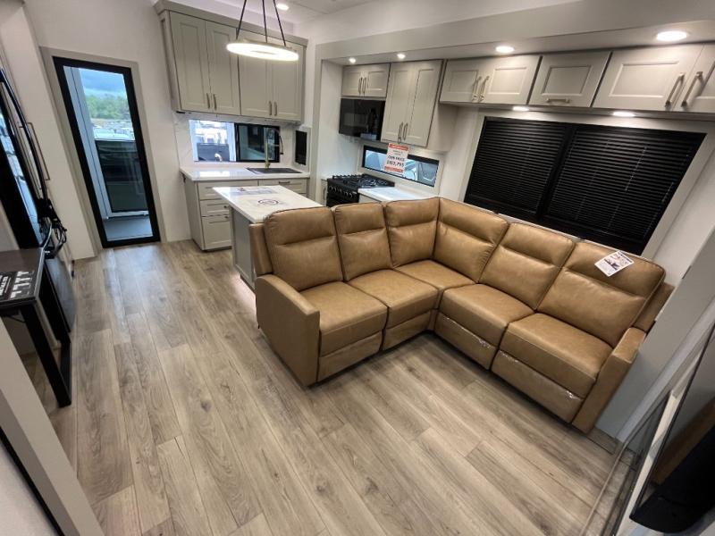 You can't imagine how much this toy hauler has to offer! The garage/outdoor kitchen/office space will allow you to utilize the garage how you need it, plus there is an adjustable tie-down system, as well as a loft for storage and a twin bed to sleep more campers! The garage patio with a 1,500 lb. capacity is another feature you are sure to love, especially with its own awning to keep you protected from the elements. Head to the kitchen to prepare meals with a 24" GE oven with a four burner range, a GE microwave with an air fryer, plus a spacious GE Energy Star 19 cu. ft. refrigerator. The island with two stools will let others visit with you while you cook, and there are even dog bowls to easily feed Frodo. You'll find the convertible dining table/L-desk will be accommodating since it can be use to dine at, and to get some work done. You may just find yourselves spending most of your time on the L-sofa in front of the entertainment center with a TV, fireplace and storage. A full bath is up front by the bedroom, and here you'll find a 30" x 42" shower and and pull-out linen storage with a trash bin to keep towels ready to use. After a day outdoors you'll love nothing more than coming back to your own bedroom with a king bed slide out, TV, a walk-in closet, and many more storage spaces. And we haven't even touched on the exterior features, like the 3-way pass-through storage, three power awnings, an air compressor to fill up tires, and the list goes on and on! This is a pre-production preview, all features and layout placement subject to change.