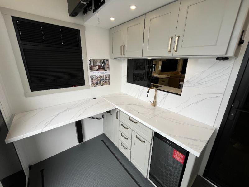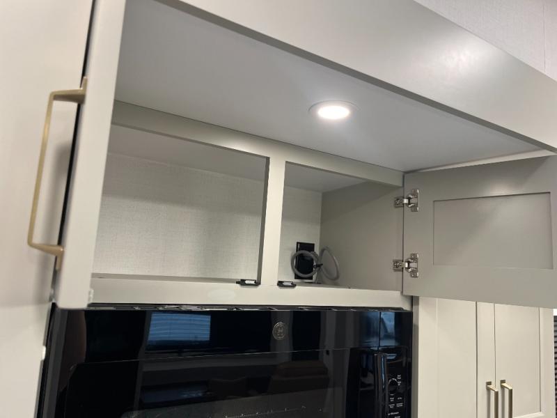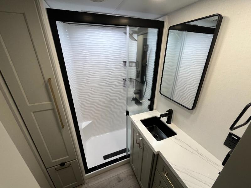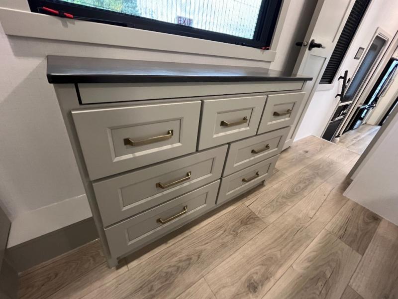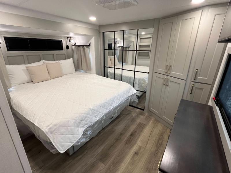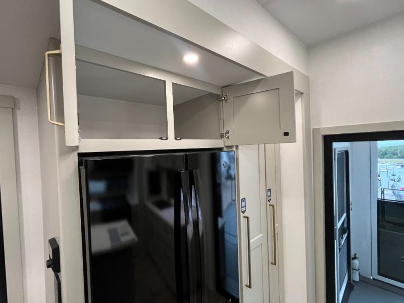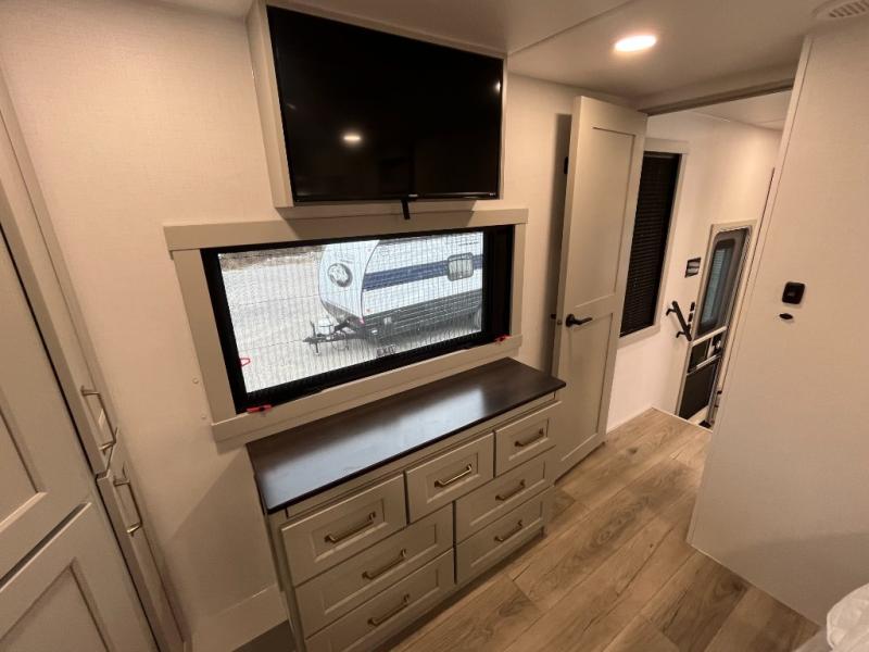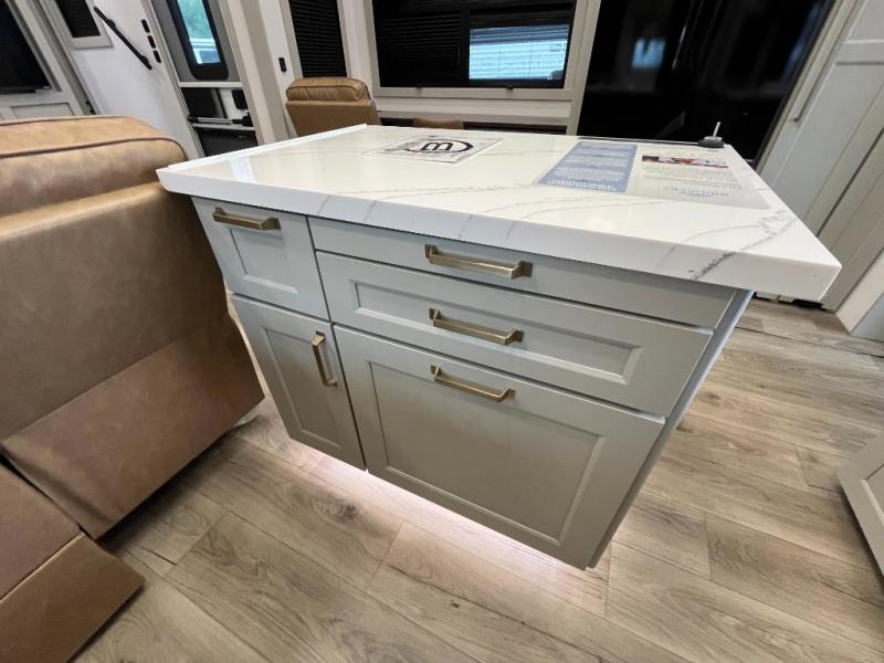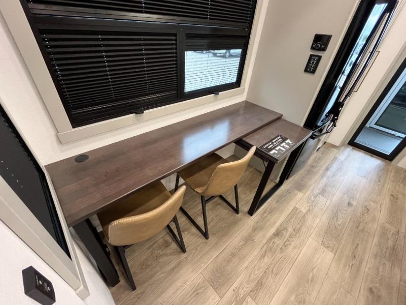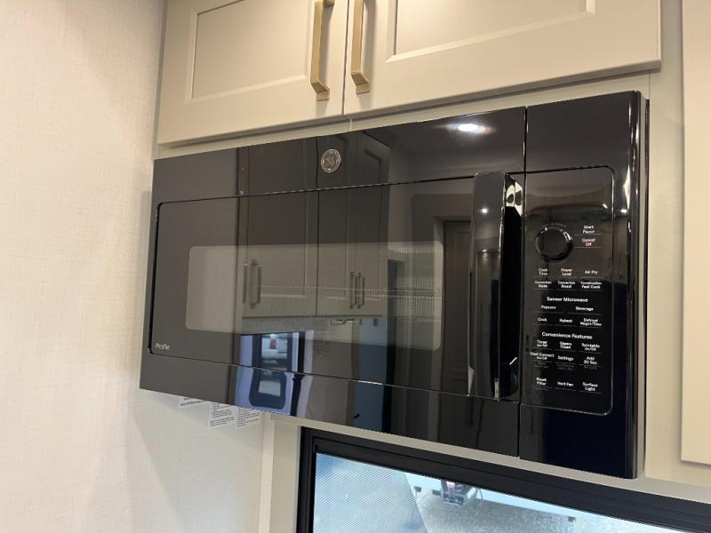 You can't imagine how much this toy hauler has to offer! The garage/outdoor kitchen/office space will allow you to utilize the garage how you need it, plus there is an adjustable tie-down system, as well as a loft for storage and a twin bed to sleep more campers! The garage patio with a 1,500 lb. capacity is another feature you are sure to love, especially with its own awning to keep you protected from the elements. Head to the kitchen to prepare meals with a 24" GE oven with a four burner range, a GE microwave with an air fryer, plus a spacious GE Energy Star 19 cu. ft. refrigerator. The island with two stools will let others visit with you while you cook, and there are even dog bowls to easily feed Frodo. You'll find the convertible dining table/L-desk will be accommodating since it can be use to dine at, and to get some work done. You may just find yourselves spending most of your time on the L-sofa in front of the entertainment center with a TV, fireplace and storage. A full bath is up front by the bedroom, and here you'll find a 30" x 42" shower and and pull-out linen storage with a trash bin to keep towels ready to use. After a day outdoors you'll love nothing more than coming back to your own bedroom with a king bed slide out, TV, a walk-in closet, and many more storage spaces. And we haven't even touched on the exterior features, like the 3-way pass-through storage, three power awnings, an air compressor to fill up tires, and the list goes on and on! This is a pre-production preview, all features and layout placement subject to change.