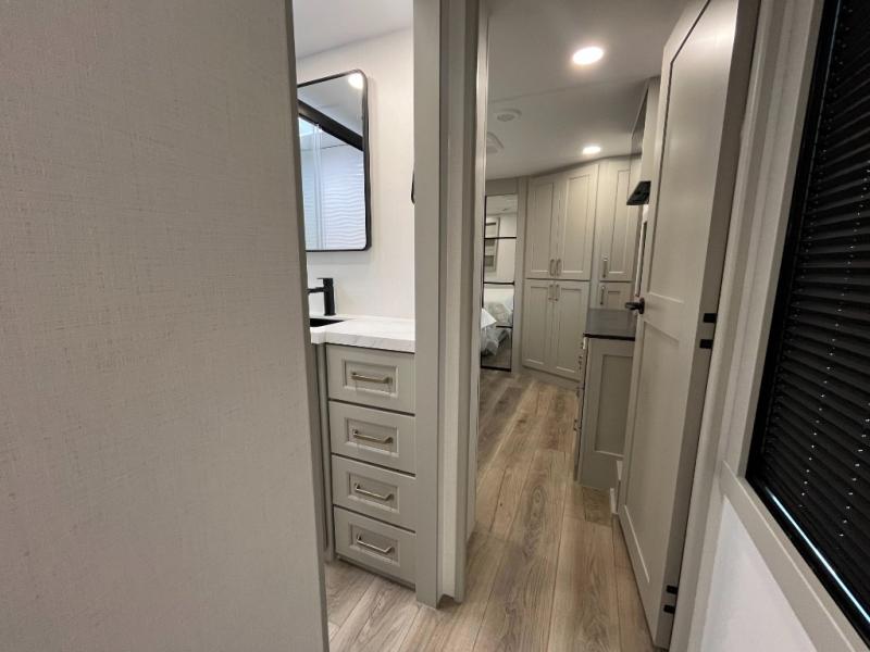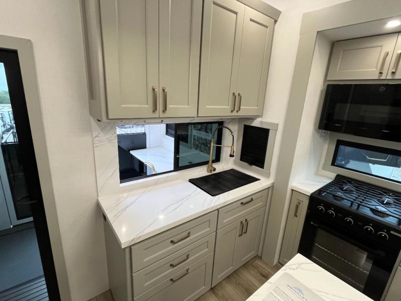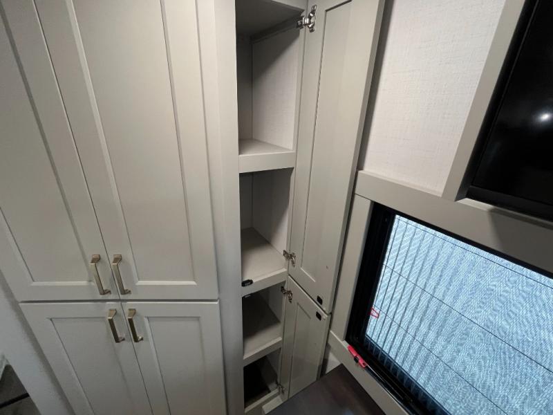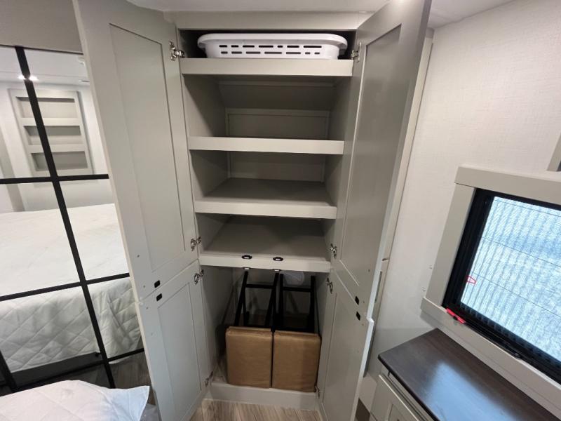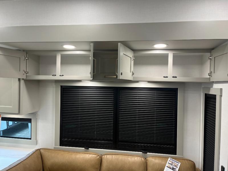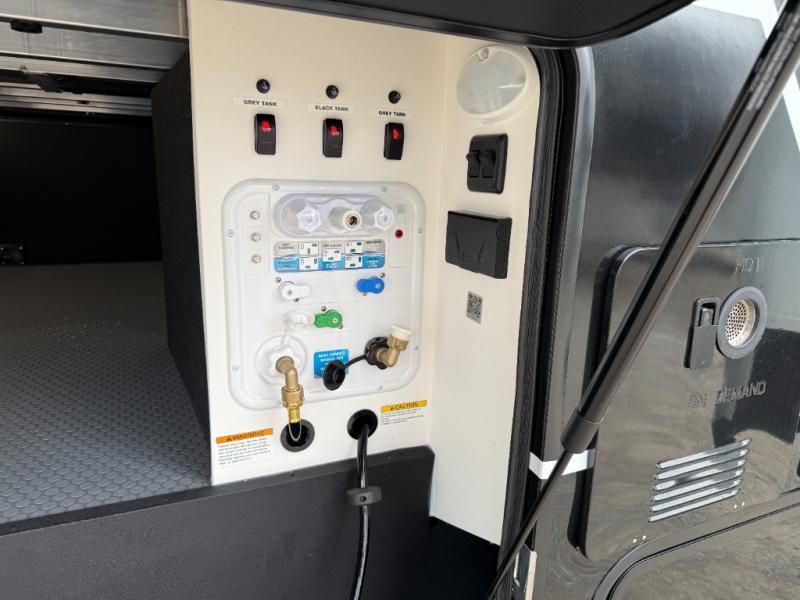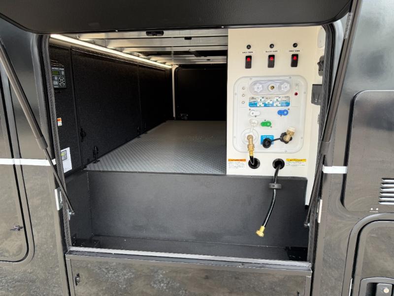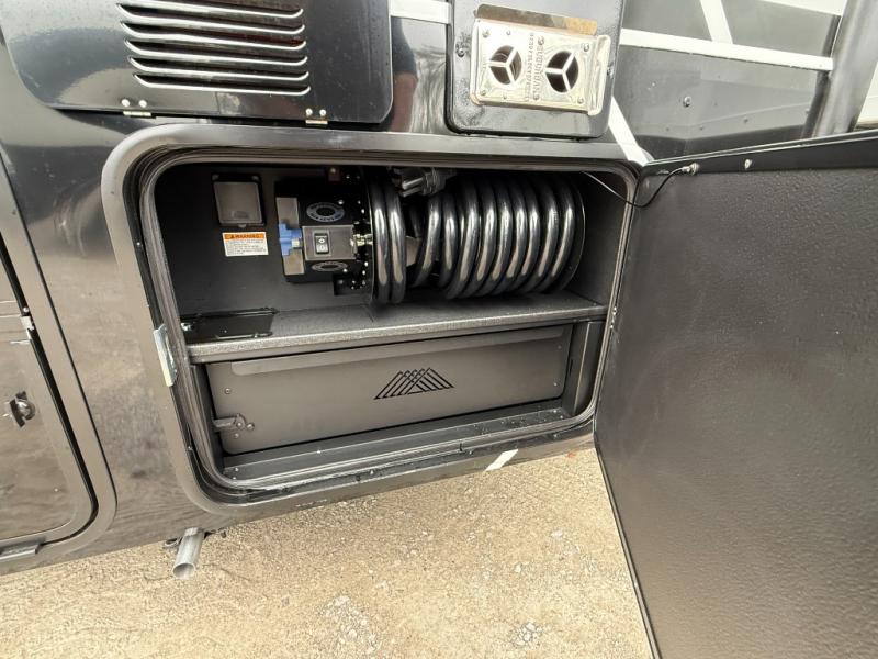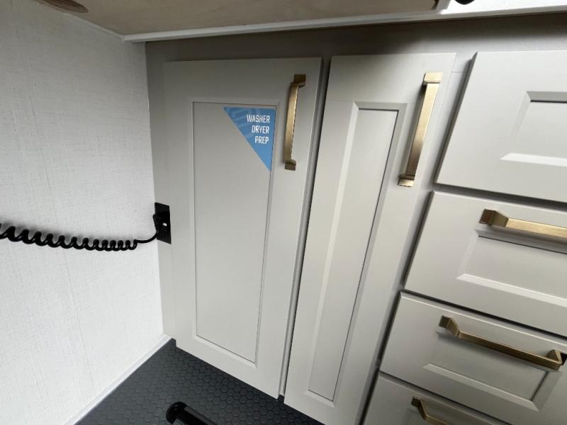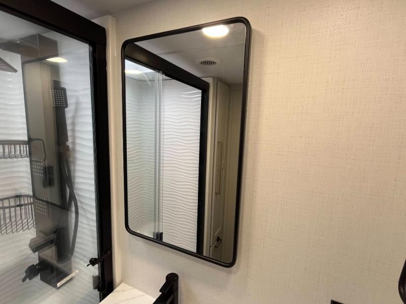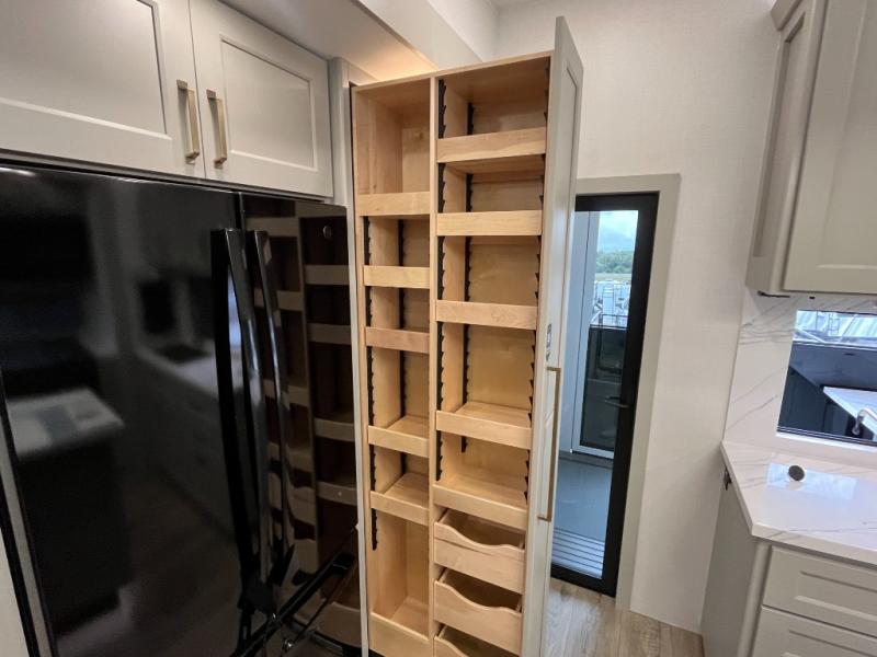 You can't imagine how much this toy hauler has to offer! The garage/outdoor kitchen/office space will allow you to utilize the garage how you need it, plus there is an adjustable tie-down system, as well as a loft for storage and a twin bed to sleep more campers! The garage patio with a 1,500 lb. capacity is another feature you are sure to love, especially with its own awning to keep you protected from the elements. Head to the kitchen to prepare meals with a 24" GE oven with a four burner range, a GE microwave with an air fryer, plus a spacious GE Energy Star 19 cu. ft. refrigerator. The island with two stools will let others visit with you while you cook, and there are even dog bowls to easily feed Frodo. You'll find the convertible dining table/L-desk will be accommodating since it can be use to dine at, and to get some work done. You may just find yourselves spending most of your time on the L-sofa in front of the entertainment center with a TV, fireplace and storage. A full bath is up front by the bedroom, and here you'll find a 30" x 42" shower and and pull-out linen storage with a trash bin to keep towels ready to use. After a day outdoors you'll love nothing more than coming back to your own bedroom with a king bed slide out, TV, a walk-in closet, and many more storage spaces. And we haven't even touched on the exterior features, like the 3-way pass-through storage, three power awnings, an air compressor to fill up tires, and the list goes on and on! This is a pre-production preview, all features and layout placement subject to change.