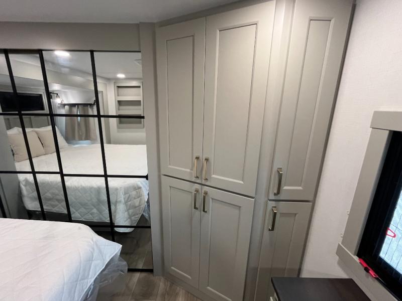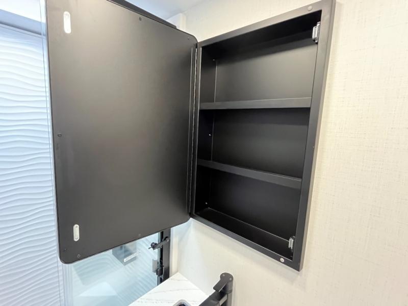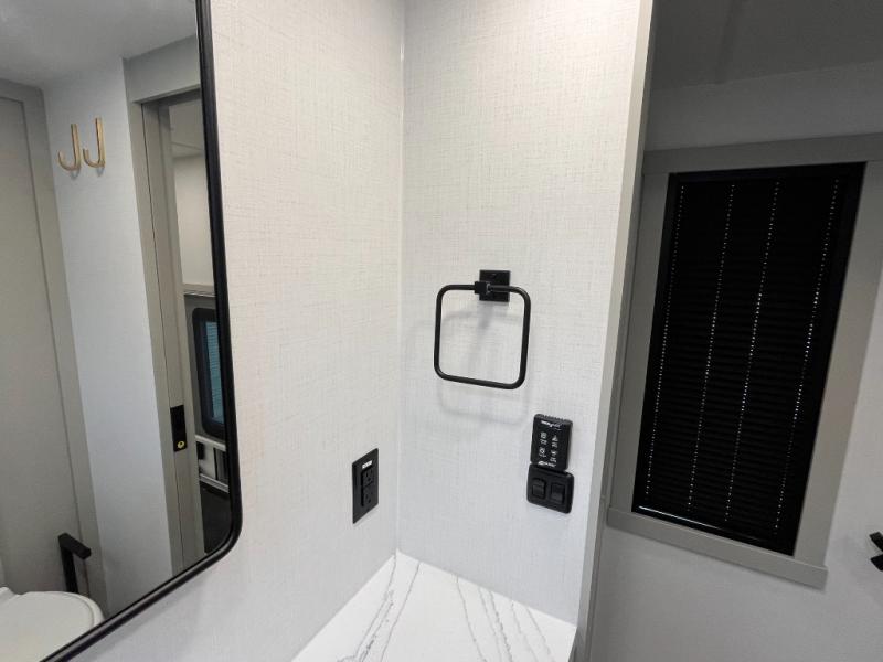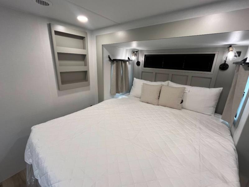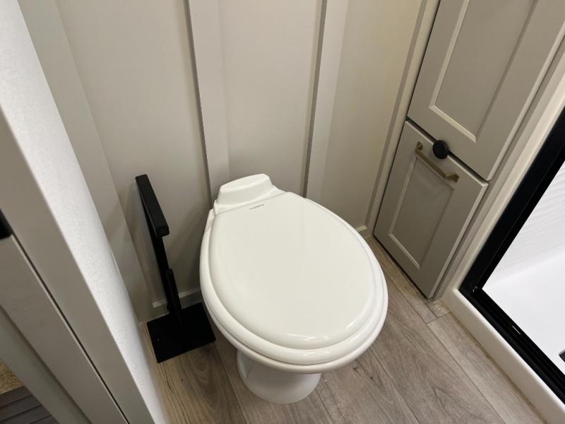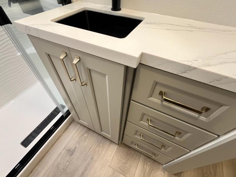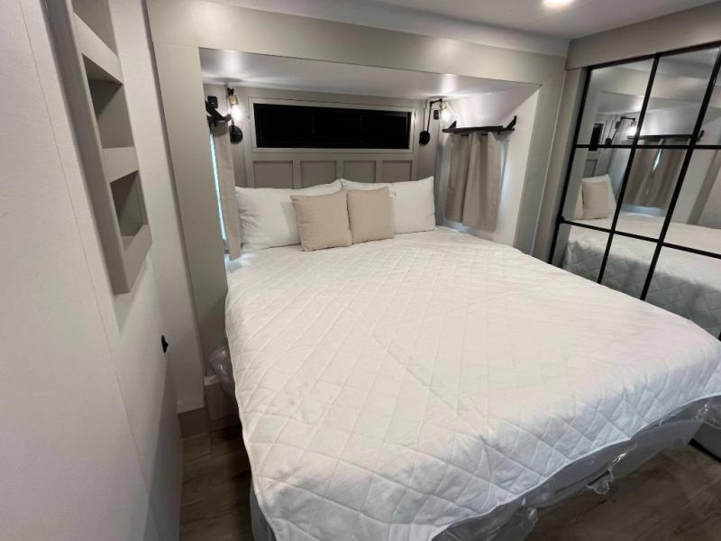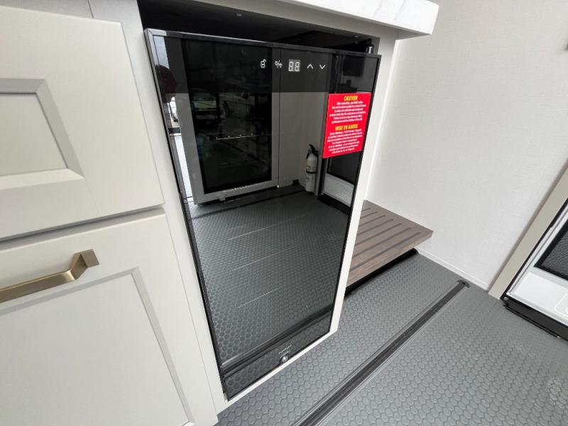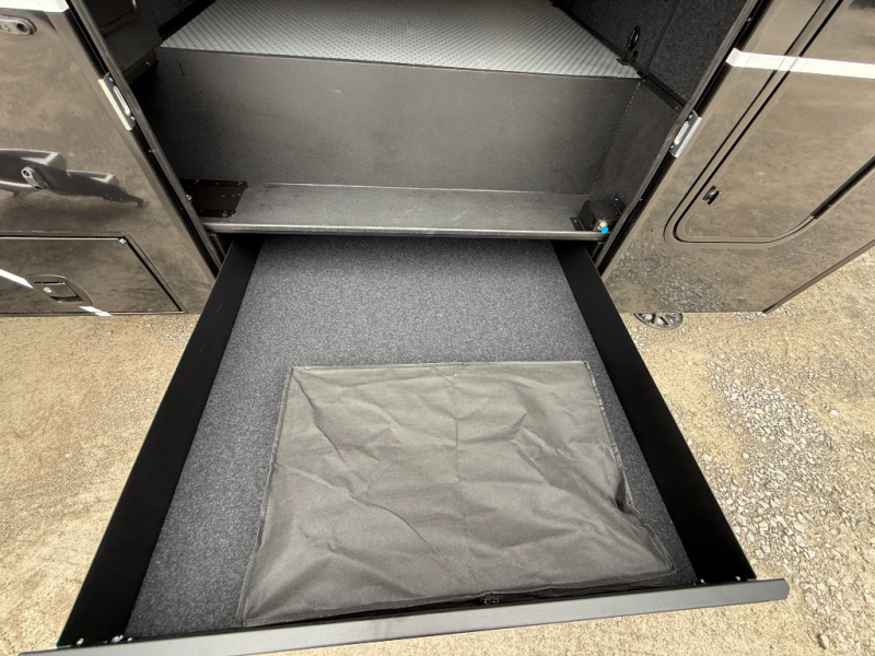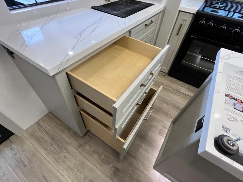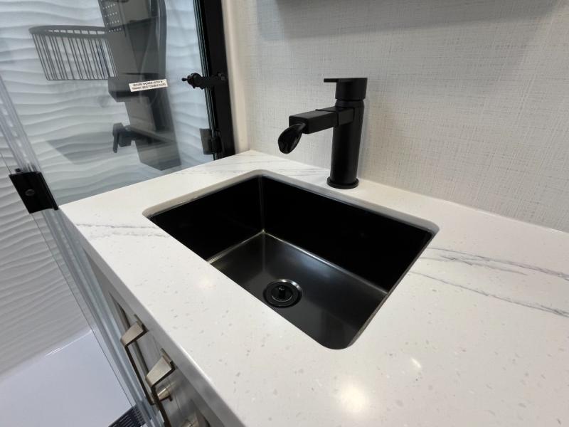 You can't imagine how much this toy hauler has to offer! The garage/outdoor kitchen/office space will allow you to utilize the garage how you need it, plus there is an adjustable tie-down system, as well as a loft for storage and a twin bed to sleep more campers! The garage patio with a 1,500 lb. capacity is another feature you are sure to love, especially with its own awning to keep you protected from the elements. Head to the kitchen to prepare meals with a 24" GE oven with a four burner range, a GE microwave with an air fryer, plus a spacious GE Energy Star 19 cu. ft. refrigerator. The island with two stools will let others visit with you while you cook, and there are even dog bowls to easily feed Frodo. You'll find the convertible dining table/L-desk will be accommodating since it can be use to dine at, and to get some work done. You may just find yourselves spending most of your time on the L-sofa in front of the entertainment center with a TV, fireplace and storage. A full bath is up front by the bedroom, and here you'll find a 30" x 42" shower and and pull-out linen storage with a trash bin to keep towels ready to use. After a day outdoors you'll love nothing more than coming back to your own bedroom with a king bed slide out, TV, a walk-in closet, and many more storage spaces. And we haven't even touched on the exterior features, like the 3-way pass-through storage, three power awnings, an air compressor to fill up tires, and the list goes on and on! This is a pre-production preview, all features and layout placement subject to change.