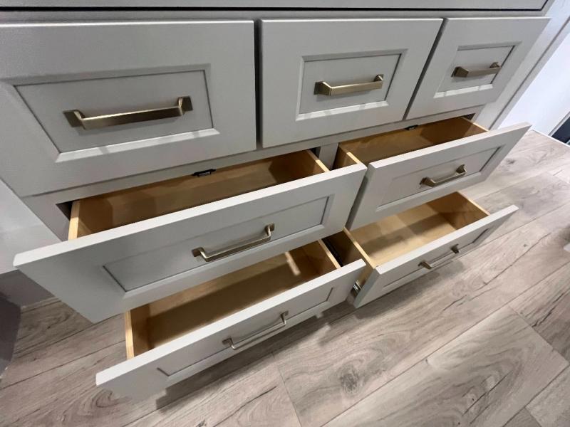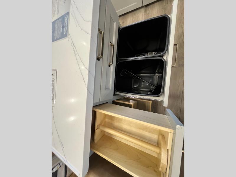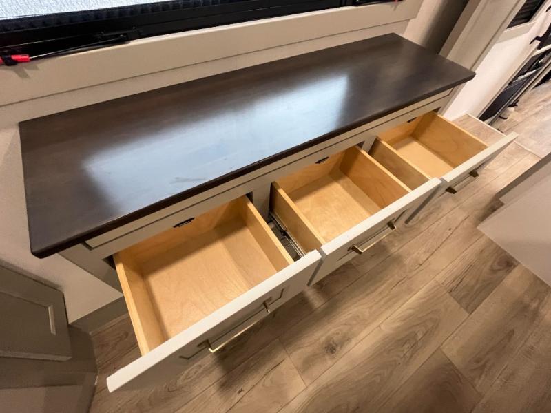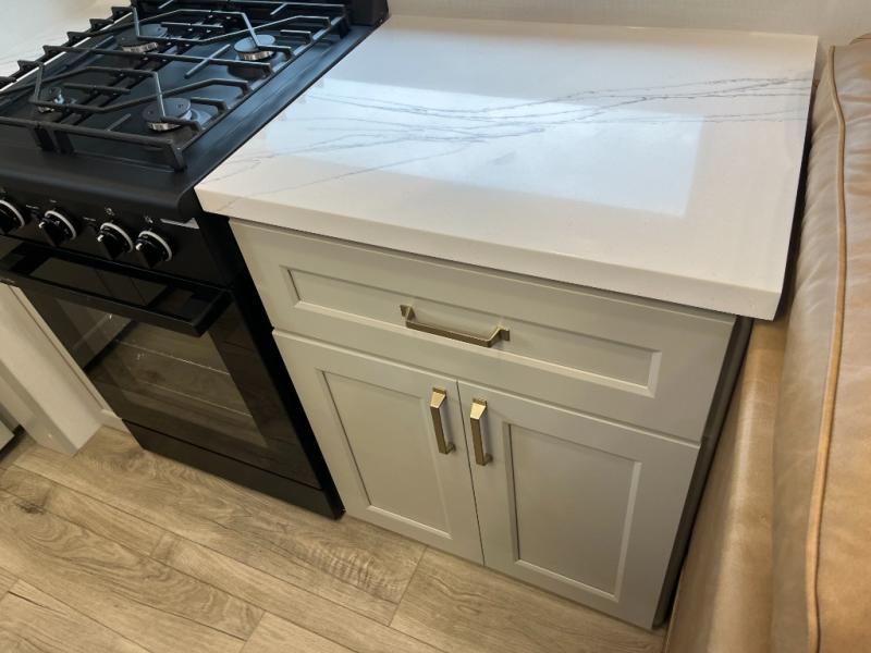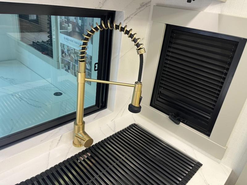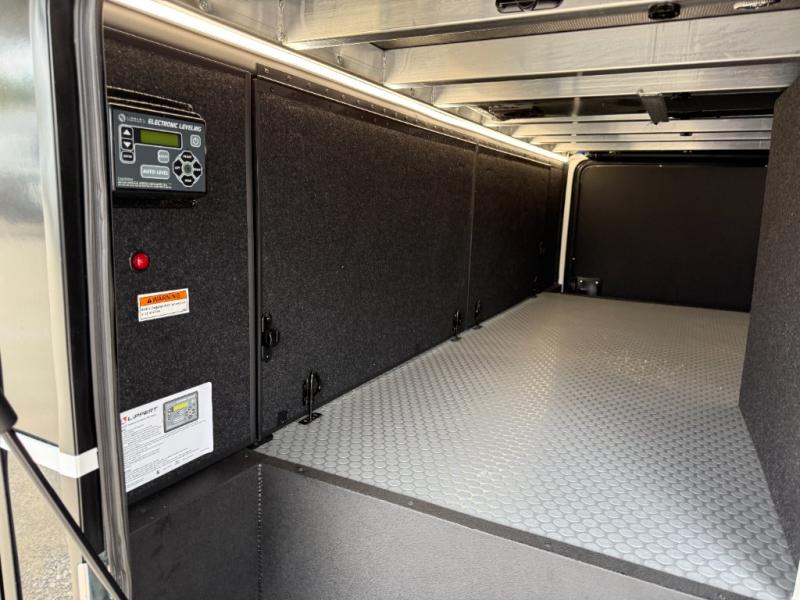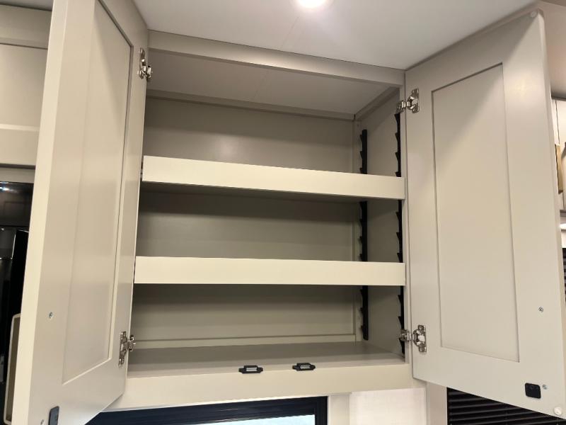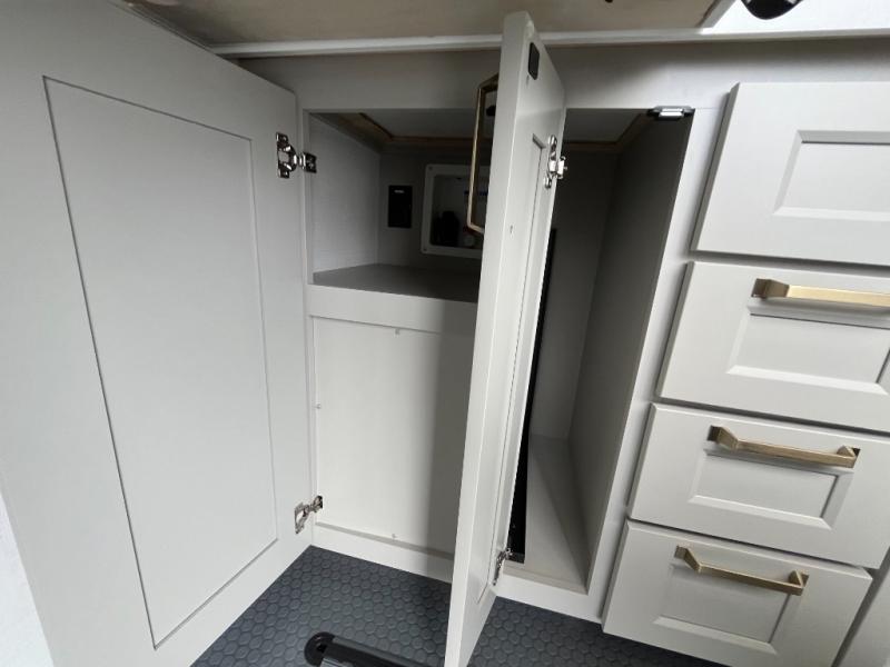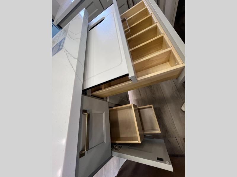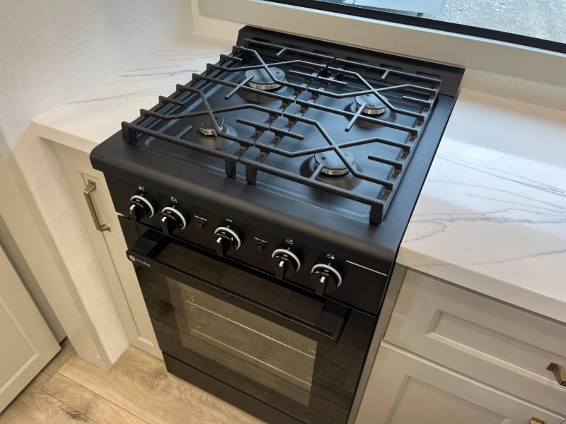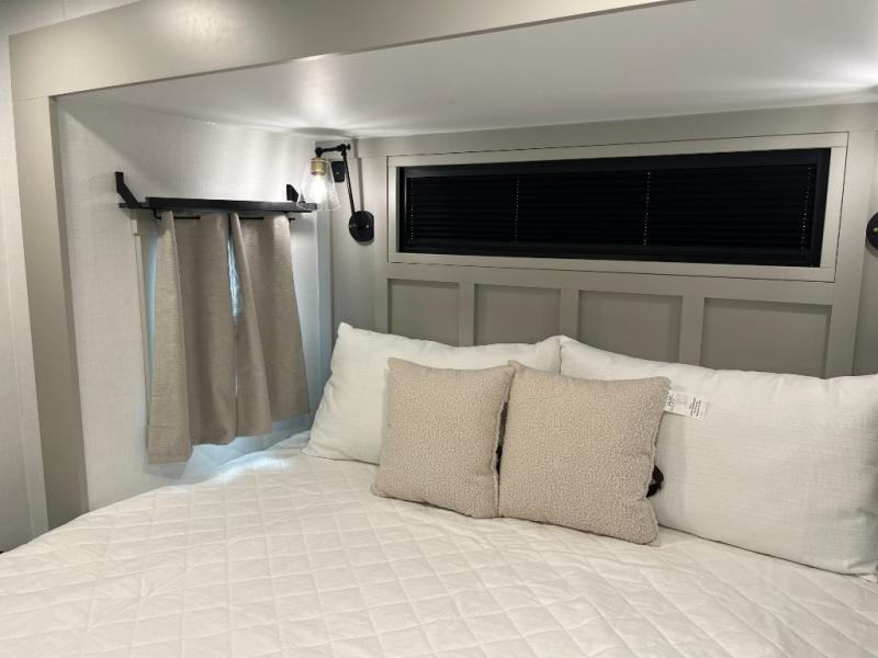 You can't imagine how much this toy hauler has to offer! The garage/outdoor kitchen/office space will allow you to utilize the garage how you need it, plus there is an adjustable tie-down system, as well as a loft for storage and a twin bed to sleep more campers! The garage patio with a 1,500 lb. capacity is another feature you are sure to love, especially with its own awning to keep you protected from the elements. Head to the kitchen to prepare meals with a 24" GE oven with a four burner range, a GE microwave with an air fryer, plus a spacious GE Energy Star 19 cu. ft. refrigerator. The island with two stools will let others visit with you while you cook, and there are even dog bowls to easily feed Frodo. You'll find the convertible dining table/L-desk will be accommodating since it can be use to dine at, and to get some work done. You may just find yourselves spending most of your time on the L-sofa in front of the entertainment center with a TV, fireplace and storage. A full bath is up front by the bedroom, and here you'll find a 30" x 42" shower and and pull-out linen storage with a trash bin to keep towels ready to use. After a day outdoors you'll love nothing more than coming back to your own bedroom with a king bed slide out, TV, a walk-in closet, and many more storage spaces. And we haven't even touched on the exterior features, like the 3-way pass-through storage, three power awnings, an air compressor to fill up tires, and the list goes on and on! This is a pre-production preview, all features and layout placement subject to change.