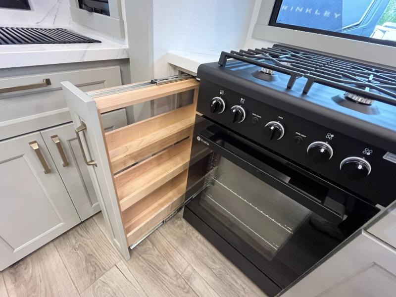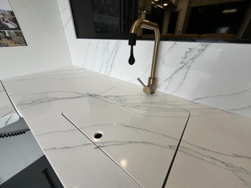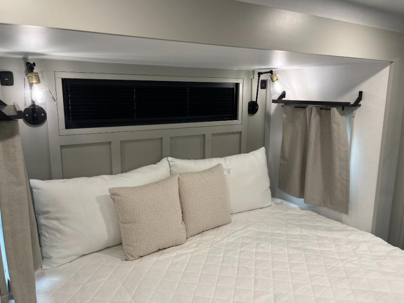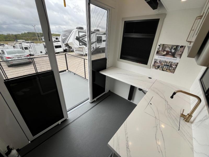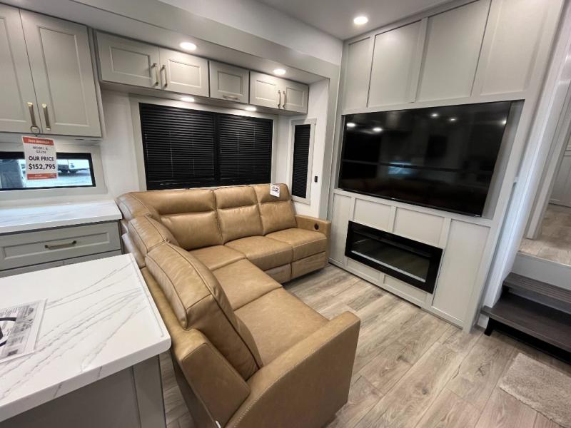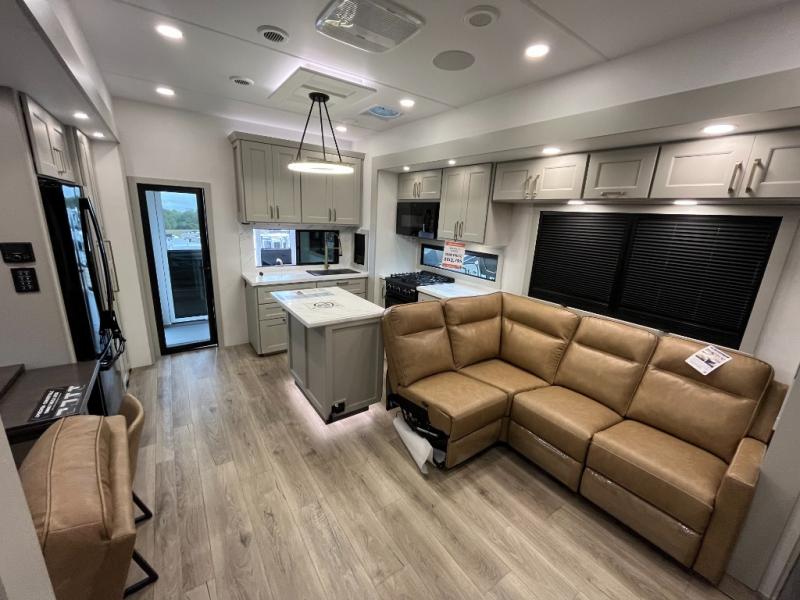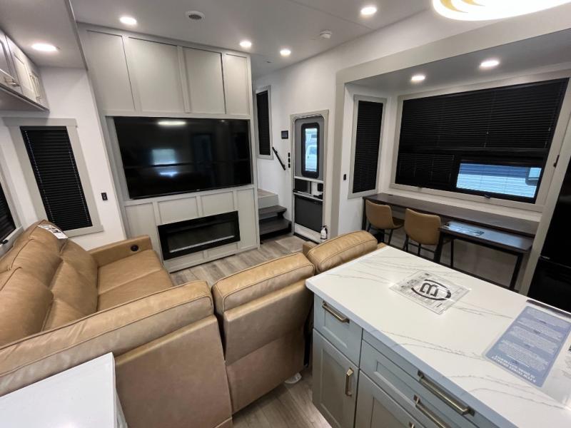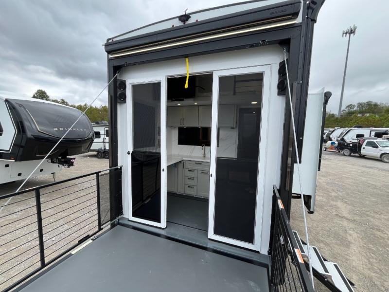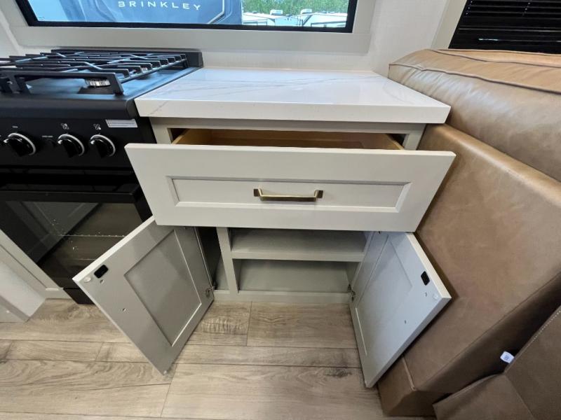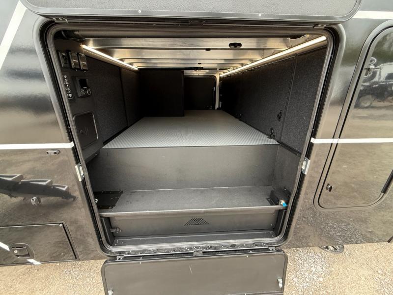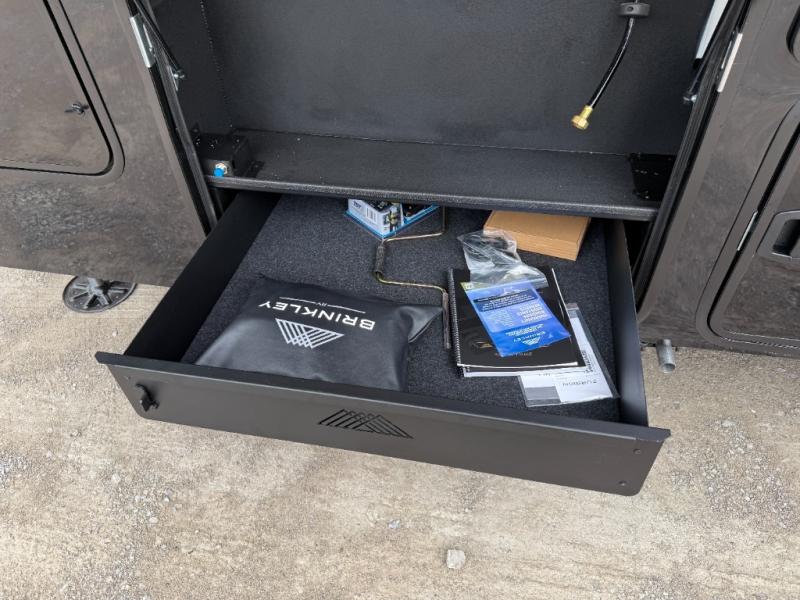 With any Model G toy hauler fifth wheel by Brinkley you will enjoy luxurious amenities, tons of storage space, and innovative features that have been developed and tested in the real world. Durable construction includes an industry leading PDI process, an industry best insulation package, and reinforced and walkable slide roofs. Some of the exterior features you'll find are a 3-way pass-through with a multi-functional flip-up bulkhead wall, under I-beam storage, a MAX-Vision reverse lighting system, and a low-maintenance roof to name a few. A Rockford Fosgate audio system comes standard, along with a Full app-based coach control system (iOS & Android) that lets you control your fifth wheel's functions right from your mobile device. You will find the solar system with a designated storage area to be ultra convenient, plus there is a FlexPower 5500 with a dual fuel inverter generator for all your power needs. Head inside to find a residential interior with Brinkley's CraftSense wood trim construction, floating entrance steps, integrated window screens and insulated blackout blinds, and residential solid surface countertops plus backsplash. You will also enjoy the neon shower lighting and recessed medicine cabinets in the bath, plus motion activated LED bed lights and dual bedside outlets in the bedroom. Choose a Model G toy hauler fifth wheel to experience all the luxury it has to offer!