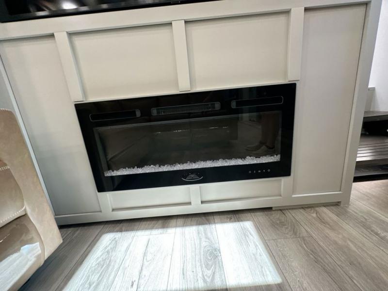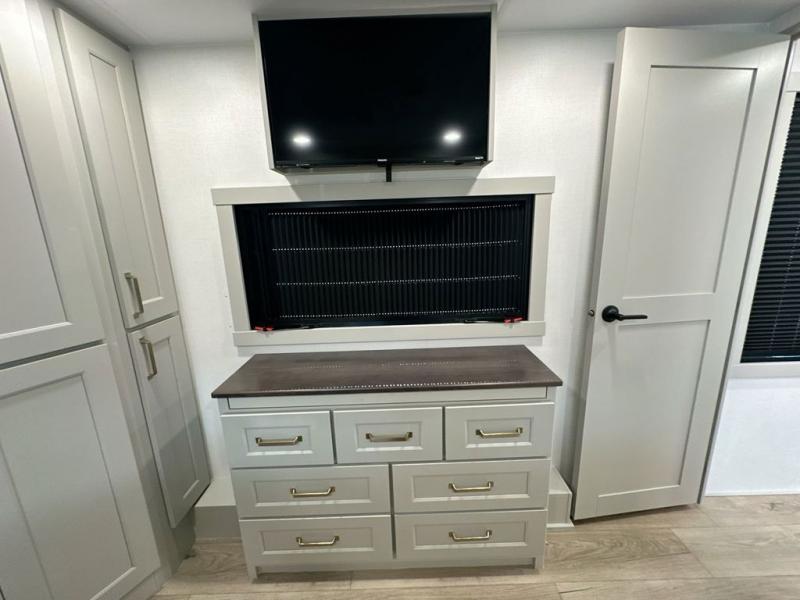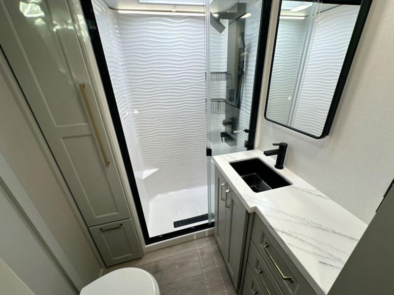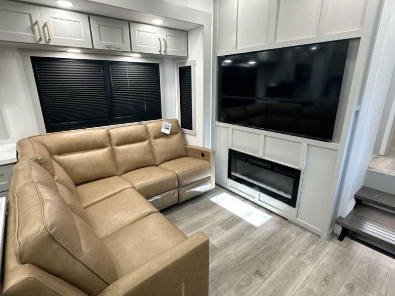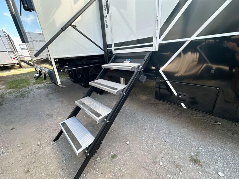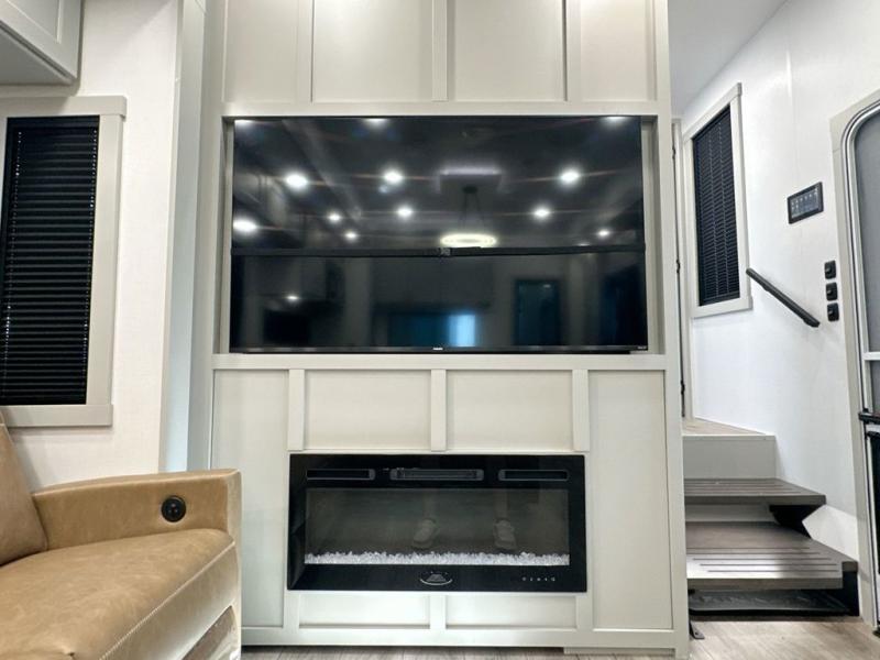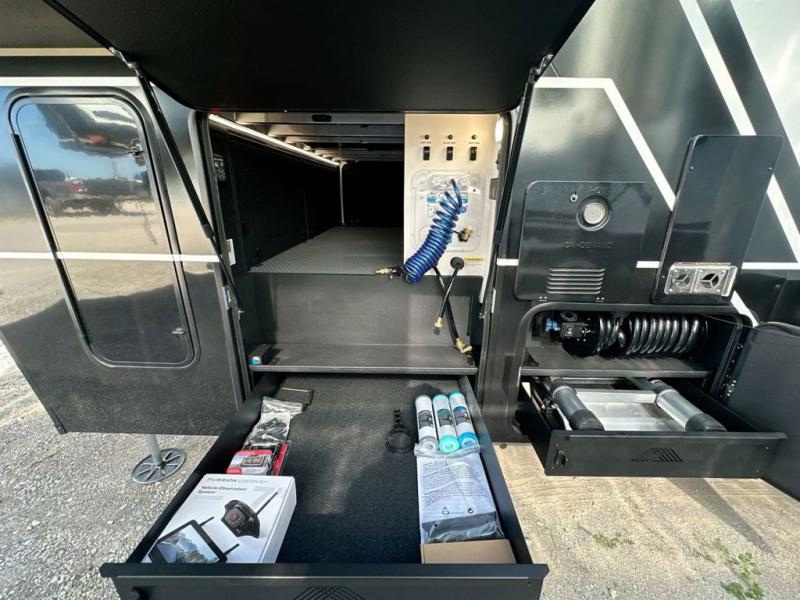 You can't imagine how much this toy hauler has to offer! The garage/outdoor kitchen/office space will allow you to utilize the garage how you need it, plus there is an adjustable tie-down system, as well as a loft for storage and a twin bed to sleep more campers! The garage patio with a 1,500 lb. capacity is another feature you are sure to love, especially with its own awning to keep you protected from the elements. Head to the kitchen to prepare meals with a 24" GE oven with a four burner range, a GE microwave with an air fryer, plus a spacious GE Energy Star 19 cu. ft. refrigerator. The island with two stools will let others visit with you while you cook, and there are even dog bowls to easily feed Frodo. You'll find the convertible dining table/L-desk will be accommodating since it can be use to dine at, and to get some work done. You may just find yourselves spending most of your time on the L-sofa in front of the entertainment center with a TV, fireplace and storage. A full bath is up front by the bedroom, and here you'll find a 30" x 42" shower and and pull-out linen storage with a trash bin to keep towels ready to use. After a day outdoors you'll love nothing more than coming back to your own bedroom with a king bed slide out, TV, a walk-in closet, and many more storage spaces. And we haven't even touched on the exterior features, like the 3-way pass-through storage, three power awnings, an air compressor to fill up tires, and the list goes on and on! This is a pre-production preview, all features and layout placement subject to change.