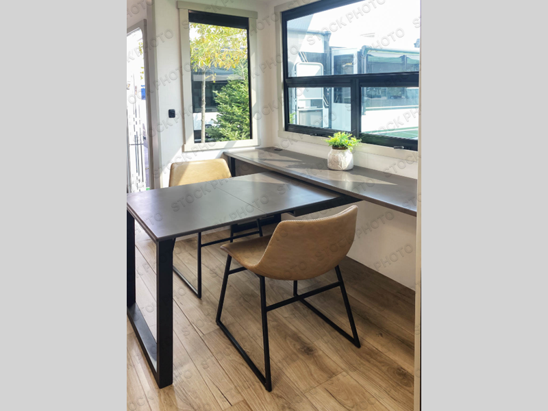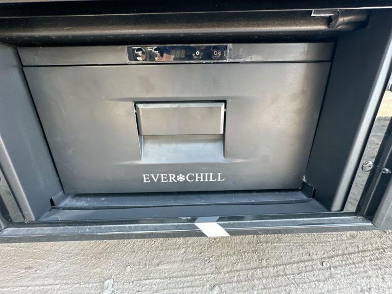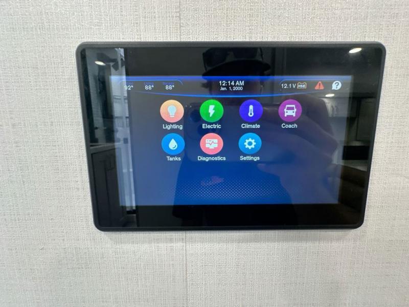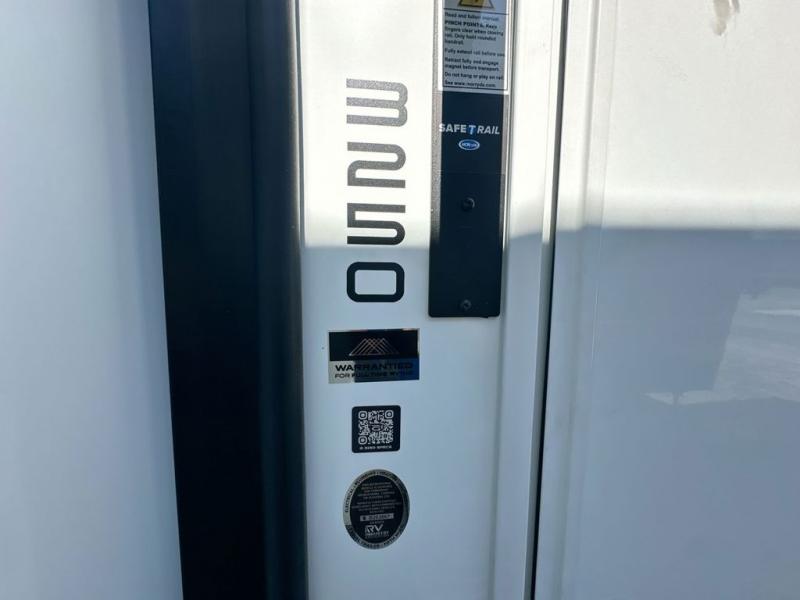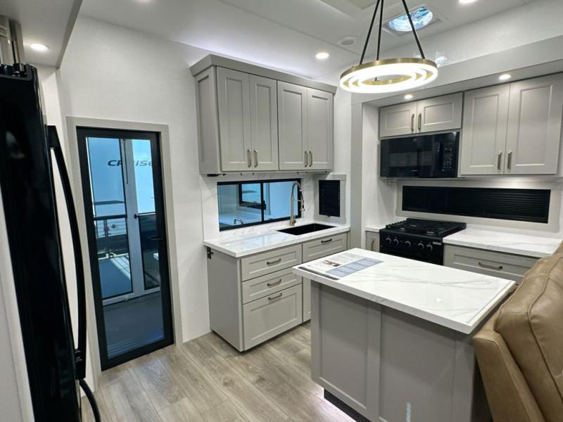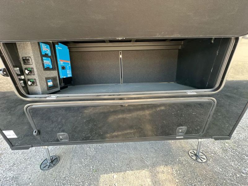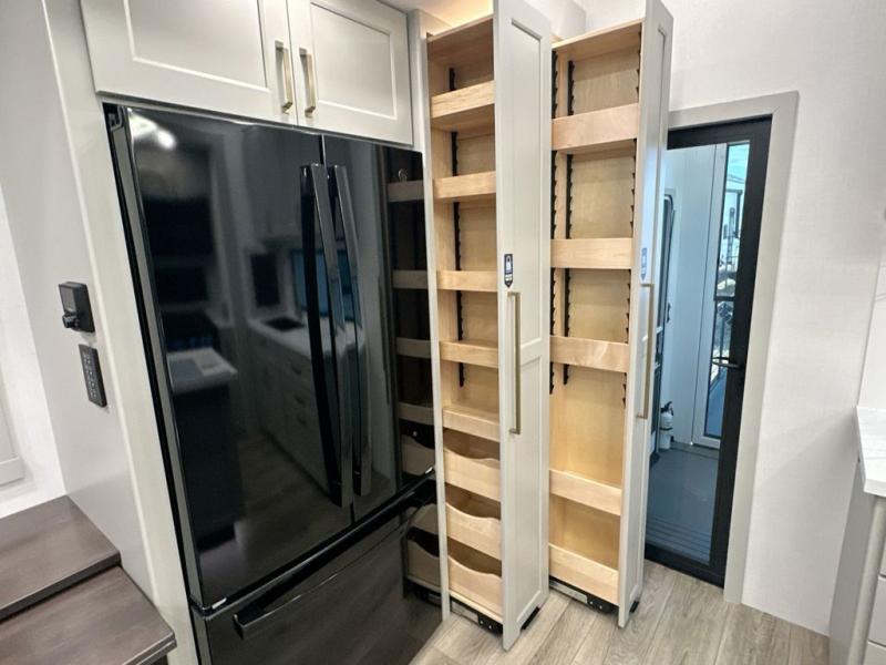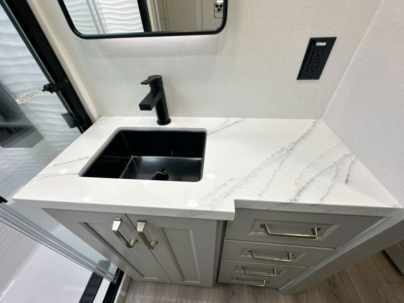 You can't imagine how much this toy hauler has to offer! The garage/outdoor kitchen/office space will allow you to utilize the garage how you need it, plus there is an adjustable tie-down system, as well as a loft for storage and a twin bed to sleep more campers! The garage patio with a 1,500 lb. capacity is another feature you are sure to love, especially with its own awning to keep you protected from the elements. Head to the kitchen to prepare meals with a 24" GE oven with a four burner range, a GE microwave with an air fryer, plus a spacious GE Energy Star 19 cu. ft. refrigerator. The island with two stools will let others visit with you while you cook, and there are even dog bowls to easily feed Frodo. You'll find the convertible dining table/L-desk will be accommodating since it can be use to dine at, and to get some work done. You may just find yourselves spending most of your time on the L-sofa in front of the entertainment center with a TV, fireplace and storage. A full bath is up front by the bedroom, and here you'll find a 30" x 42" shower and and pull-out linen storage with a trash bin to keep towels ready to use. After a day outdoors you'll love nothing more than coming back to your own bedroom with a king bed slide out, TV, a walk-in closet, and many more storage spaces. And we haven't even touched on the exterior features, like the 3-way pass-through storage, three power awnings, an air compressor to fill up tires, and the list goes on and on! This is a pre-production preview, all features and layout placement subject to change.