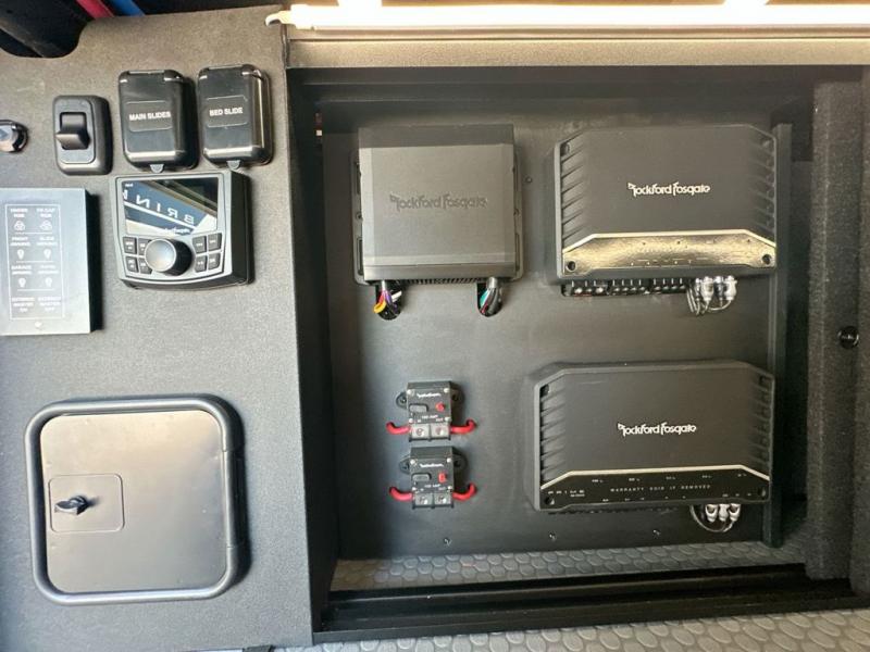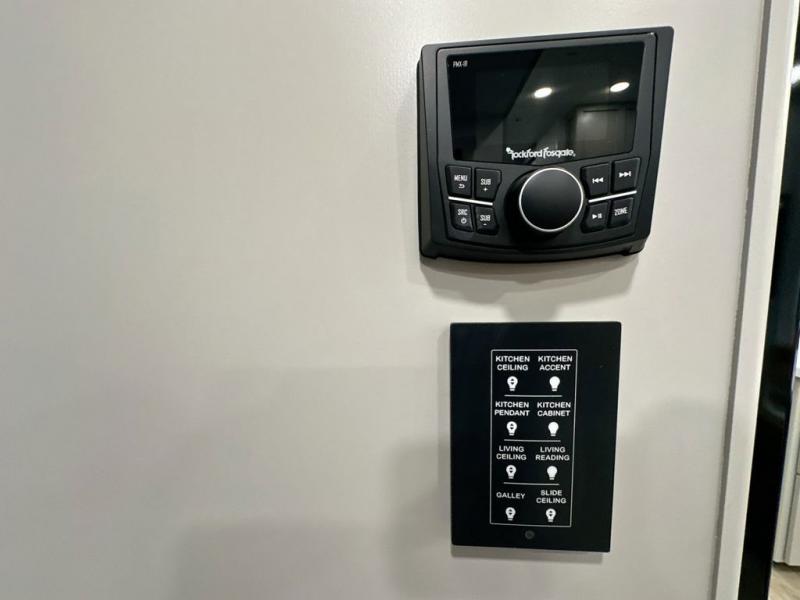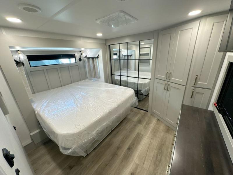 With any Model G toy hauler fifth wheel by Brinkley you will enjoy luxurious amenities, tons of storage space, and innovative features that have been developed and tested in the real world. Durable construction includes an industry leading PDI process, an industry best insulation package, and reinforced and walkable slide roofs. Some of the exterior features you'll find are a 3-way pass-through with a multi-functional flip-up bulkhead wall, under I-beam storage, a MAX-Vision reverse lighting system, and a low-maintenance roof to name a few. A Rockford Fosgate audio system comes standard, along with a Full app-based coach control system (iOS & Android) that lets you control your fifth wheel's functions right from your mobile device. You will find the solar system with a designated storage area to be ultra convenient, plus there is a FlexPower 5500 with a dual fuel inverter generator for all your power needs. Head inside to find a residential interior with Brinkley's CraftSense wood trim construction, floating entrance steps, integrated window screens and insulated blackout blinds, and residential solid surface countertops plus backsplash. You will also enjoy the neon shower lighting and recessed medicine cabinets in the bath, plus motion activated LED bed lights and dual bedside outlets in the bedroom. Choose a Model G toy hauler fifth wheel to experience all the luxury it has to offer!