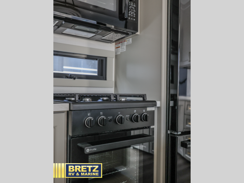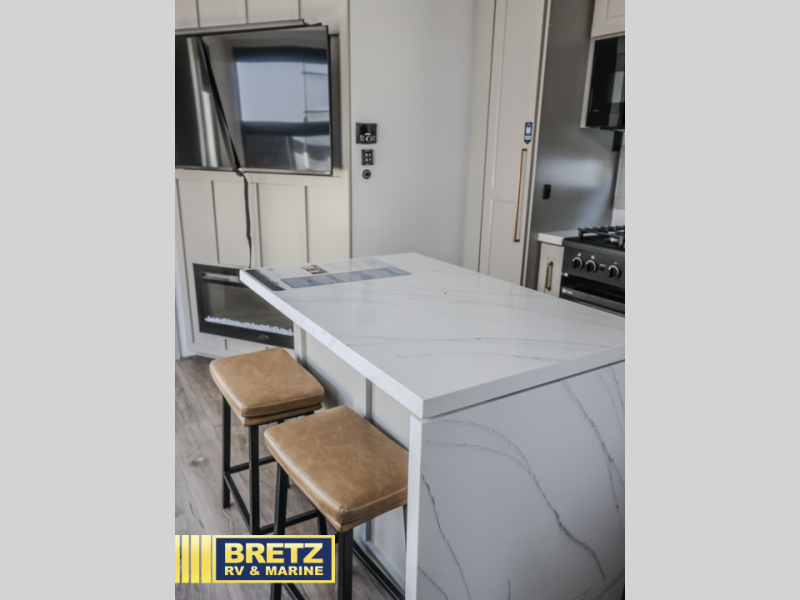 Prepare to be amazed by all the features packed into this toy hauler! There are triple slides that will provide your crew with more space, a separate garage that can sleep five with the loft included, plus a bath and a half for added convenience. The chef of your group will love the middle kitchen with a waterfall island that converts to a counter peninsula, a pull-out pantry, a GE Energy Star 19 cu. ft. refrigerator with ice and filtered water, and much more. In the combined kitchen and living space you'll find a spacious sofa with heat and massage, a fireplace, a TV, plus convenient dog bowls and shoe storage. After your toys are unloaded from the garage, you can relax on the independent dual sofas with a Fold-N-Stow table in between. You will find the front private bedroom with a king bed slide out will provide a great night's rest, and you'll also find a walk-in closet, under-bed storage, and a sliding dresser top with hidden storage for special belongings.