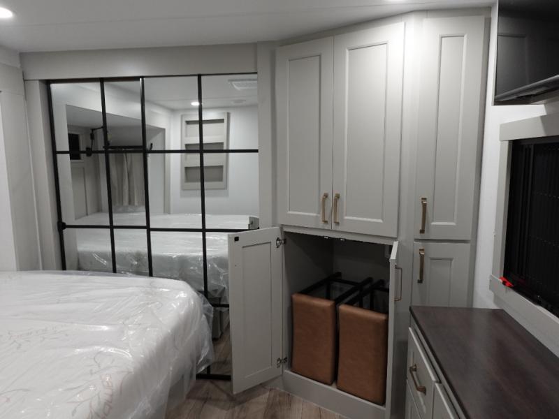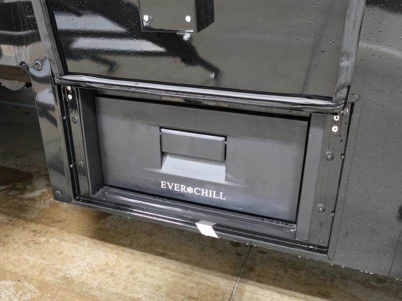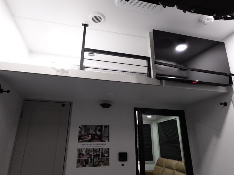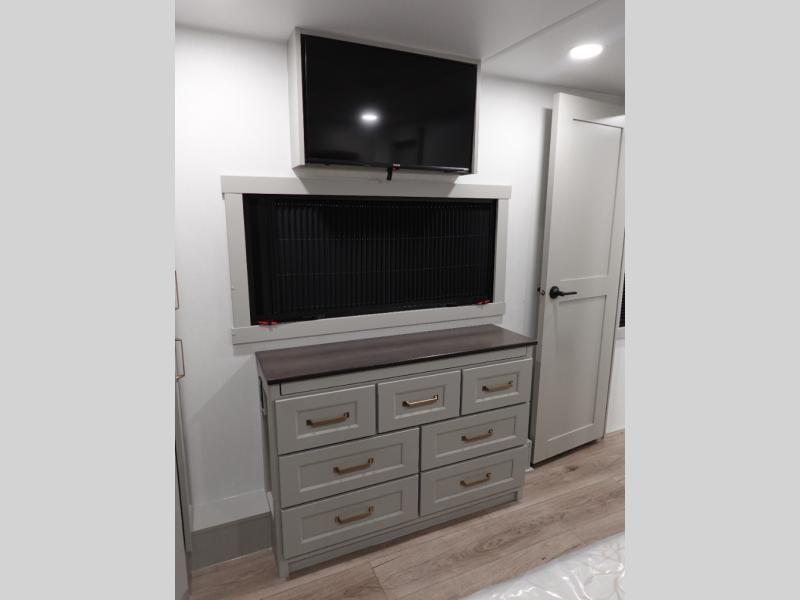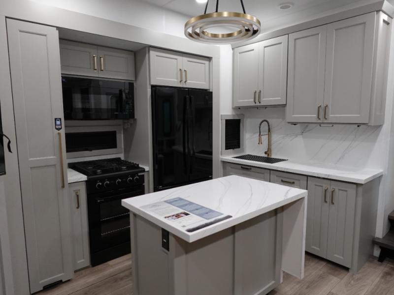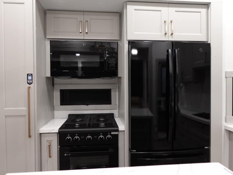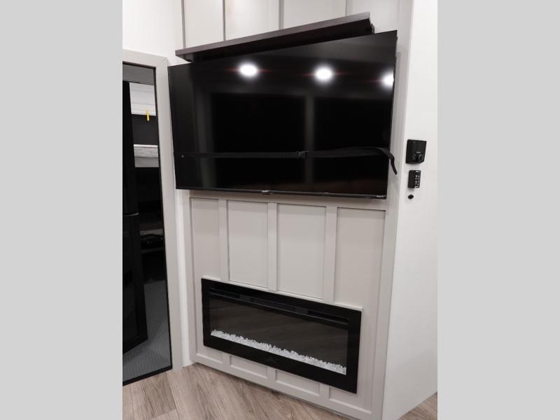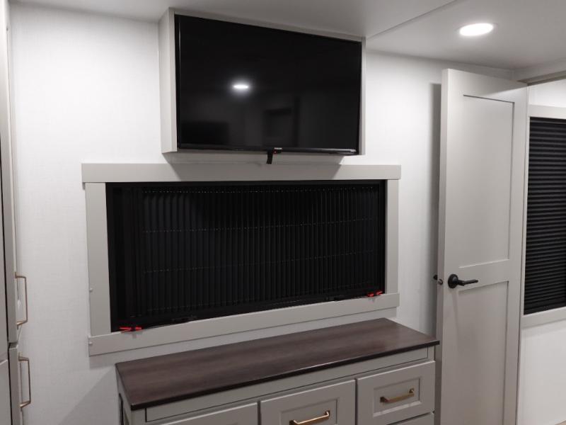 Prepare to be amazed by all the features packed into this toy hauler! There are triple slides that will provide your crew with more space, a separate garage that can sleep five with the loft included, plus a bath and a half for added convenience. The chef of your group will love the middle kitchen with a waterfall island that converts to a counter peninsula, a pull-out pantry, a GE Energy Star 19 cu. ft. refrigerator with ice and filtered water, and much more. In the combined kitchen and living space you'll find a spacious sofa with heat and massage, a fireplace, a TV, plus convenient dog bowls and shoe storage. After your toys are unloaded from the garage, you can relax on the independent dual sofas with a Fold-N-Stow table in between. You will find the front private bedroom with a king bed slide out will provide a great night's rest, and you'll also find a walk-in closet, under-bed storage, and a sliding dresser top with hidden storage for special belongings.