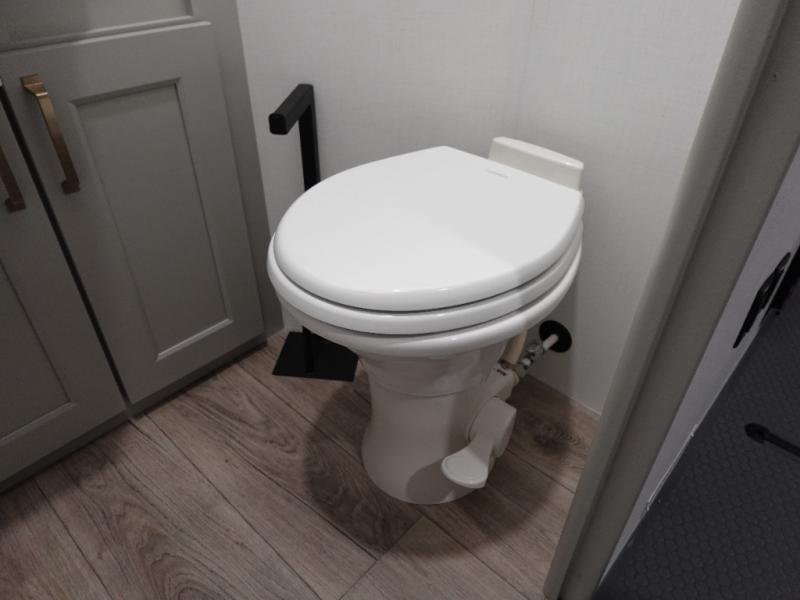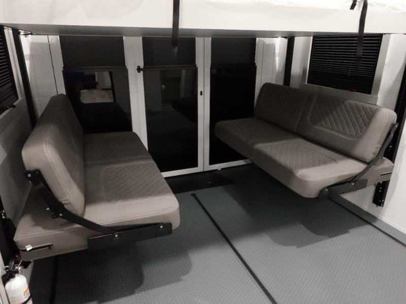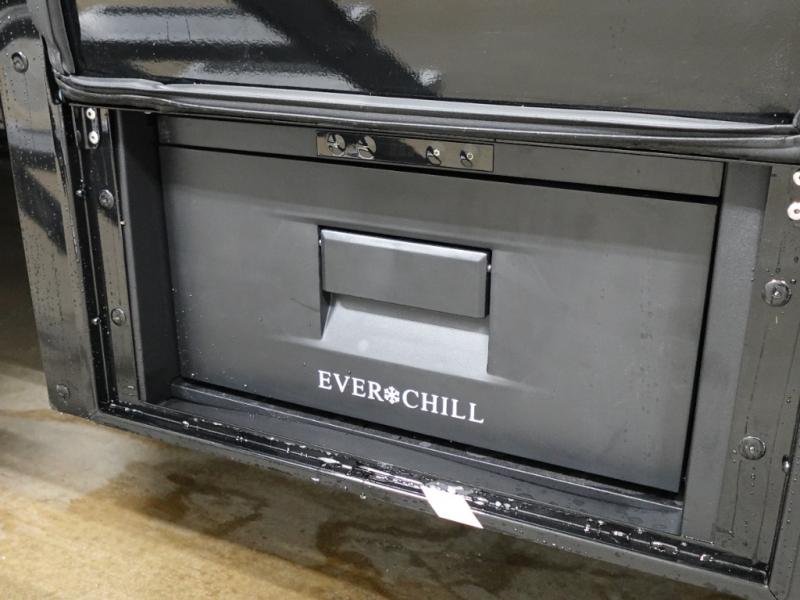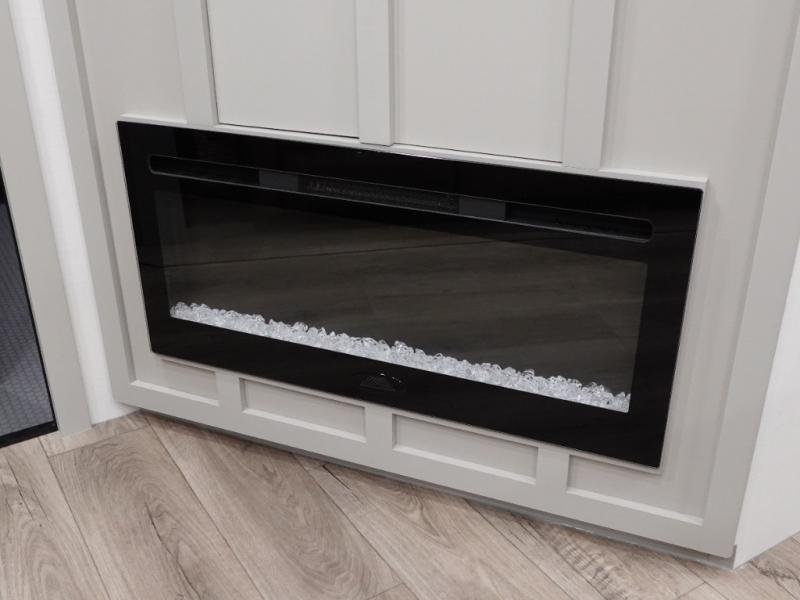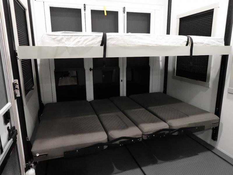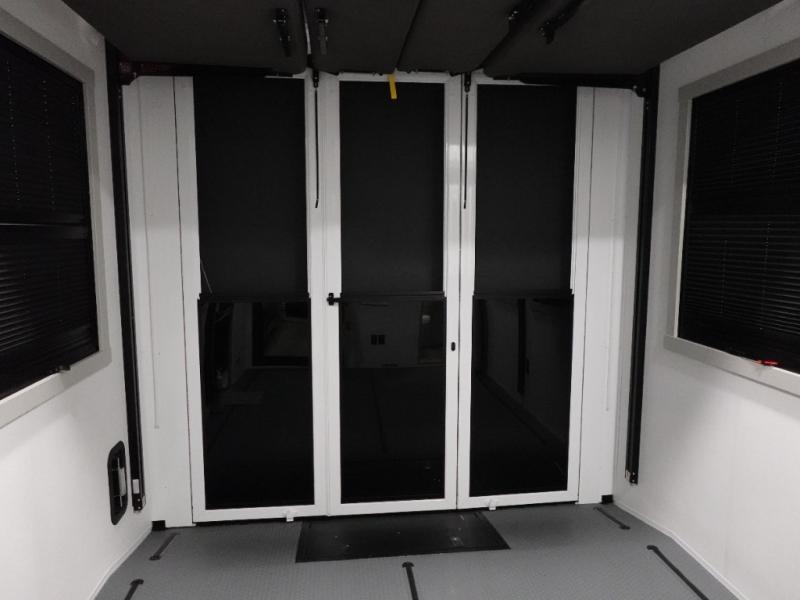 Prepare to be amazed by all the features packed into this toy hauler! There are triple slides that will provide your crew with more space, a separate garage that can sleep five with the loft included, plus a bath and a half for added convenience. The chef of your group will love the middle kitchen with a waterfall island that converts to a counter peninsula, a pull-out pantry, a GE Energy Star 19 cu. ft. refrigerator with ice and filtered water, and much more. In the combined kitchen and living space you'll find a spacious sofa with heat and massage, a fireplace, a TV, plus convenient dog bowls and shoe storage. After your toys are unloaded from the garage, you can relax on the independent dual sofas with a Fold-N-Stow table in between. You will find the front private bedroom with a king bed slide out will provide a great night's rest, and you'll also find a walk-in closet, under-bed storage, and a sliding dresser top with hidden storage for special belongings.