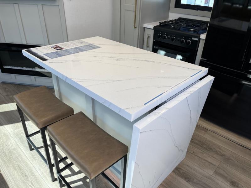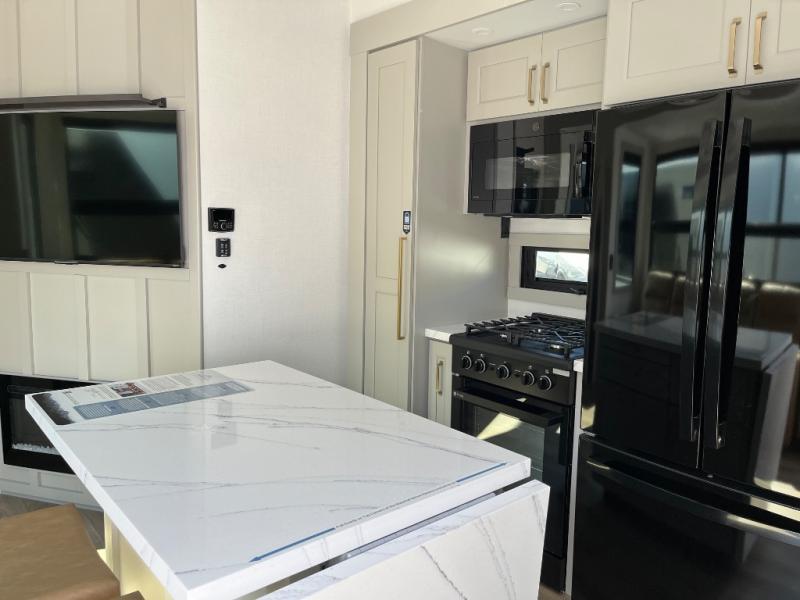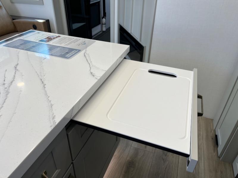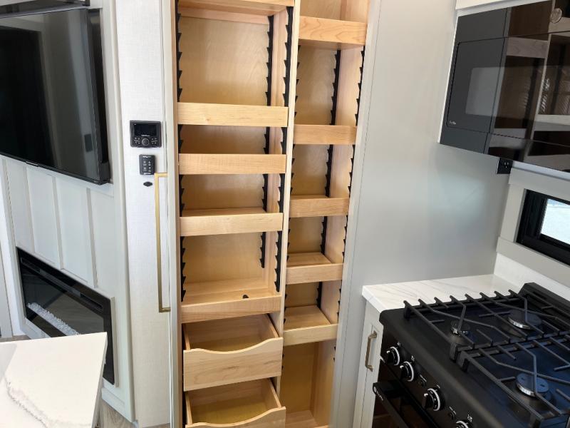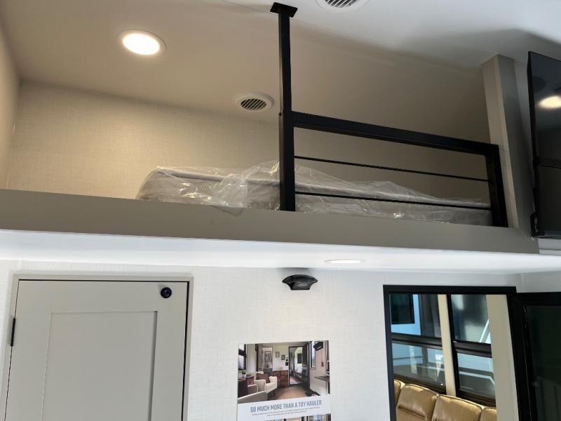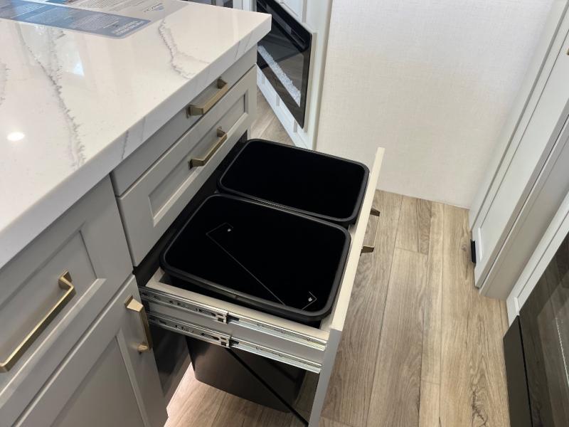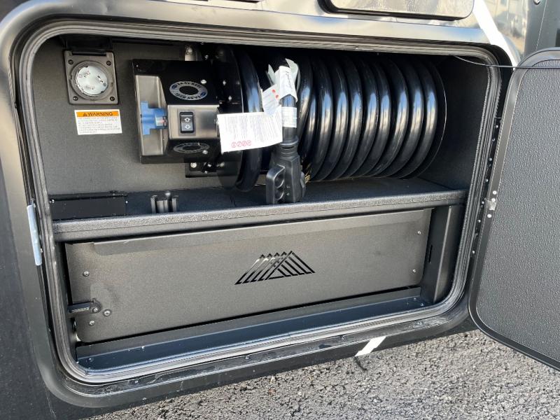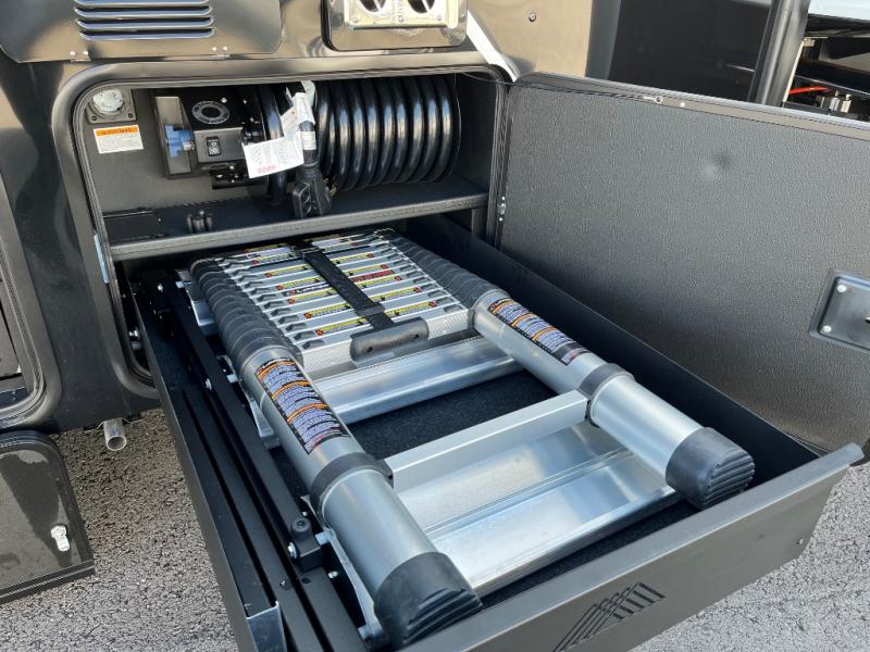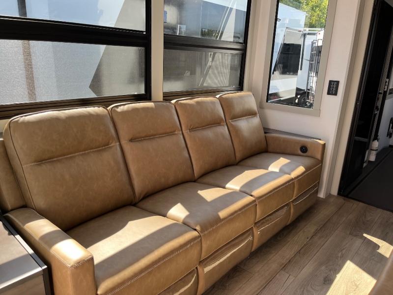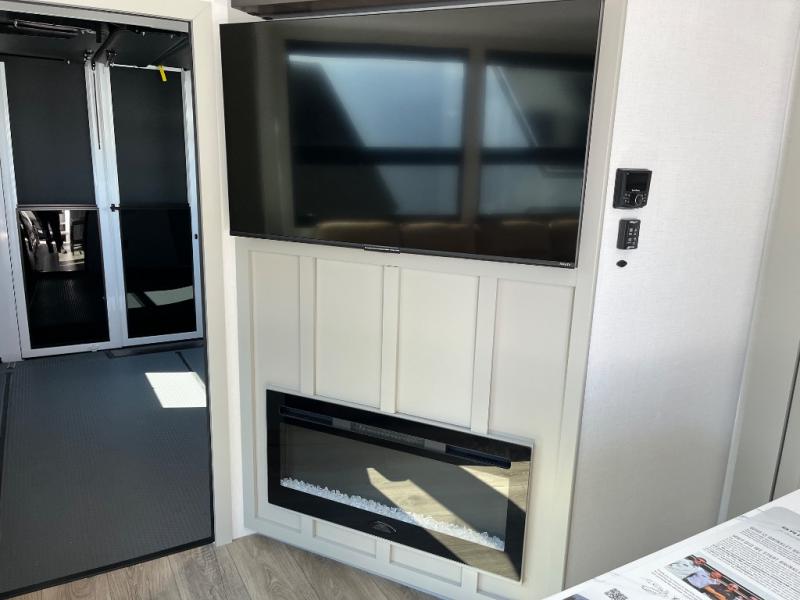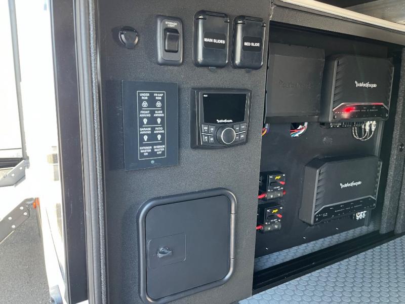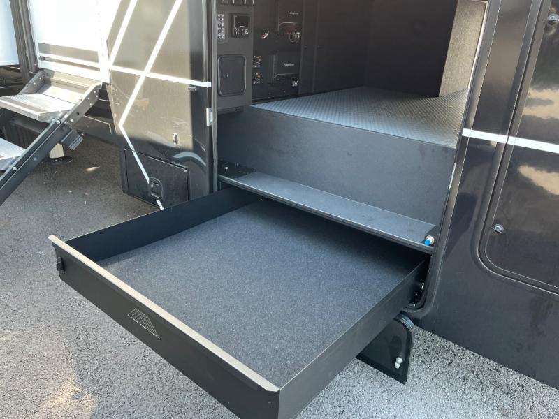 Prepare to be amazed by all the features packed into this toy hauler! There are triple slides that will provide your crew with more space, a separate garage that can sleep five with the loft included, plus a bath and a half for added convenience. The chef of your group will love the middle kitchen with a waterfall island that converts to a counter peninsula, a pull-out pantry, a GE Energy Star 19 cu. ft. refrigerator with ice and filtered water, and much more. In the combined kitchen and living space you'll find a spacious sofa with heat and massage, a fireplace, a TV, plus convenient dog bowls and shoe storage. After your toys are unloaded from the garage, you can relax on the independent dual sofas with a Fold-N-Stow table in between. You will find the front private bedroom with a king bed slide out will provide a great night's rest, and you'll also find a walk-in closet, under-bed storage, and a sliding dresser top with hidden storage for special belongings.