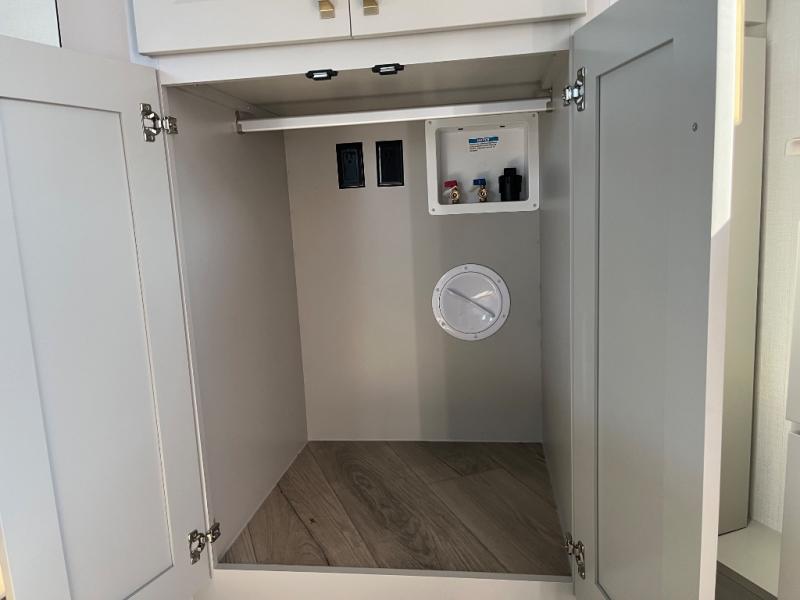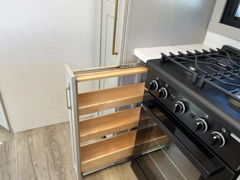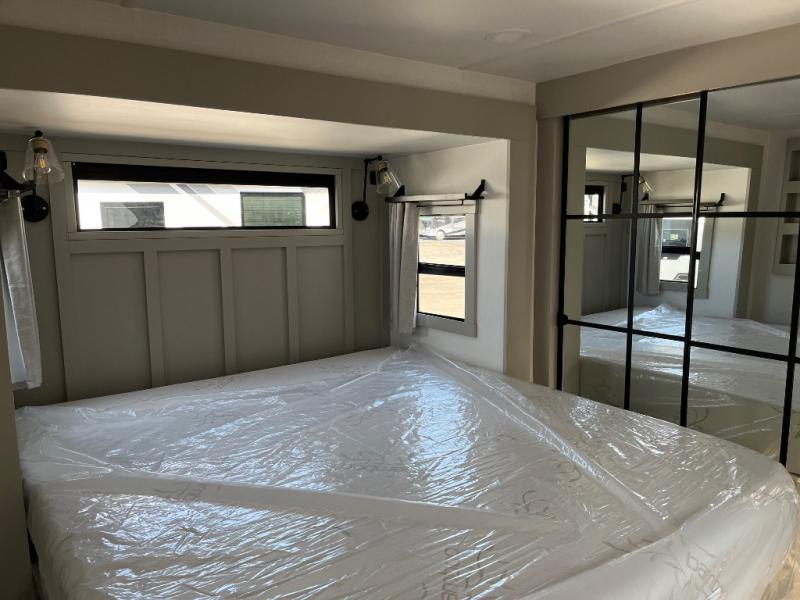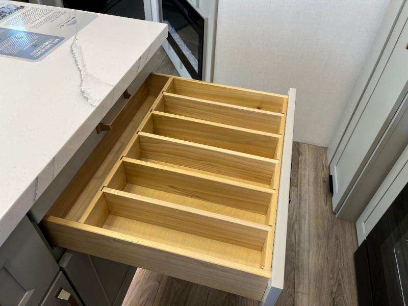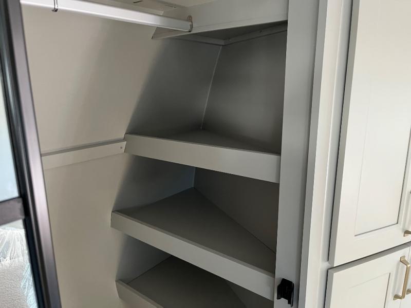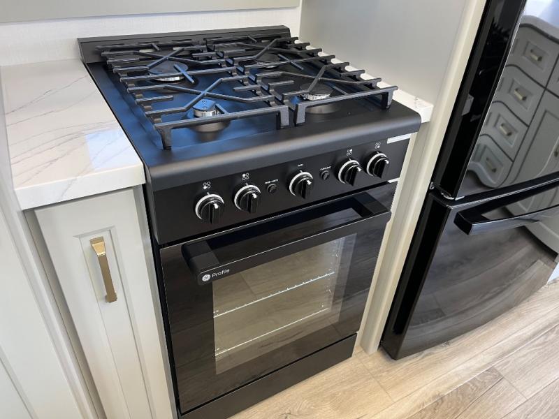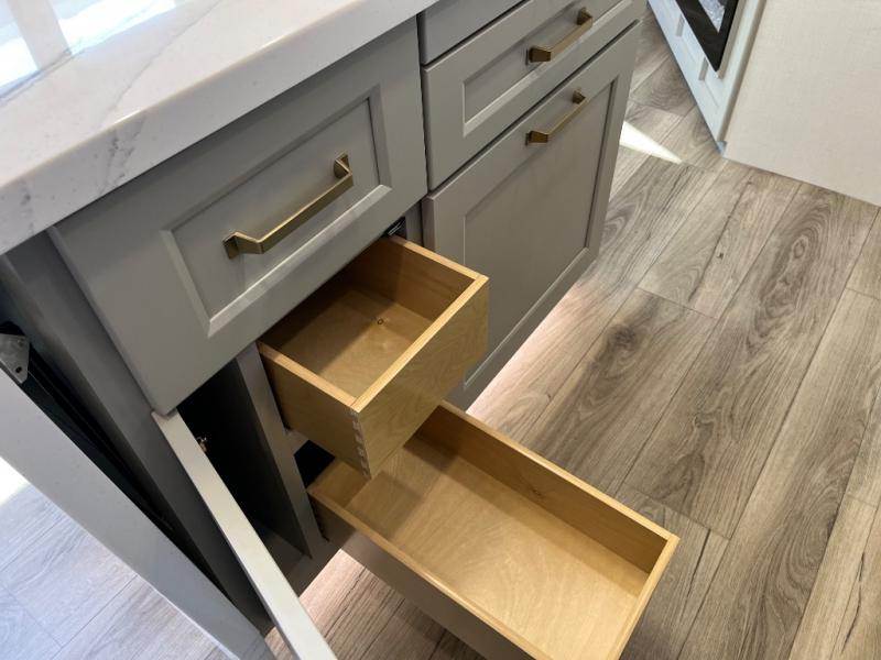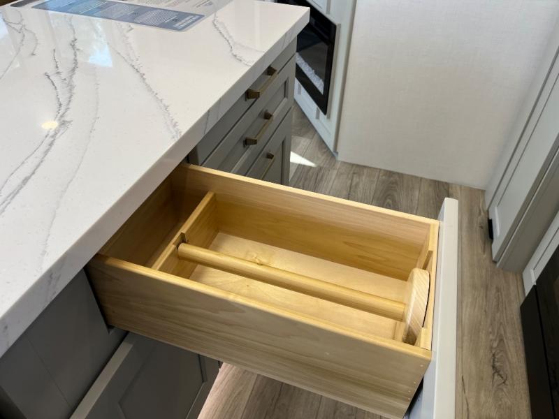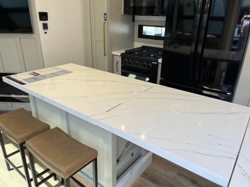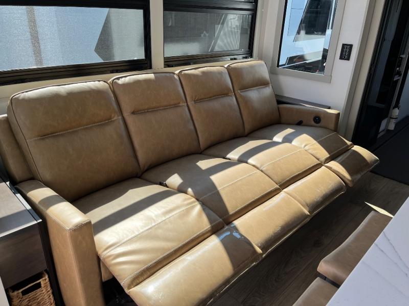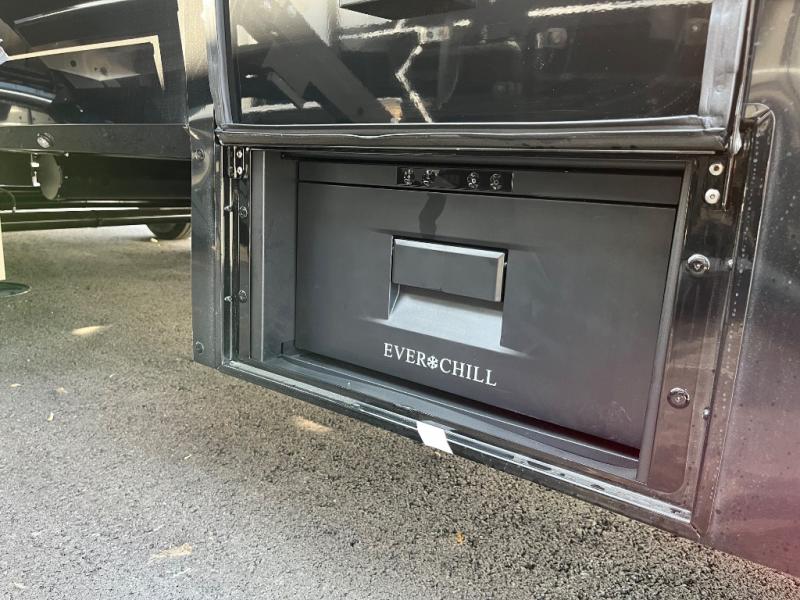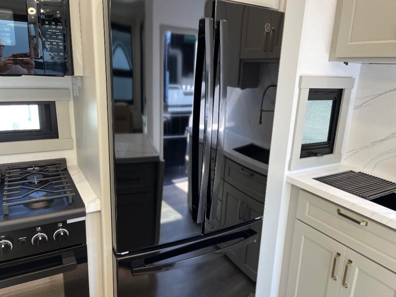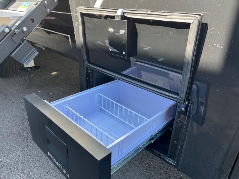Prepare to be amazed by all the features packed into this toy hauler! There are triple slides that will provide your crew with more space, a separate garage that can sleep five with the loft included, plus a bath and a half for added convenience. The chef of your group will love the middle kitchen with a waterfall island that converts to a counter peninsula, a pull-out pantry, a GE Energy Star 19 cu. ft. refrigerator with ice and filtered water, and much more. In the combined kitchen and living space you'll find a spacious sofa with heat and massage, a fireplace, a TV, plus convenient dog bowls and shoe storage. After your toys are unloaded from the garage, you can relax on the independent dual sofas with a Fold-N-Stow table in between. You will find the front private bedroom with a king bed slide out will provide a great night's rest, and you'll also find a walk-in closet, under-bed storage, and a sliding dresser top with hidden storage for special belongings.