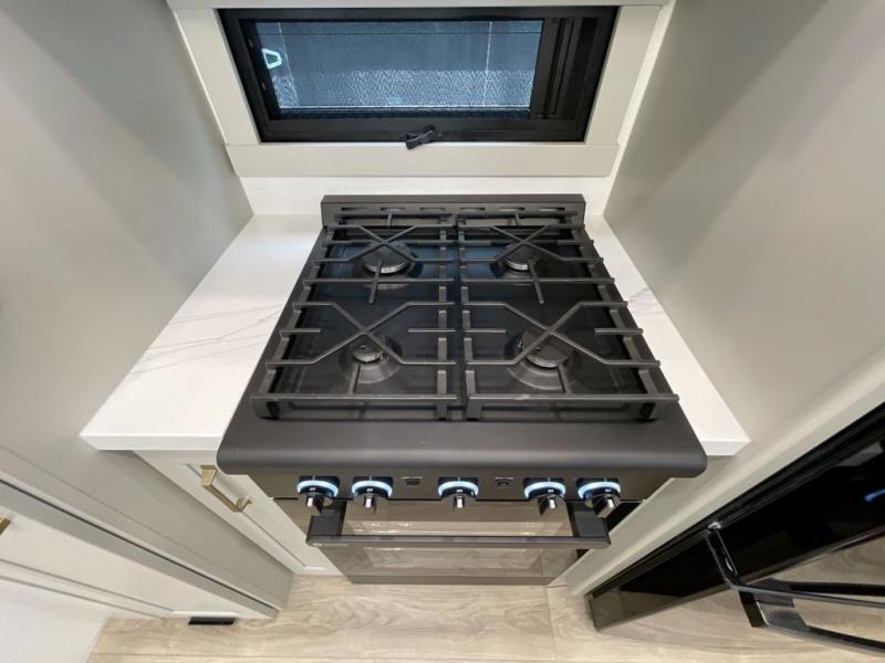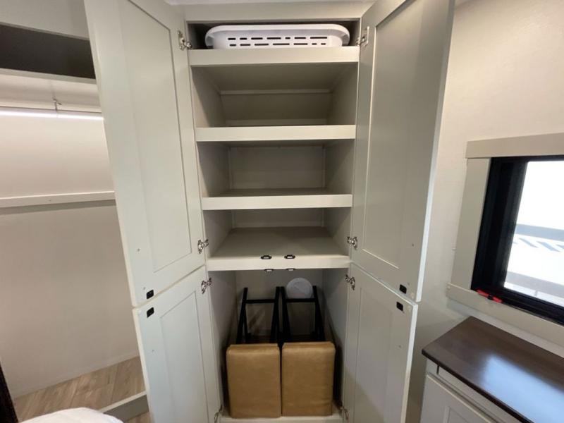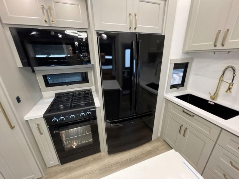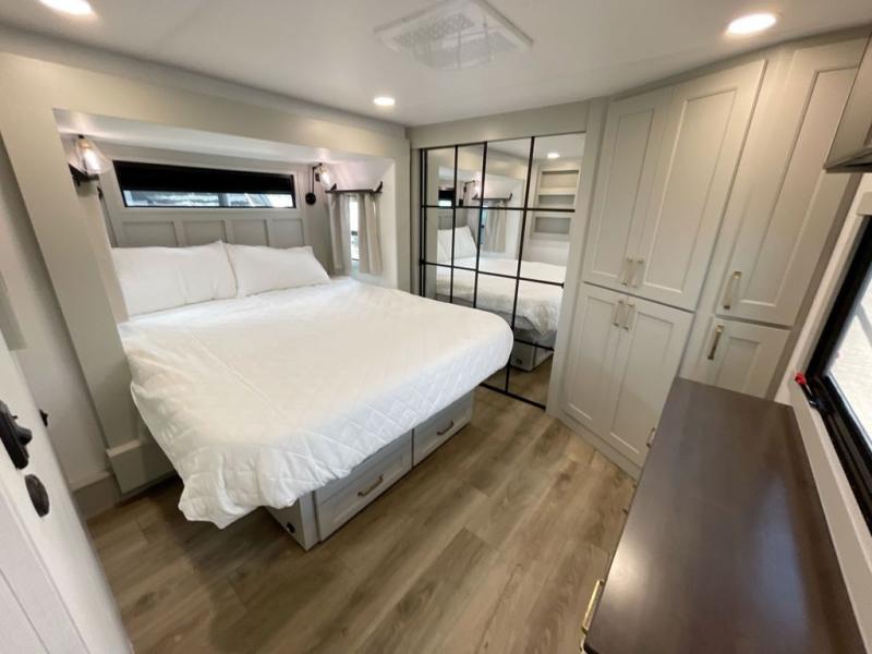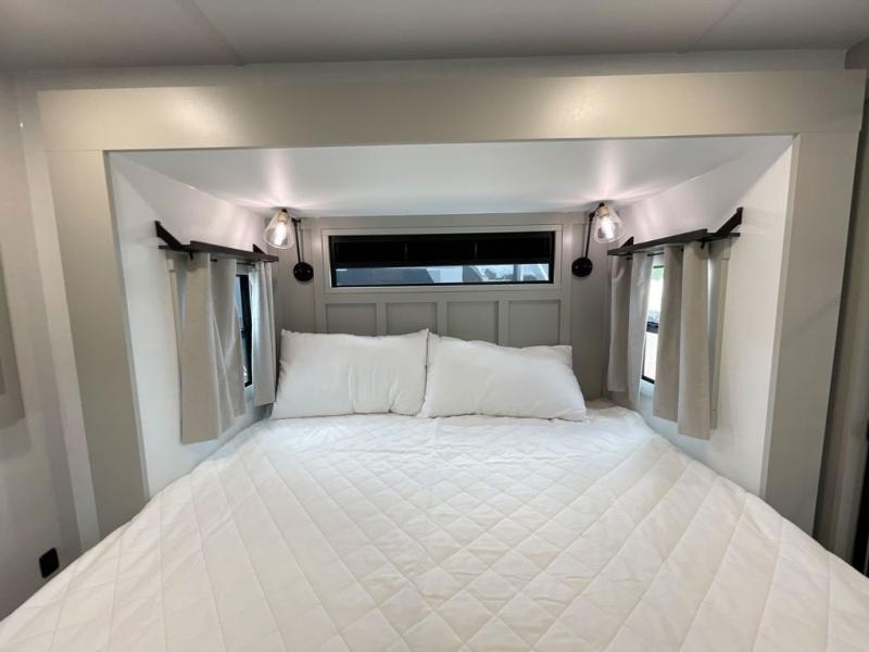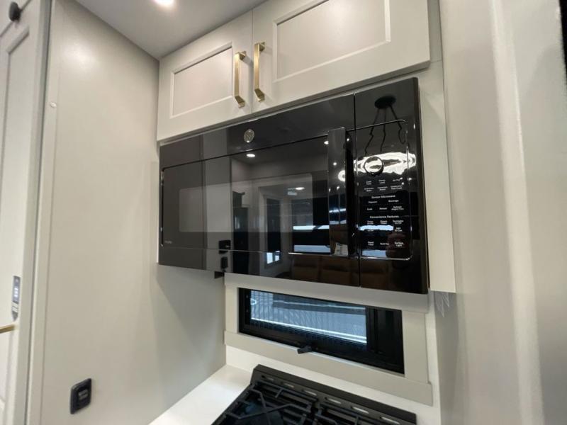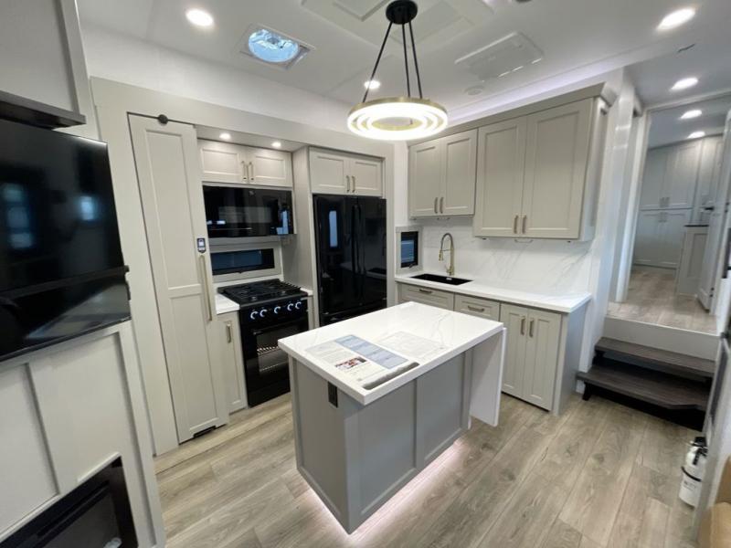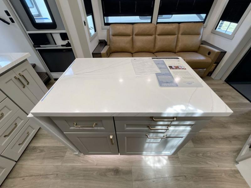 Prepare to be amazed by all the features packed into this toy hauler! There are triple slides that will provide your crew with more space, a separate garage that can sleep five with the loft included, plus a bath and a half for added convenience. The chef of your group will love the middle kitchen with a waterfall island that converts to a counter peninsula, a pull-out pantry, a GE Energy Star 19 cu. ft. refrigerator with ice and filtered water, and much more. In the combined kitchen and living space you'll find a spacious sofa with heat and massage, a fireplace, a TV, plus convenient dog bowls and shoe storage. After your toys are unloaded from the garage, you can relax on the independent dual sofas with a Fold-N-Stow table in between. You will find the front private bedroom with a king bed slide out will provide a great night's rest, and you'll also find a walk-in closet, under-bed storage, and a sliding dresser top with hidden storage for special belongings.