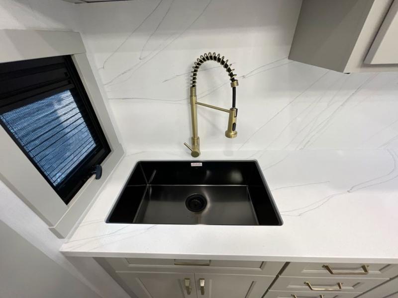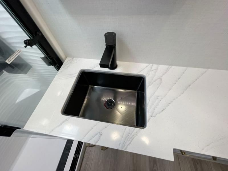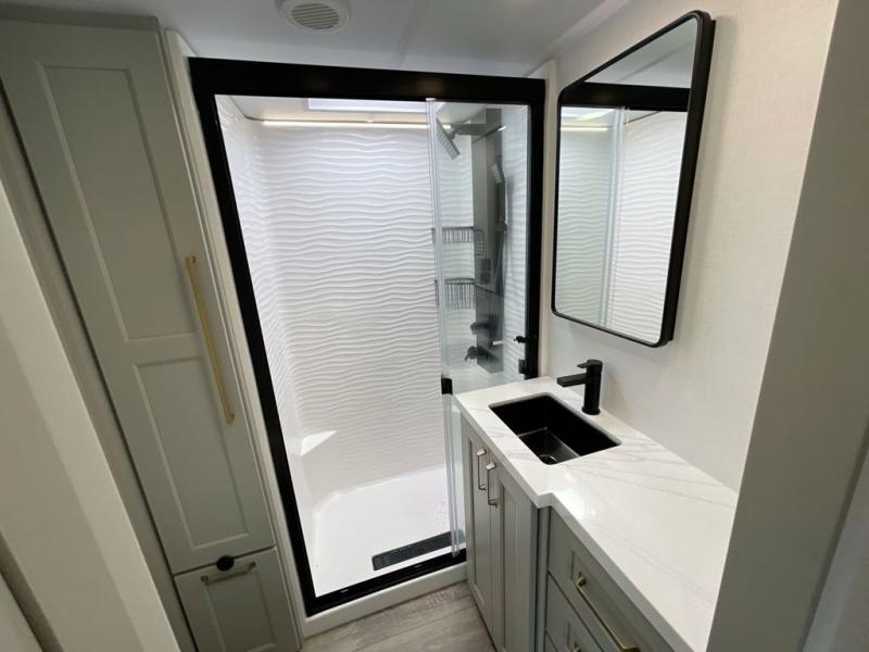 With any Model G toy hauler fifth wheel by Brinkley you will enjoy luxurious amenities, tons of storage space, and innovative features that have been developed and tested in the real world. Durable construction includes an industry leading PDI process, an industry best insulation package, and reinforced and walkable slide roofs. Some of the exterior features you'll find are a 3-way pass-through with a multi-functional flip-up bulkhead wall, under I-beam storage, a MAX-Vision reverse lighting system, and a low-maintenance roof to name a few. A Rockford Fosgate audio system comes standard, along with a OneControl app system that lets you control your fifth wheel's functions right from your mobile device. You will find the solar system with a designated storage area to be ultra convenient, plus there is a FlexPower 5500 with a dual fuel inverter generator for all your power needs. Head inside to find a residential interior with Brinkley's CraftSense wood trim construction, floating entrance steps, integrated window screens and insulated blackout blinds, and residential solid surface countertops plus backsplash. You will also enjoy the neon shower lighting and recessed medicine cabinets in the bath, plus motion activated LED bed lights and dual bedside outlets in the bedroom. Choose a Model G toy hauler fifth wheel to experience all the luxury it has to offer!