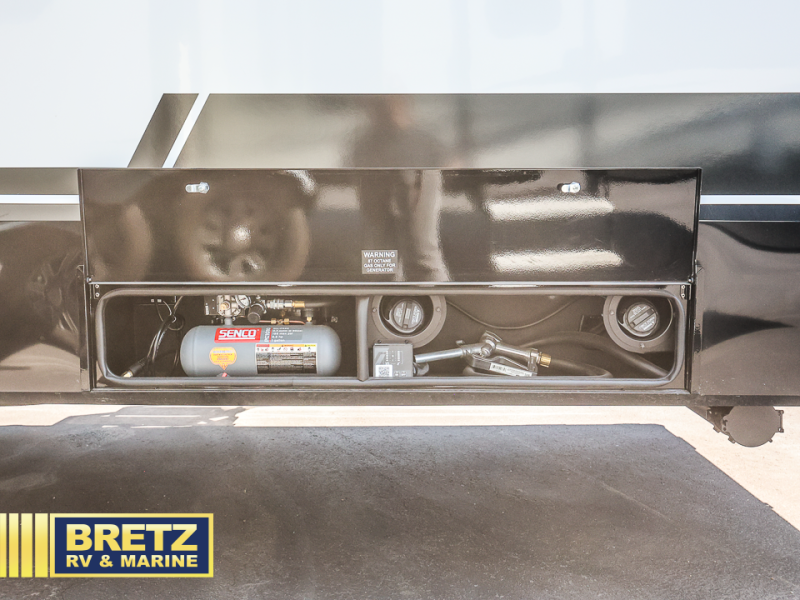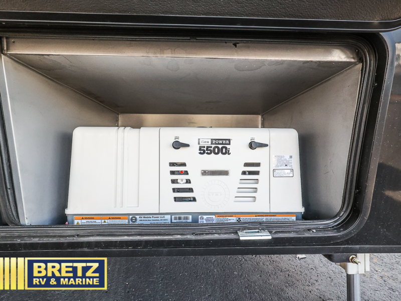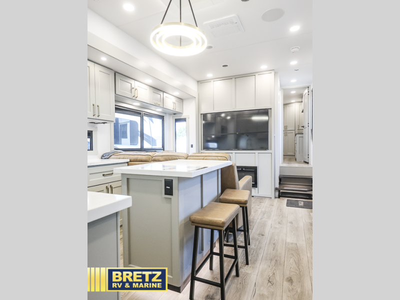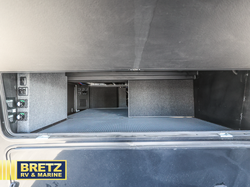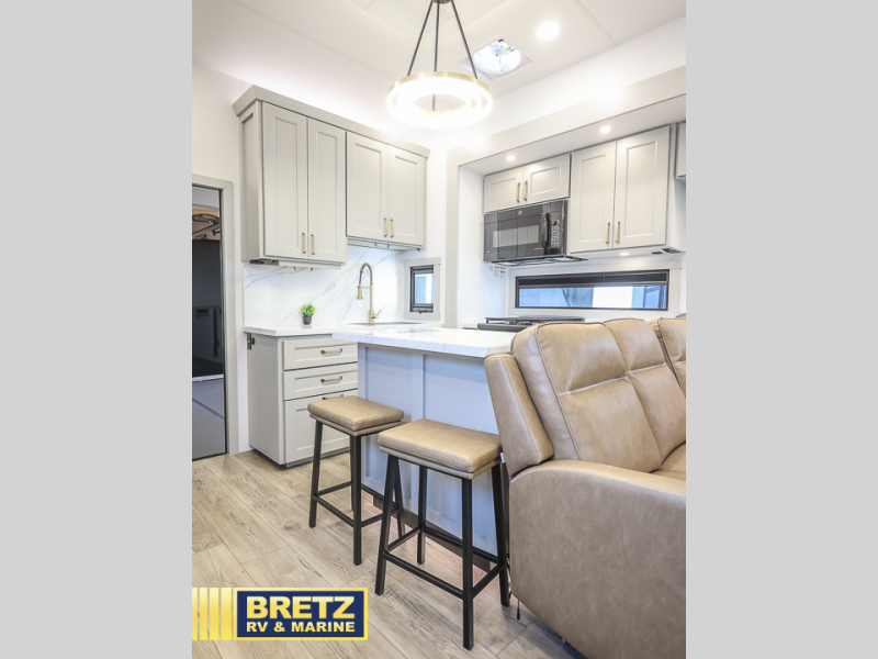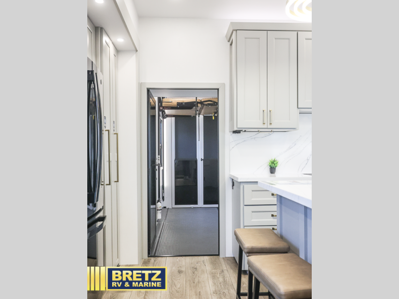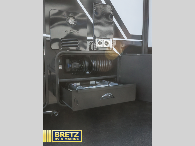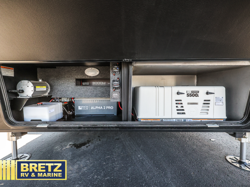 This toy hauler may just be the one you've been looking for! The garage/flex space with fold-away half bath walls will allow you to utilize the garage how you need it, plus there is an adjustable tie-down system, independent dual sofas, plus a loft for storage and a twin bed to sleep more campers! The garage patio with a 1,500 lb. capacity is another feature you are sure to love, especially with its own awning to keep you protected from the elements. Head to the kitchen to prepare meals with a 24" GE oven with a four burner range, a GE microwave with an air fryer, plus a spacious GE Energy Star 19 cu. ft. refrigerator. The island with two stools will let others visit with you while you cook, and there are even hidden dog bowls. You'll find the convertible dining table/L-desk will be accommodating since it can be use to dine at, and to get some work done. You may just find yourselves spending most of your time on the L-sofa in front of the TV and fireplace. A full bath is up front by the bedroom, and here you'll find neon shower lighting, a residential shower system, and pull-out linen storage to keep towels ready to use. After a day outdoors you'll love nothing more than coming back to your own bedroom with a king bed slide out, TV, a walk-in closet, and many more storage spaces. And we haven't even touched on the exterior features, like the 3-way pass-through storage, three power awnings, an air compressor to fill up tires, and the list goes on and on!