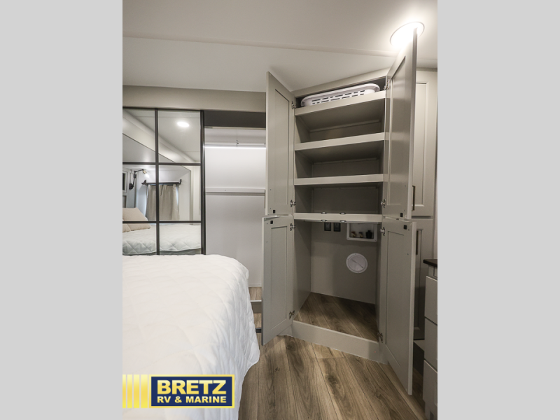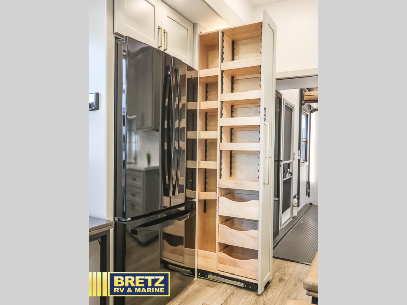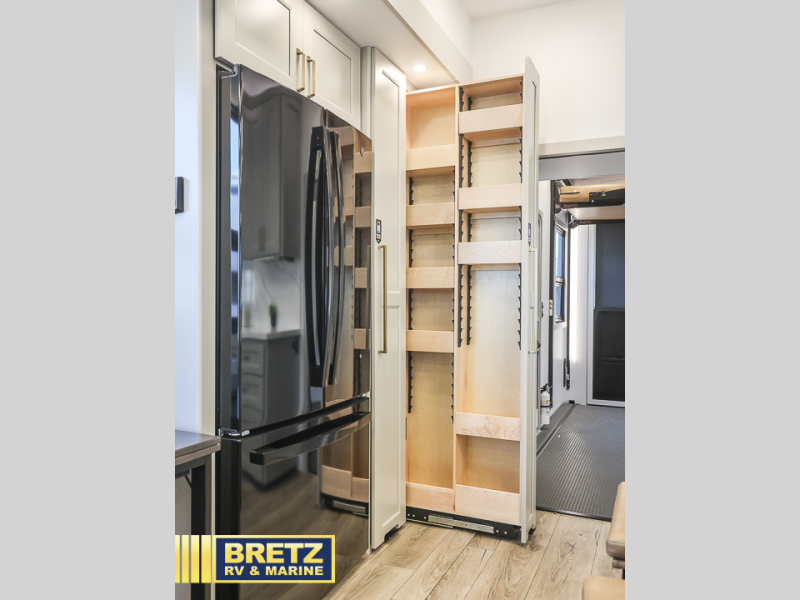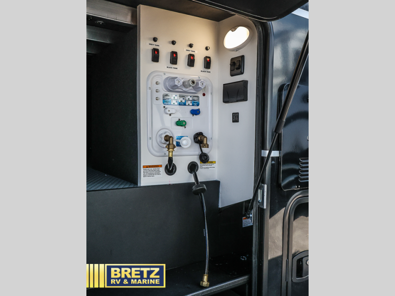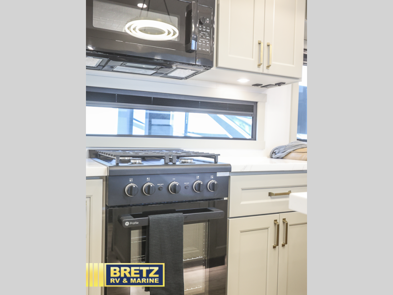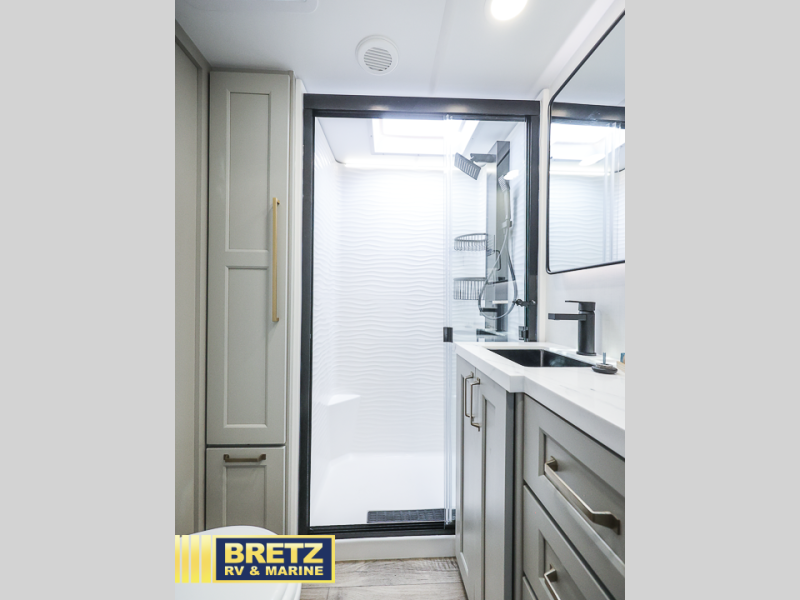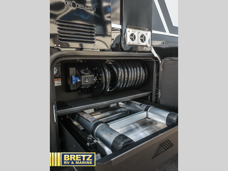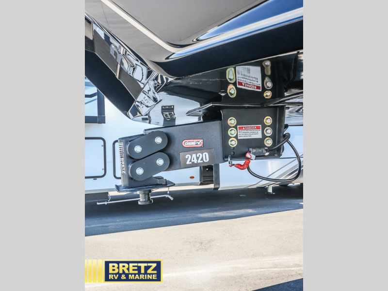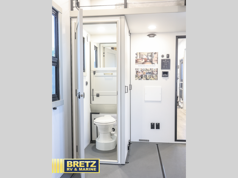 This toy hauler may just be the one you've been looking for! The garage/flex space with fold-away half bath walls will allow you to utilize the garage how you need it, plus there is an adjustable tie-down system, independent dual sofas, plus a loft for storage and a twin bed to sleep more campers! The garage patio with a 1,500 lb. capacity is another feature you are sure to love, especially with its own awning to keep you protected from the elements. Head to the kitchen to prepare meals with a 24" GE oven with a four burner range, a GE microwave with an air fryer, plus a spacious GE Energy Star 19 cu. ft. refrigerator. The island with two stools will let others visit with you while you cook, and there are even hidden dog bowls. You'll find the convertible dining table/L-desk will be accommodating since it can be use to dine at, and to get some work done. You may just find yourselves spending most of your time on the L-sofa in front of the TV and fireplace. A full bath is up front by the bedroom, and here you'll find neon shower lighting, a residential shower system, and pull-out linen storage to keep towels ready to use. After a day outdoors you'll love nothing more than coming back to your own bedroom with a king bed slide out, TV, a walk-in closet, and many more storage spaces. And we haven't even touched on the exterior features, like the 3-way pass-through storage, three power awnings, an air compressor to fill up tires, and the list goes on and on!
