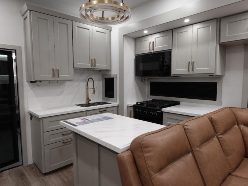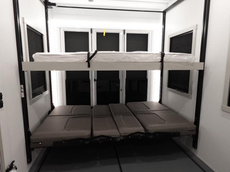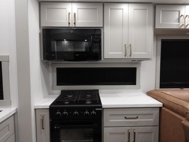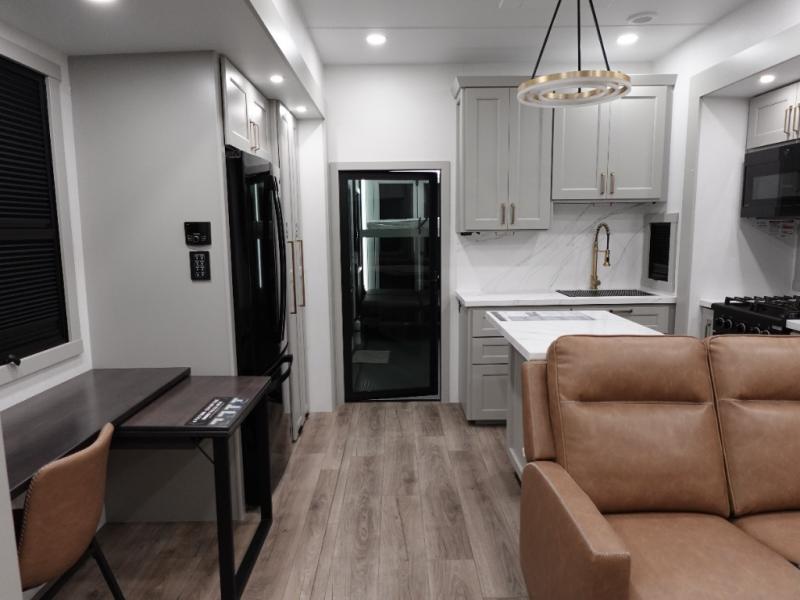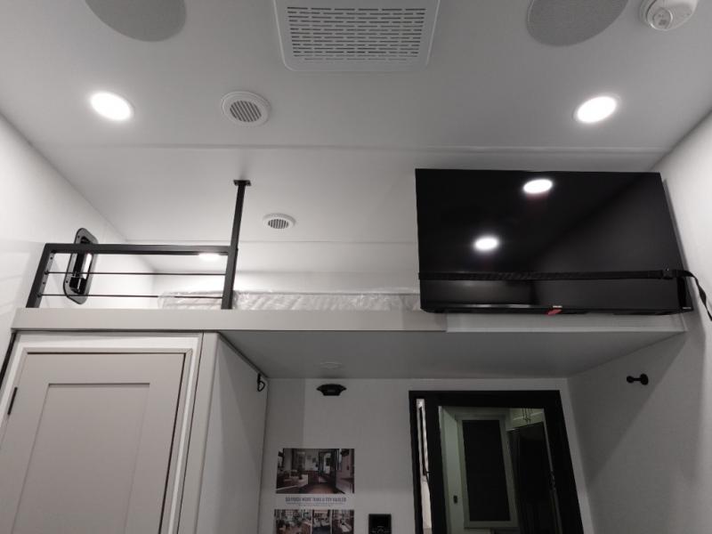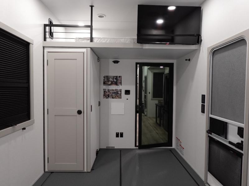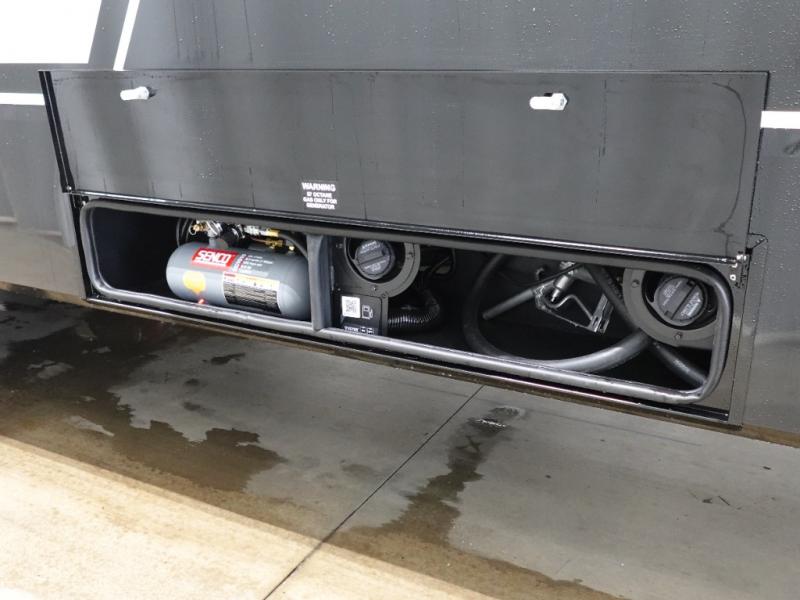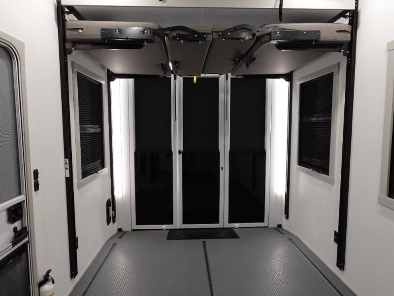 This toy hauler may just be the one you've been looking for! The garage/flex space with fold-away half bath walls will allow you to utilize the garage how you need it, plus there is an adjustable tie-down system, independent dual sofas, plus a loft for storage and a twin bed to sleep more campers! The garage patio with a 1,500 lb. capacity is another feature you are sure to love, especially with its own awning to keep you protected from the elements. Head to the kitchen to prepare meals with a 24" GE oven with a four burner range, a GE microwave with an air fryer, plus a spacious GE Energy Star 19 cu. ft. refrigerator. The island with two stools will let others visit with you while you cook, and there are even hidden dog bowls. You'll find the convertible dining table/L-desk will be accommodating since it can be use to dine at, and to get some work done. You may just find yourselves spending most of your time on the L-sofa in front of the TV and fireplace. A full bath is up front by the bedroom, and here you'll find neon shower lighting, a residential shower system, and pull-out linen storage to keep towels ready to use. After a day outdoors you'll love nothing more than coming back to your own bedroom with a king bed slide out, TV, a walk-in closet, and many more storage spaces. And we haven't even touched on the exterior features, like the 3-way pass-through storage, three power awnings, an air compressor to fill up tires, and the list goes on and on!