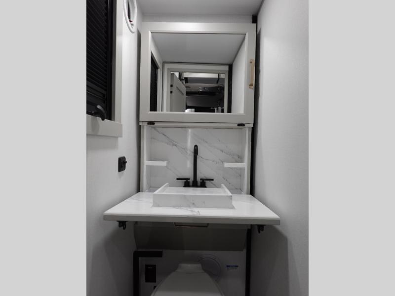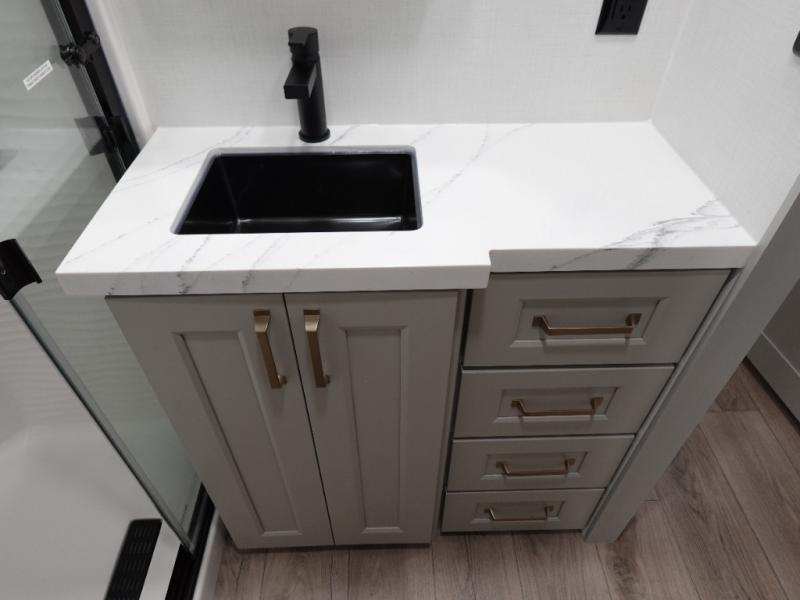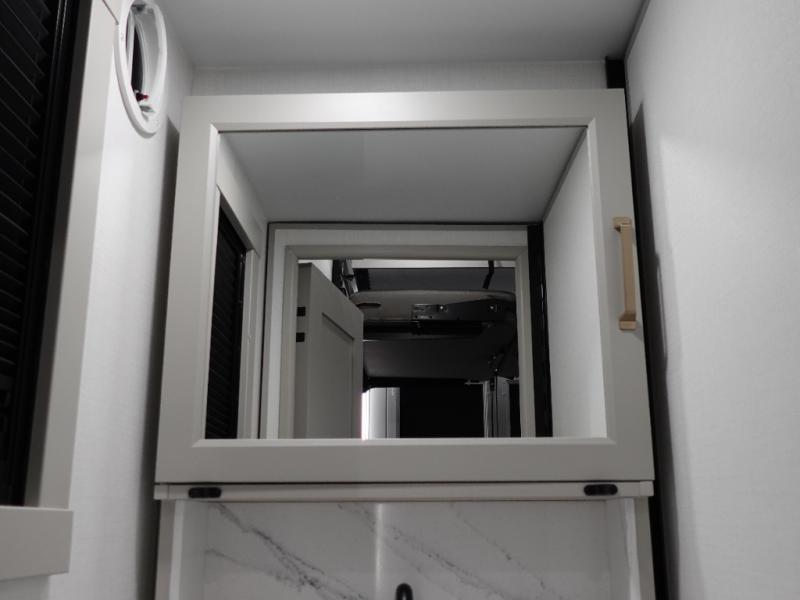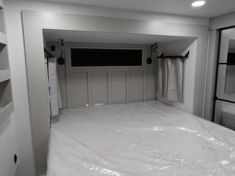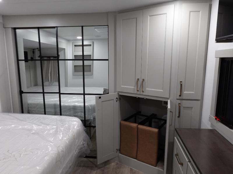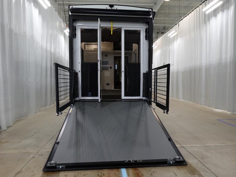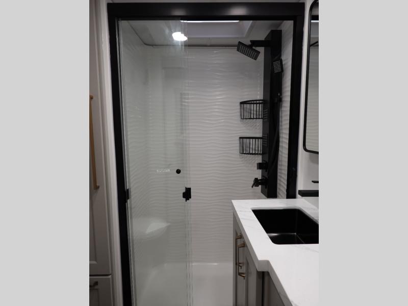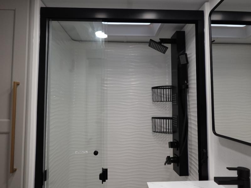 This toy hauler may just be the one you've been looking for! The garage/flex space with fold-away half bath walls will allow you to utilize the garage how you need it, plus there is an adjustable tie-down system, independent dual sofas, plus a loft for storage and a twin bed to sleep more campers! The garage patio with a 1,500 lb. capacity is another feature you are sure to love, especially with its own awning to keep you protected from the elements. Head to the kitchen to prepare meals with a 24" GE oven with a four burner range, a GE microwave with an air fryer, plus a spacious GE Energy Star 19 cu. ft. refrigerator. The island with two stools will let others visit with you while you cook, and there are even hidden dog bowls. You'll find the convertible dining table/L-desk will be accommodating since it can be use to dine at, and to get some work done. You may just find yourselves spending most of your time on the L-sofa in front of the TV and fireplace. A full bath is up front by the bedroom, and here you'll find neon shower lighting, a residential shower system, and pull-out linen storage to keep towels ready to use. After a day outdoors you'll love nothing more than coming back to your own bedroom with a king bed slide out, TV, a walk-in closet, and many more storage spaces. And we haven't even touched on the exterior features, like the 3-way pass-through storage, three power awnings, an air compressor to fill up tires, and the list goes on and on!