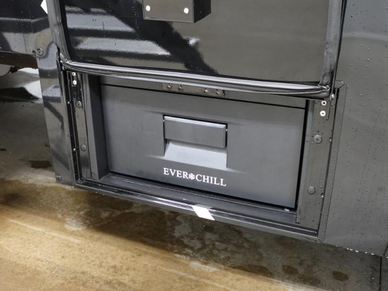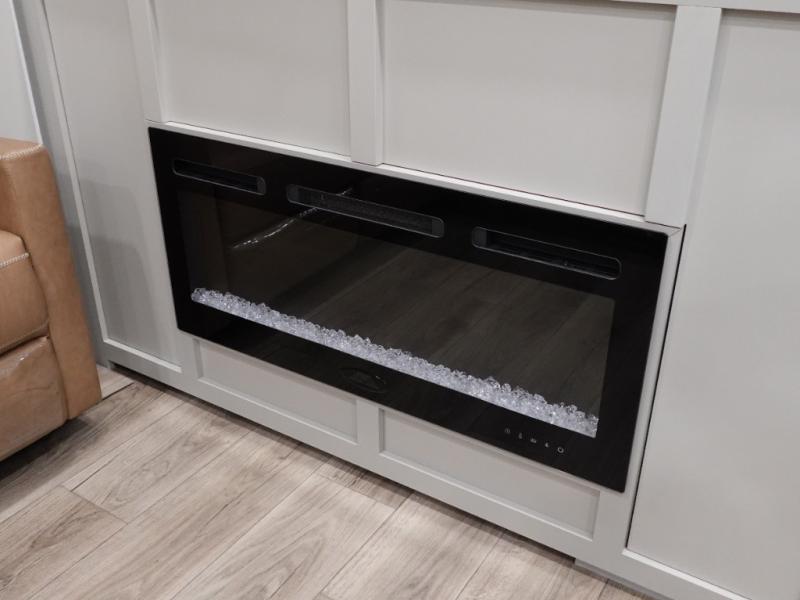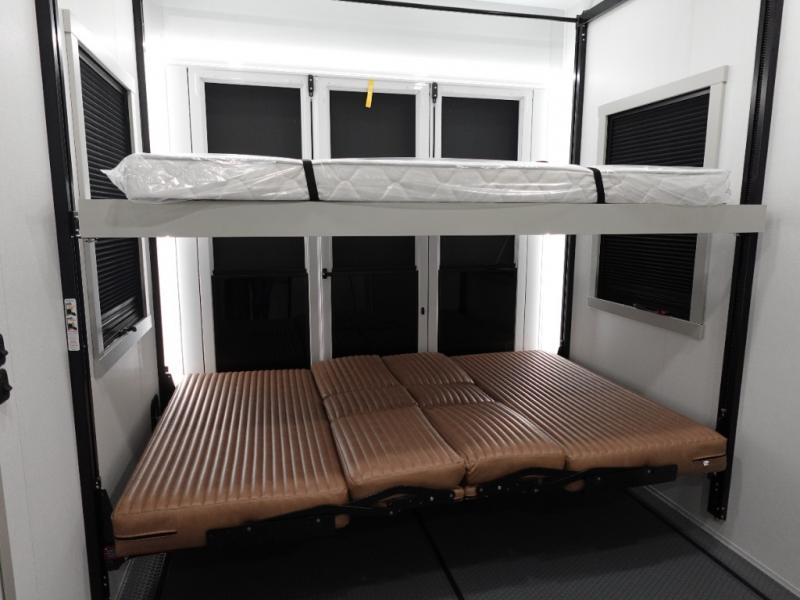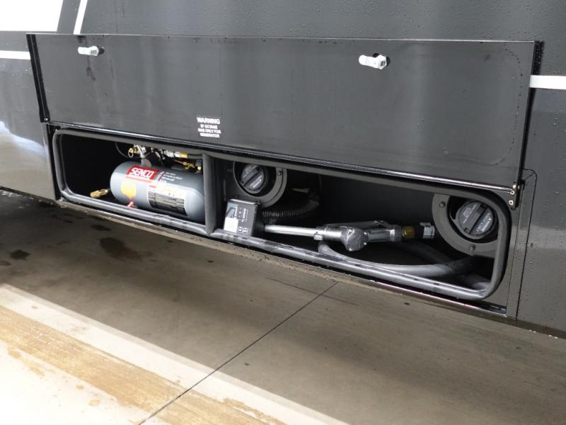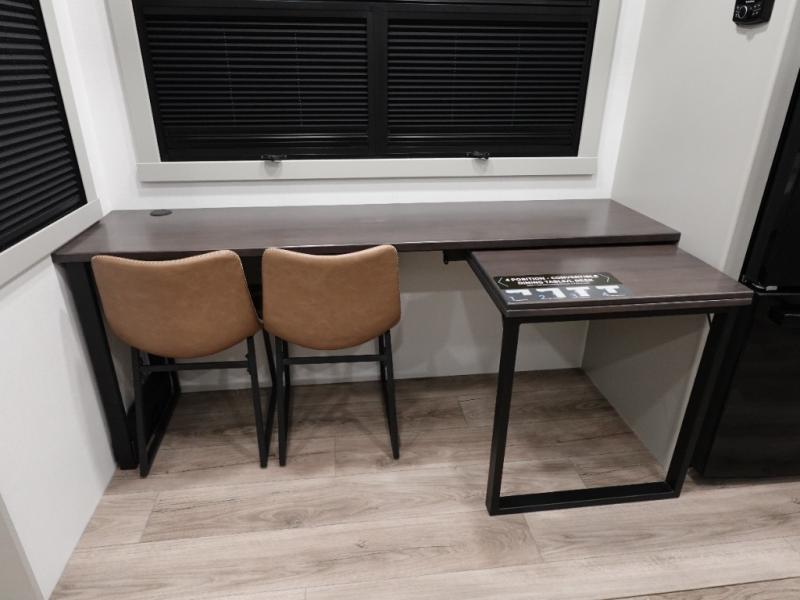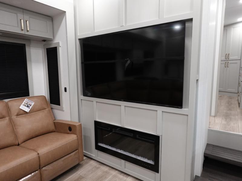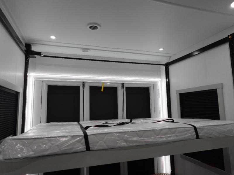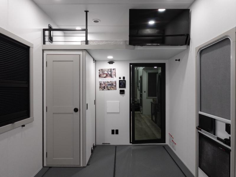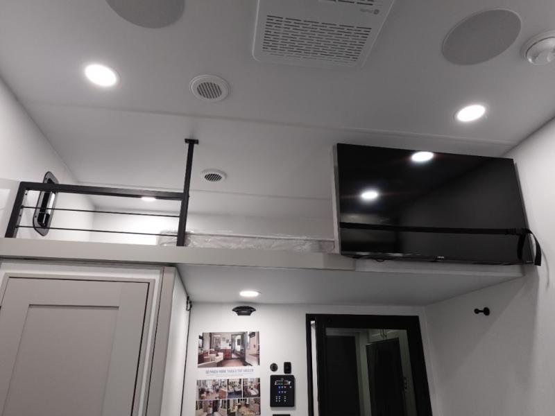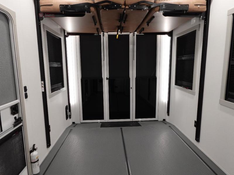 This toy hauler may just be the one you've been looking for! The garage/flex space with fold-away half bath walls will allow you to utilize the garage how you need it, plus there is an adjustable tie-down system, independent dual sofas, plus a loft for storage and a twin bed to sleep more campers! The garage patio with a 1,500 lb. capacity is another feature you are sure to love, especially with its own awning to keep you protected from the elements. Head to the kitchen to prepare meals with a 24" GE oven with a four burner range, a GE microwave with an air fryer, plus a spacious GE Energy Star 19 cu. ft. refrigerator. The island with two stools will let others visit with you while you cook, and there are even hidden dog bowls. You'll find the convertible dining table/L-desk will be accommodating since it can be use to dine at, and to get some work done. You may just find yourselves spending most of your time on the L-sofa in front of the TV and fireplace. A full bath is up front by the bedroom, and here you'll find neon shower lighting, a residential shower system, and pull-out linen storage to keep towels ready to use. After a day outdoors you'll love nothing more than coming back to your own bedroom with a king bed slide out, TV, a walk-in closet, and many more storage spaces. And we haven't even touched on the exterior features, like the 3-way pass-through storage, three power awnings, an air compressor to fill up tires, and the list goes on and on!