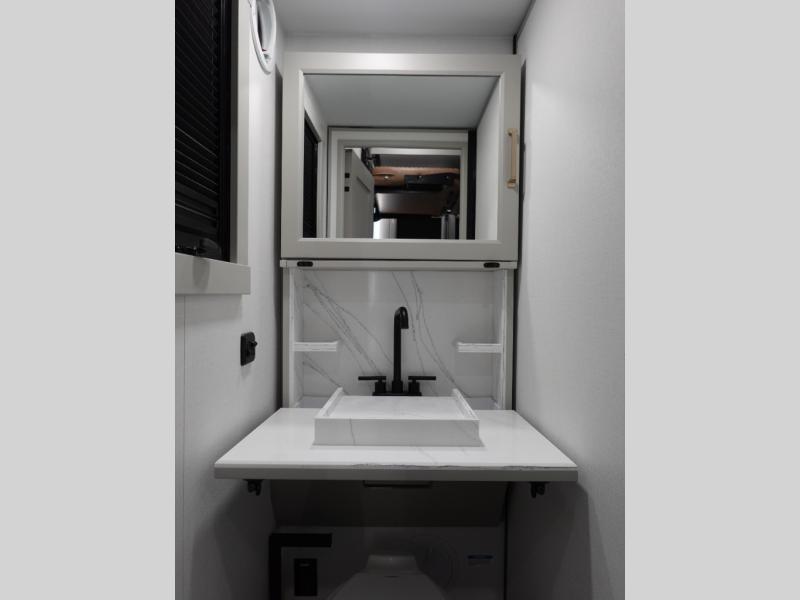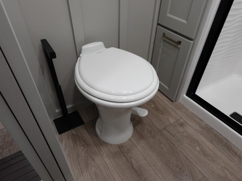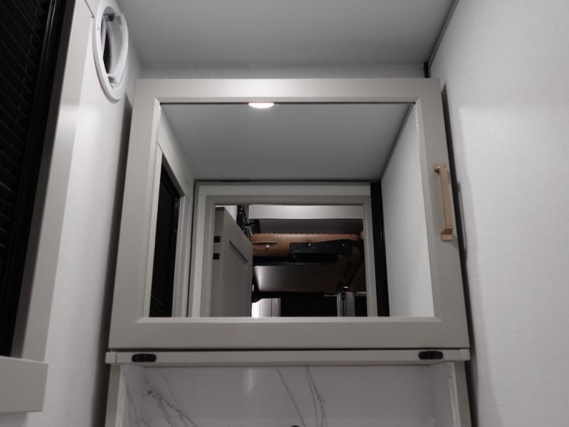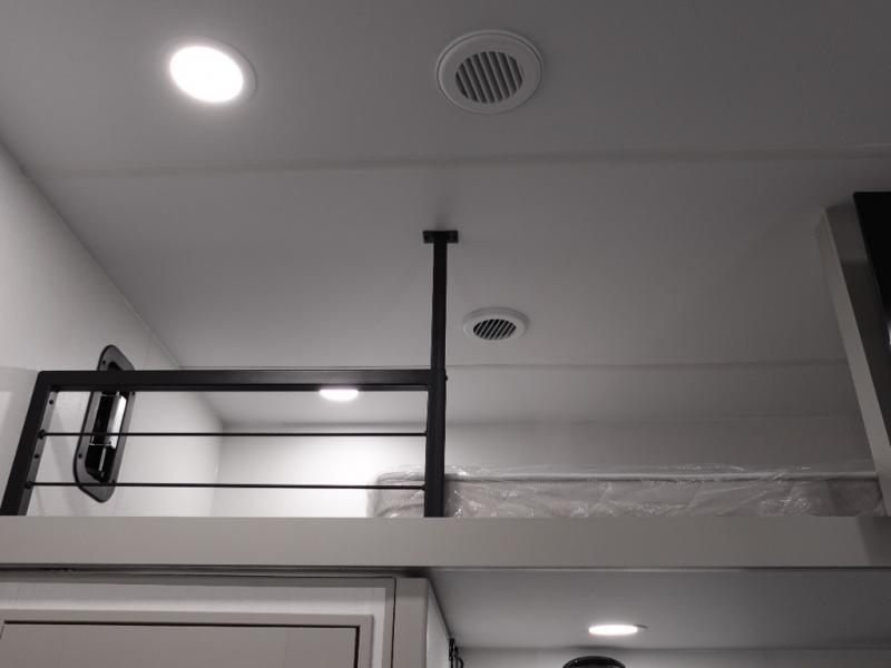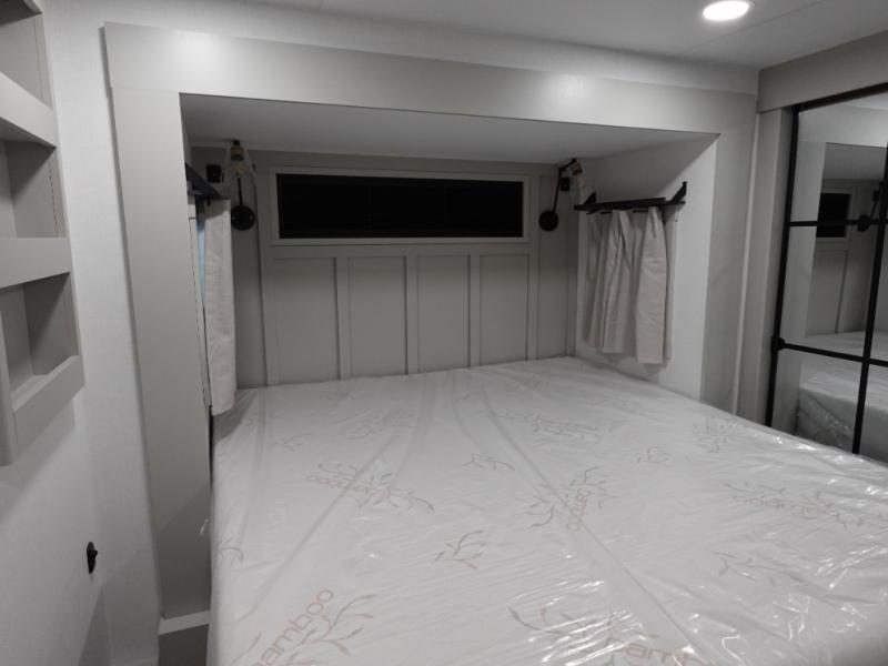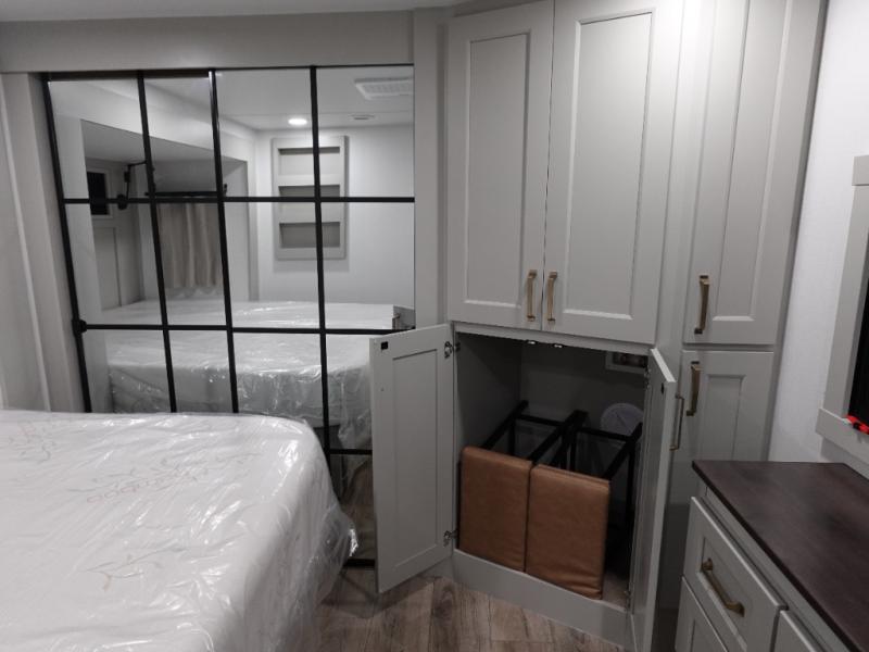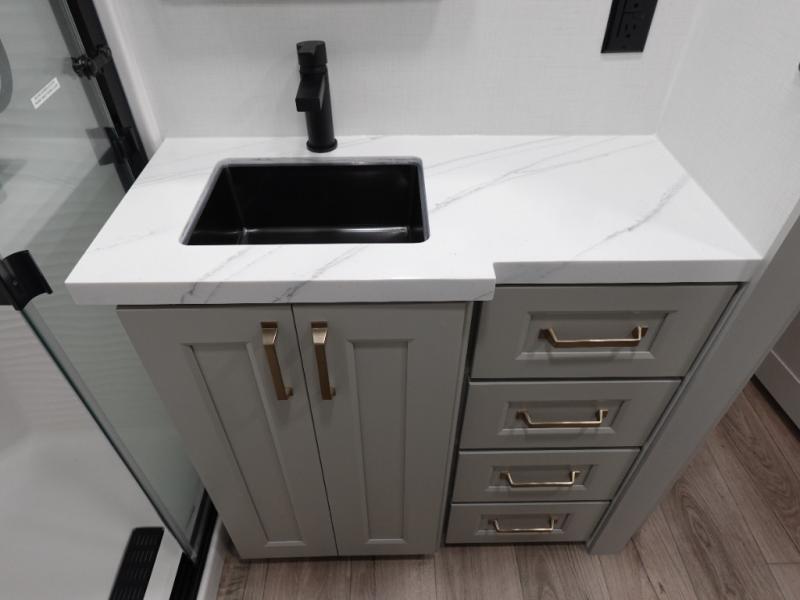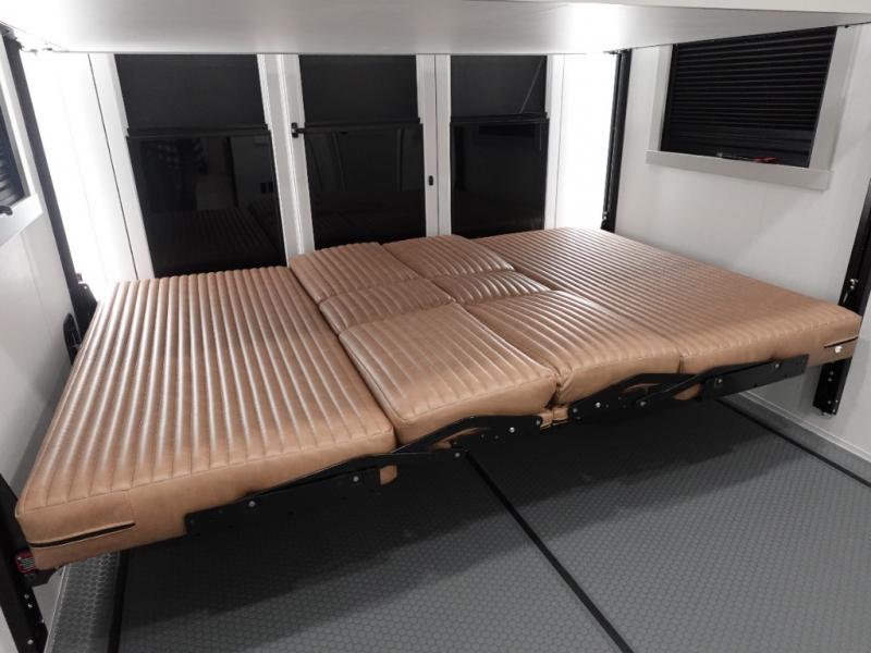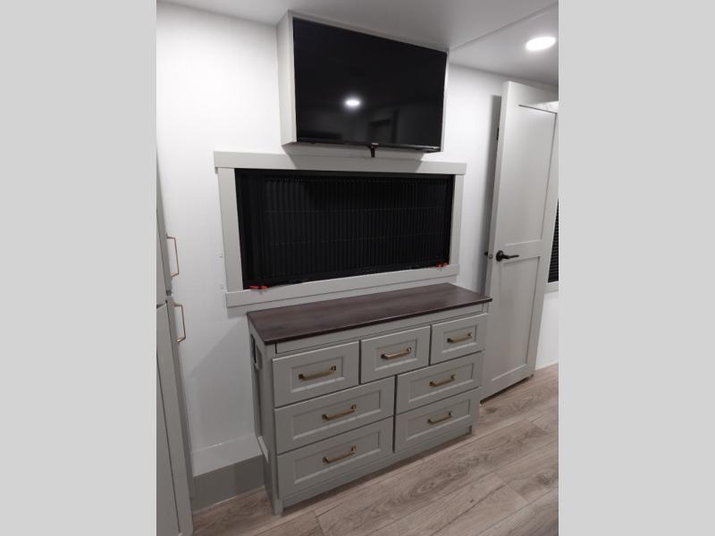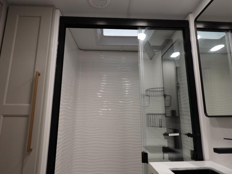 This toy hauler may just be the one you've been looking for! The garage/flex space with fold-away half bath walls will allow you to utilize the garage how you need it, plus there is an adjustable tie-down system, independent dual sofas, plus a loft for storage and a twin bed to sleep more campers! The garage patio with a 1,500 lb. capacity is another feature you are sure to love, especially with its own awning to keep you protected from the elements. Head to the kitchen to prepare meals with a 24" GE oven with a four burner range, a GE microwave with an air fryer, plus a spacious GE Energy Star 19 cu. ft. refrigerator. The island with two stools will let others visit with you while you cook, and there are even hidden dog bowls. You'll find the convertible dining table/L-desk will be accommodating since it can be use to dine at, and to get some work done. You may just find yourselves spending most of your time on the L-sofa in front of the TV and fireplace. A full bath is up front by the bedroom, and here you'll find neon shower lighting, a residential shower system, and pull-out linen storage to keep towels ready to use. After a day outdoors you'll love nothing more than coming back to your own bedroom with a king bed slide out, TV, a walk-in closet, and many more storage spaces. And we haven't even touched on the exterior features, like the 3-way pass-through storage, three power awnings, an air compressor to fill up tires, and the list goes on and on!