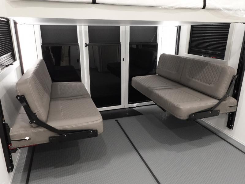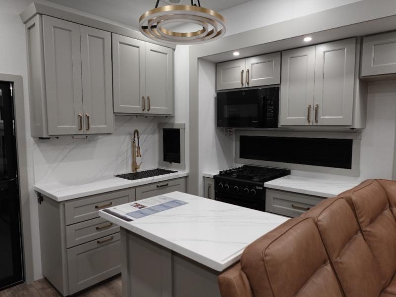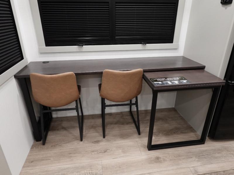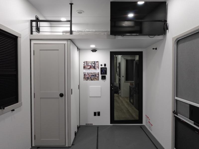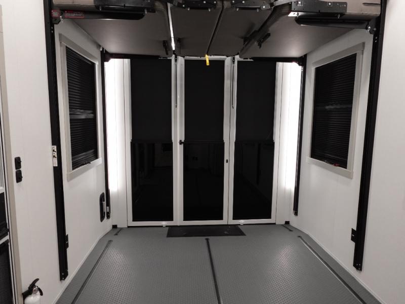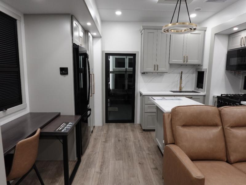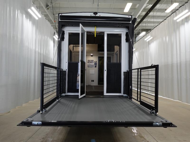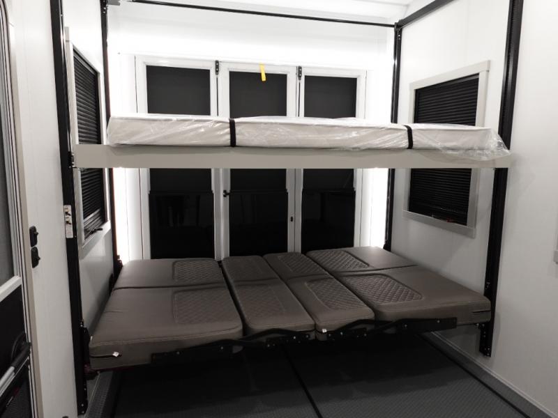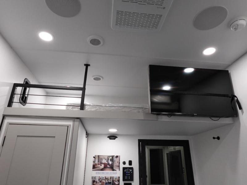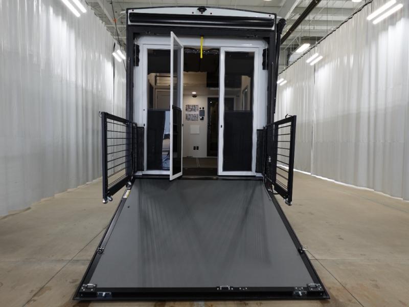 This toy hauler may just be the one you've been looking for! The garage/flex space with fold-away half bath walls will allow you to utilize the garage how you need it, plus there is an adjustable tie-down system, independent dual sofas, plus a loft for storage and a twin bed to sleep more campers! The garage patio with a 1,500 lb. capacity is another feature you are sure to love, especially with its own awning to keep you protected from the elements. Head to the kitchen to prepare meals with a 24" GE oven with a four burner range, a GE microwave with an air fryer, plus a spacious GE Energy Star 19 cu. ft. refrigerator. The island with two stools will let others visit with you while you cook, and there are even hidden dog bowls. You'll find the convertible dining table/L-desk will be accommodating since it can be use to dine at, and to get some work done. You may just find yourselves spending most of your time on the L-sofa in front of the TV and fireplace. A full bath is up front by the bedroom, and here you'll find neon shower lighting, a residential shower system, and pull-out linen storage to keep towels ready to use. After a day outdoors you'll love nothing more than coming back to your own bedroom with a king bed slide out, TV, a walk-in closet, and many more storage spaces. And we haven't even touched on the exterior features, like the 3-way pass-through storage, three power awnings, an air compressor to fill up tires, and the list goes on and on!
