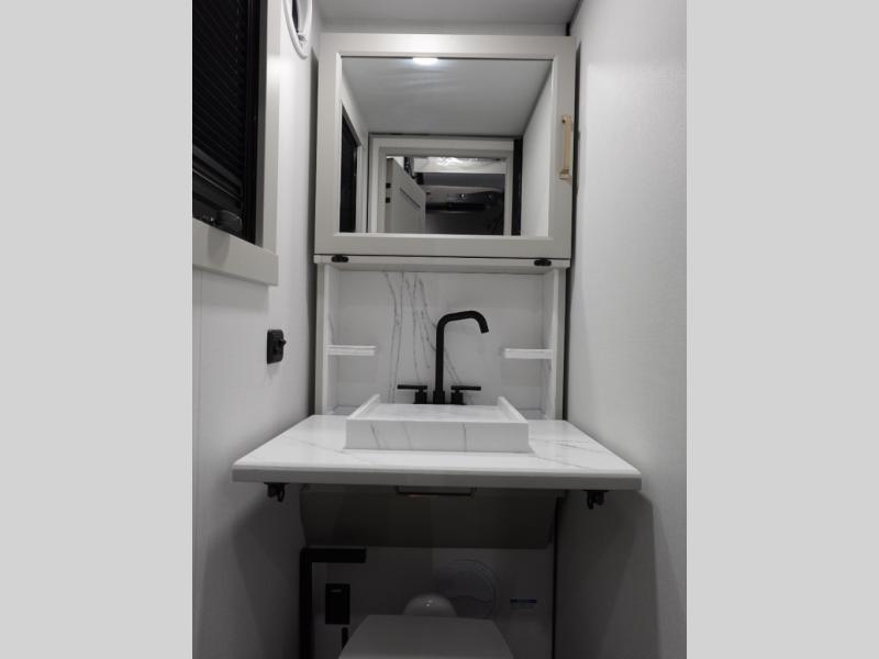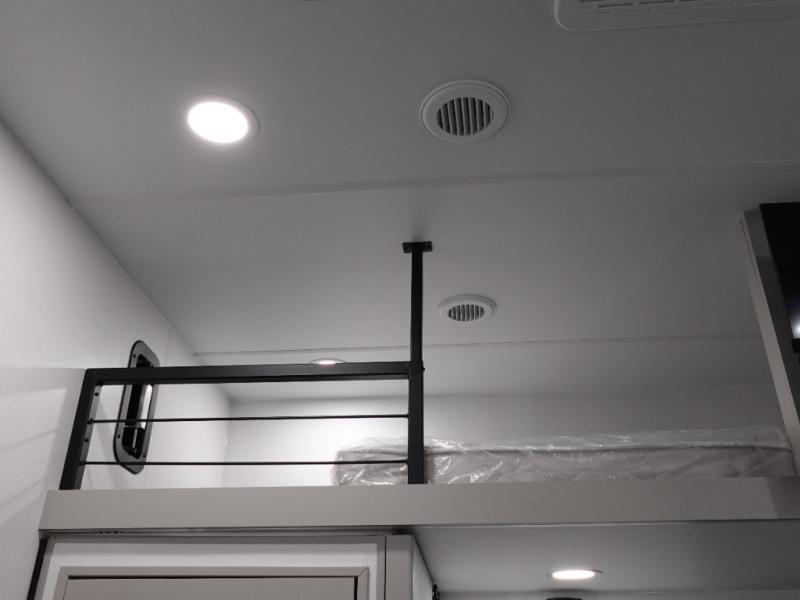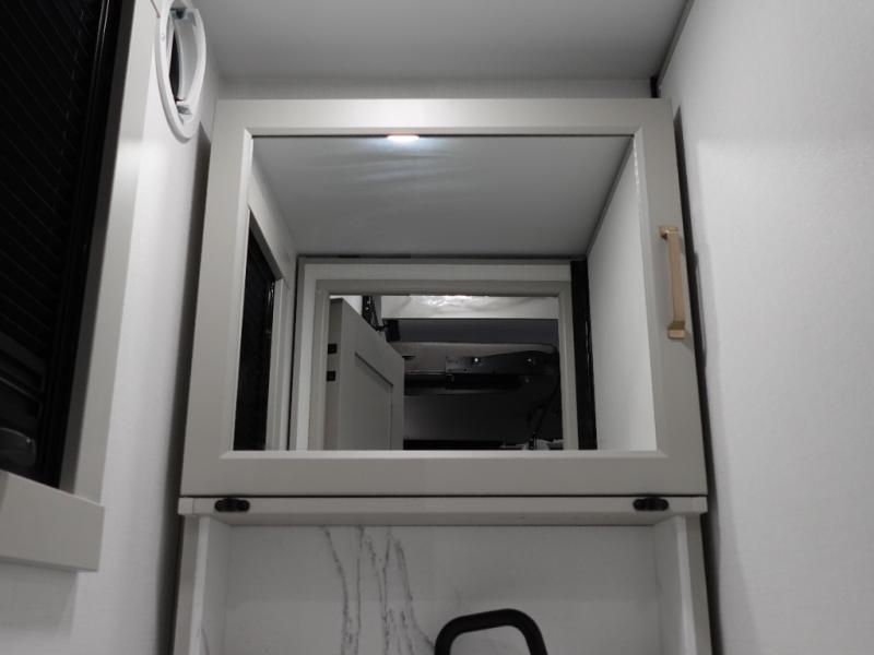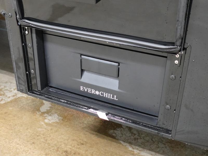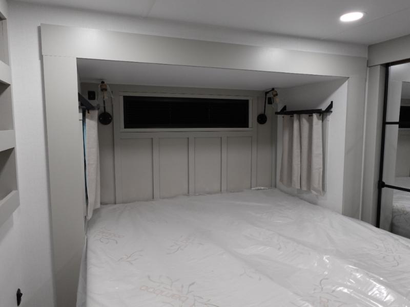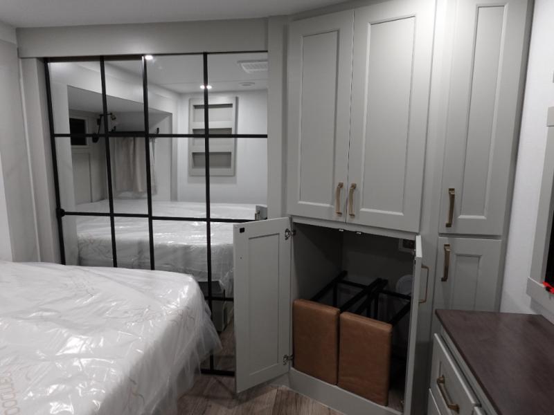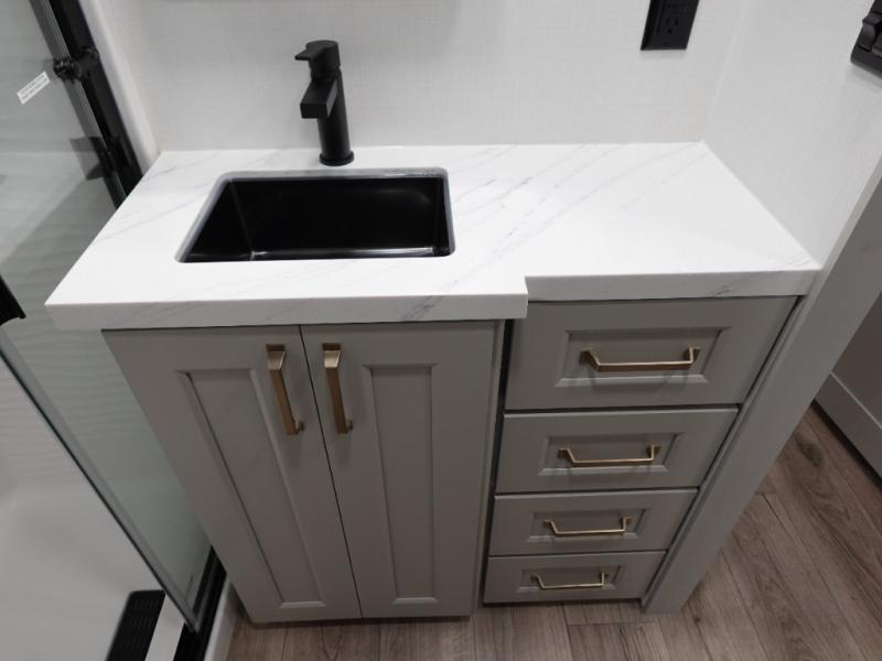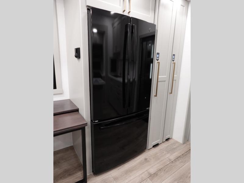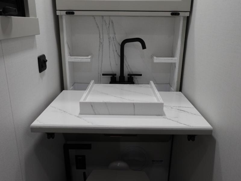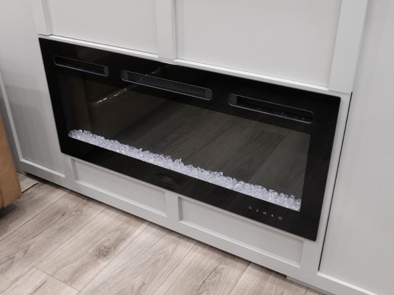 This toy hauler may just be the one you've been looking for! The garage/flex space with fold-away half bath walls will allow you to utilize the garage how you need it, plus there is an adjustable tie-down system, independent dual sofas, plus a loft for storage and a twin bed to sleep more campers! The garage patio with a 1,500 lb. capacity is another feature you are sure to love, especially with its own awning to keep you protected from the elements. Head to the kitchen to prepare meals with a 24" GE oven with a four burner range, a GE microwave with an air fryer, plus a spacious GE Energy Star 19 cu. ft. refrigerator. The island with two stools will let others visit with you while you cook, and there are even hidden dog bowls. You'll find the convertible dining table/L-desk will be accommodating since it can be use to dine at, and to get some work done. You may just find yourselves spending most of your time on the L-sofa in front of the TV and fireplace. A full bath is up front by the bedroom, and here you'll find neon shower lighting, a residential shower system, and pull-out linen storage to keep towels ready to use. After a day outdoors you'll love nothing more than coming back to your own bedroom with a king bed slide out, TV, a walk-in closet, and many more storage spaces. And we haven't even touched on the exterior features, like the 3-way pass-through storage, three power awnings, an air compressor to fill up tires, and the list goes on and on!