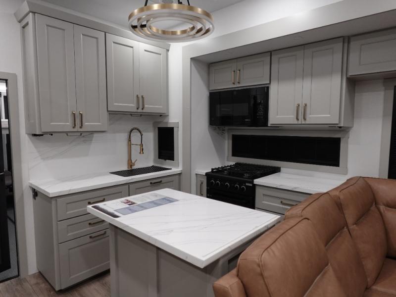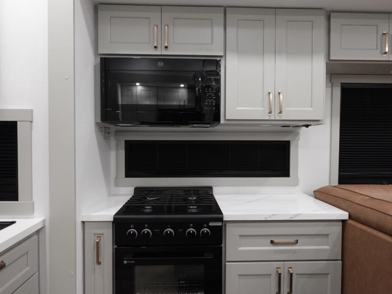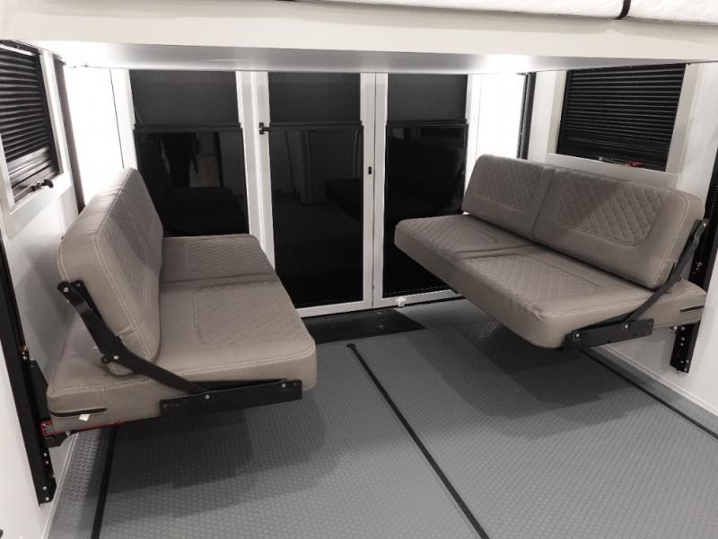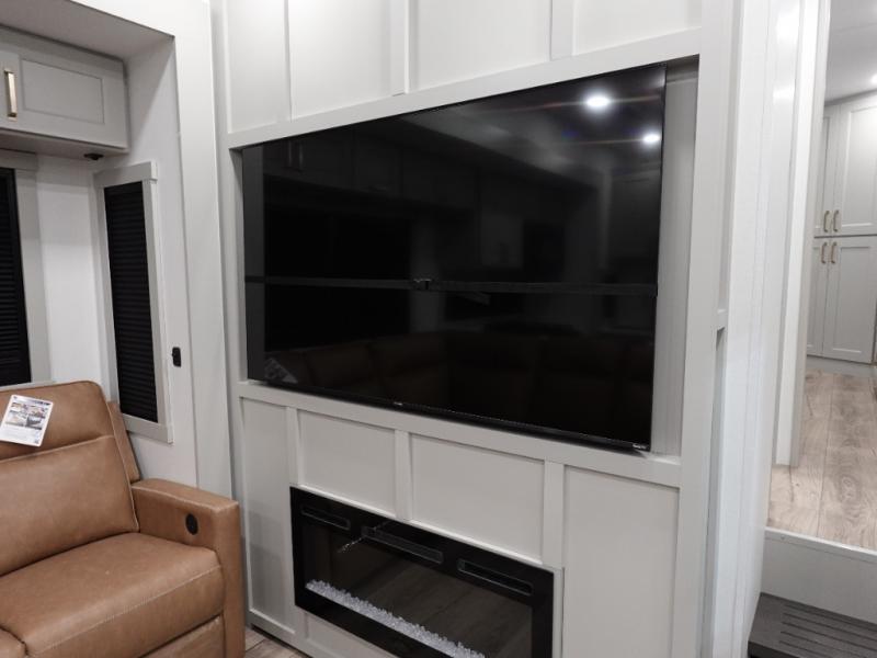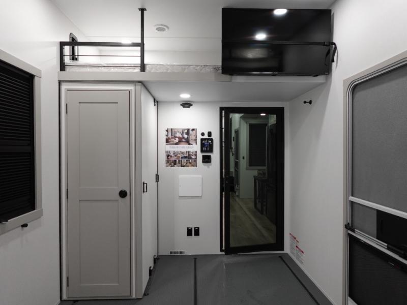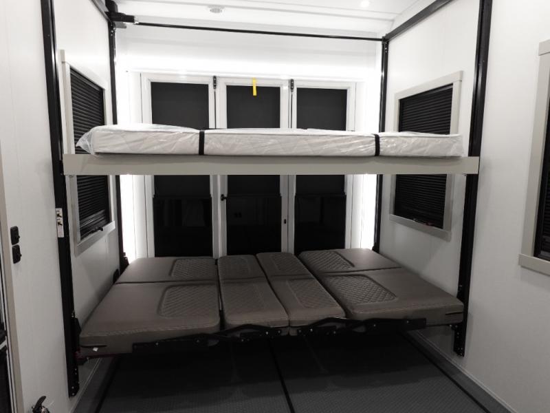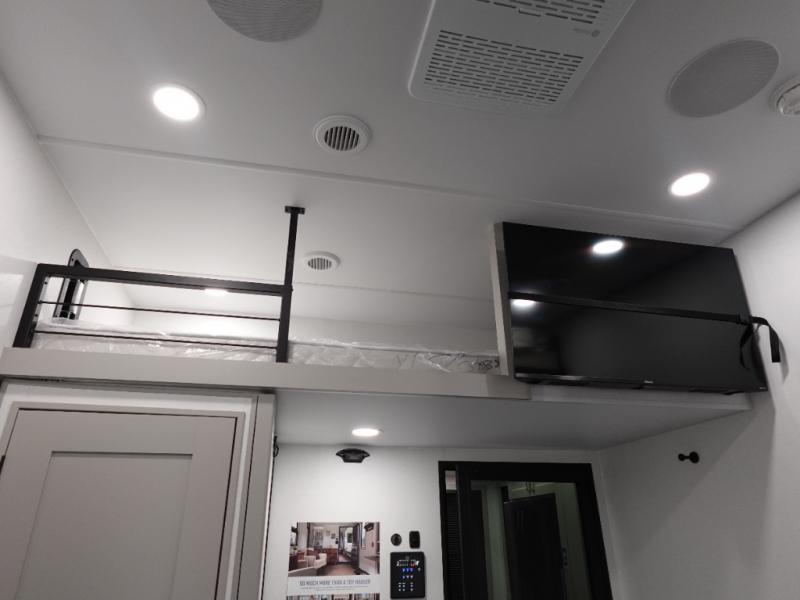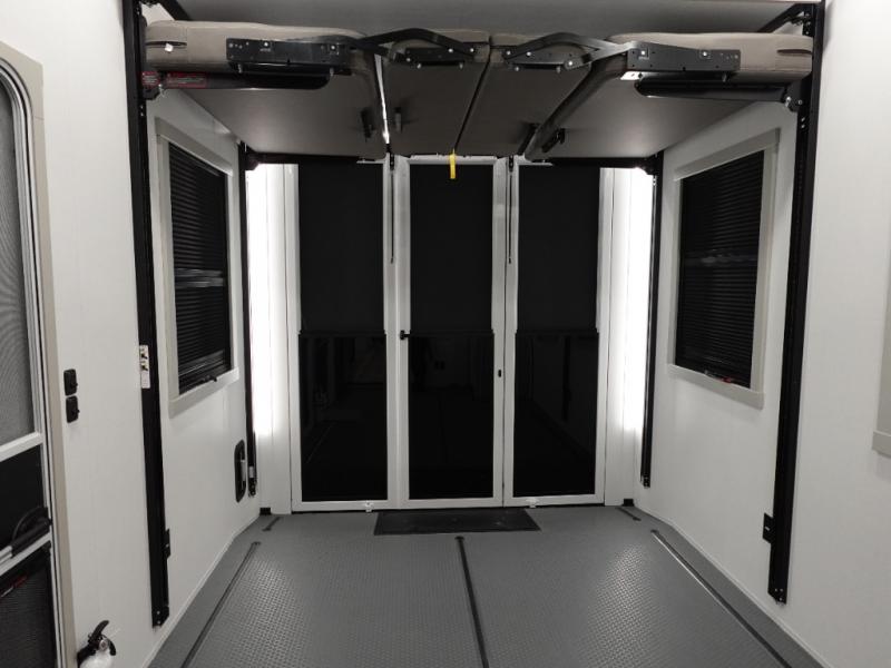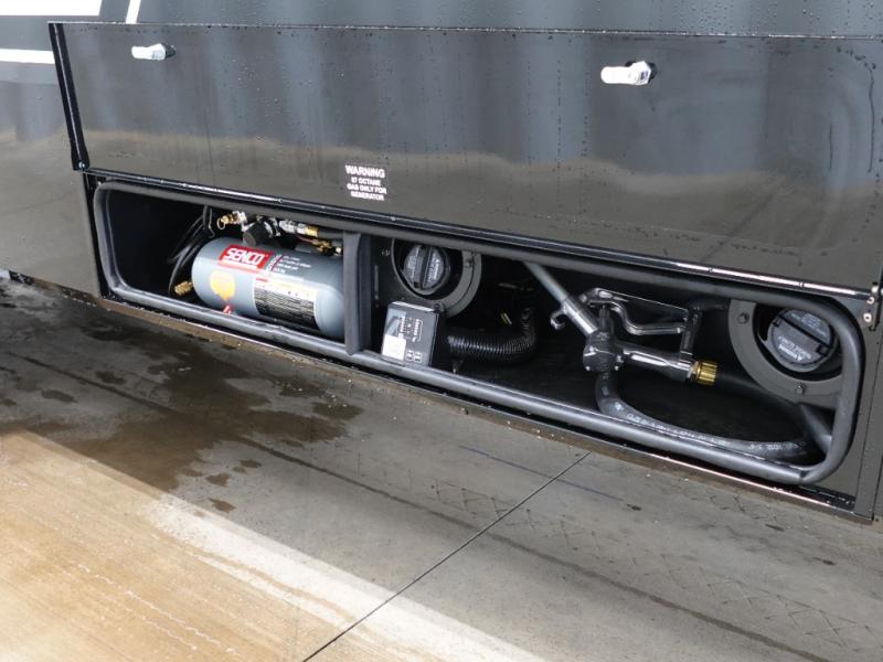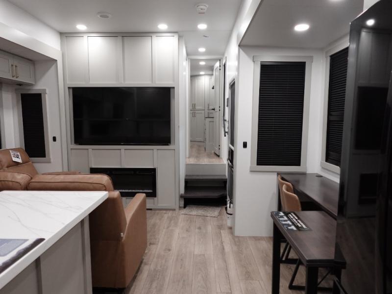 This toy hauler may just be the one you've been looking for! The garage/flex space with fold-away half bath walls will allow you to utilize the garage how you need it, plus there is an adjustable tie-down system, independent dual sofas, plus a loft for storage and a twin bed to sleep more campers! The garage patio with a 1,500 lb. capacity is another feature you are sure to love, especially with its own awning to keep you protected from the elements. Head to the kitchen to prepare meals with a 24" GE oven with a four burner range, a GE microwave with an air fryer, plus a spacious GE Energy Star 19 cu. ft. refrigerator. The island with two stools will let others visit with you while you cook, and there are even hidden dog bowls. You'll find the convertible dining table/L-desk will be accommodating since it can be use to dine at, and to get some work done. You may just find yourselves spending most of your time on the L-sofa in front of the TV and fireplace. A full bath is up front by the bedroom, and here you'll find neon shower lighting, a residential shower system, and pull-out linen storage to keep towels ready to use. After a day outdoors you'll love nothing more than coming back to your own bedroom with a king bed slide out, TV, a walk-in closet, and many more storage spaces. And we haven't even touched on the exterior features, like the 3-way pass-through storage, three power awnings, an air compressor to fill up tires, and the list goes on and on!